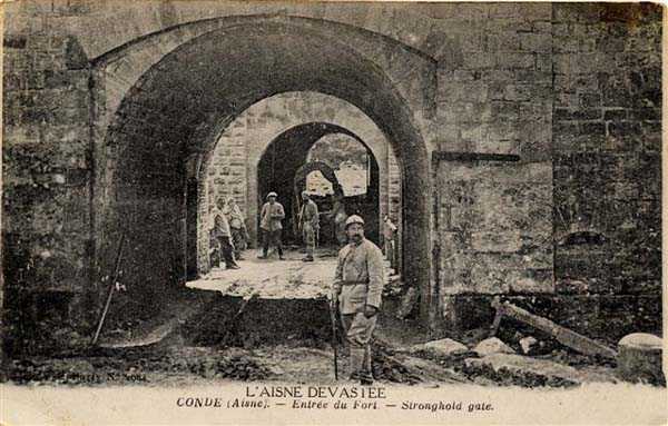 Position La Fère - Laon – Soissons, northeast of Soissons, 1877-1882. 168 m alt. 658 men including 20 officers (incl. the strength of the battery of the same name) and 38 guns distributed as follows: 10 for flanking, 2 under armored casemates, 6 mortars, 2 for indirect fire and 18 for the rampart. Named fort Pille. With the fort of La Malmaison, it ensured the liaison between Laon and Soissons with the specific mission to enfilade the valleys of the Aisne and the Vesle as well as to sweep their confluence. Its shape is that of an irregular trapezoid with a re-entrant angle at the gorge. This angle is occupied by a double caponier whose, unusual configuration, the two faces join in an obtuse angle. Its ditches, dry, are bordered by a counterscarp with relieving arches and a detached scarp. Their flanking, besides the double caponier just mentioned, is ensured by a second at salient II and a flanking battery at salient III. But let's start with the access to the fort. In front of the entrance, capping the counterscarp, is a ravelin whose interior wall is lined. To avoid enfilade fire, the access pierced in the ravelin is oblique. Curiously, the building which housed the entrance on the counterscarp, building today razed, did not include embrasures taking in enfilade the piercing of the ravelin. The entrance of the fort is situated to the right of the gorge caponier. It was provided with a bridge of the Tripier system with bascule underneath. In the porch we find two guardhouses of which one, the left, communicates with the scarp flanking gallery of the gorge caponier. We must immediately dwell on these ditch defense organs so particular they are. The small embrasures flanking towards salient I are very deep, just like those of salient II flanking towards this same salient I. Let us note by way of preamble that the flanks of the caponiers oriented to sweep salients III and IV are also provided with small embrasures, but clearly less deep. To be brief, the deep small embrasures cover the ditch in front of the embrasures, which is not the case for the other small embrasures. Manifestly, the guns advanced by the deep embrasures, thus all aimed at salient I, were protected only by a simple parapet of masonry in front of which a glacis of beaten earth had been arranged up to the vertical of the ditch. Probably around 1885, year when identical works were programmed for the fort of Montbérault, these parapets were surmounted by a crenellated masonry ensuring the junction parapet/vault. Here, it was realized summarily in the gorge caponier, but not in that of salient II, unless this reinforcement was destroyed. The two deep small embrasures are separated by a partition wall whose foot comprises two arches whose opening, failing to abolish, diminishes the dead angles at the bottom of the ditch. The flanking of this bottom must consequently be effected from the same level as the arches. The keystone of these being more or less at the level of the floor of the gun chambers, it was necessary to arrange lower embrasures. Henceforth, each caponier comprises two descending stairs (only one for the flanking battery) located in the caponier itself, in the prolongation of the scarp wall. This stair serves two small foot embrasures allowing to sweep as best as possible the ditch under or in front of the embrasures. The proper scarp flanking gallery is devoid of foot embrasures and begins its line of horizontal embrasures at about 2.5 to 3 m higher than the bottom of the ditches. Only the flanking battery is devoid of orillon. Each of these orillons comprises a postern giving face to the scarp, postern walled up on 2/3 of its height. Globally, the masonry is quite careful. The projectile magazine occupying the center of the double caponier has lost its light partitions that one only locates on plan. The succession of the 19 crenellated loges of the flanking gallery of the flanks of the double caponier of salient II allows for its part pretty shots. The flanking battery salient III has, itself, the particularity of being reached by a very short and curved shaft. A last word on these caponiers by evoking the ventilation chimneys. If the flanks of the gorge caponier comprise one above each gun chamber, the flanking battery of salient III and the flank of the double caponier of salient II enfilading the head front comprise a third, narrower and not detectable from the interior, raised between the two others. Let's return to the entrance porch. Beyond the guardhouses, on either side, are the recesses of the helical stairs which gave access to traverse no.1 which caps the entrance tunnel. The end of this traverse houses the first of the two optical posts of the fort. The latter comprises two parallel embrasures. The left one, wider, is advanced by a masonry support for the apparatus. The right one, narrower should probably only serve for reception. This configuration has been spotted elsewhere in France only at the fort of Mayot. According to the bibliography, this post communicated, by means of a slight lateral play, with Soissons and the fort of Domont in Paris. The entrance porch passed, one arrives in a first courtyard opposite a second tunnel where the rampart street begins. Traverse no. 17 is situated to the right of this courtyard. Between it and the debouchment of the rampart street, was the officers' barracks, now destroyed. To reach the troops' barracks, one should take the tunnel passage on the left, passage also giving access to the smaller of the two powder magazines. The second is installed parallel, opposite the main barracks. Both have their entrance airlock preceded by a hall or antechamber, but it is on the ceiling of the airlock itself that one discovers a specificity proper to Condé-sur-Aisne. Usually, the light shaft comprises a curb on which one rested planks that one overloaded with earth in case of conflict. This curb is located above the window surmounting the door of the storage room. 