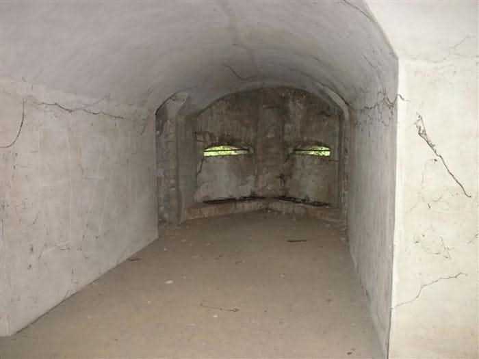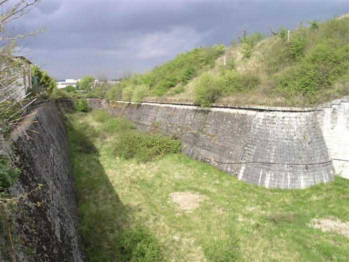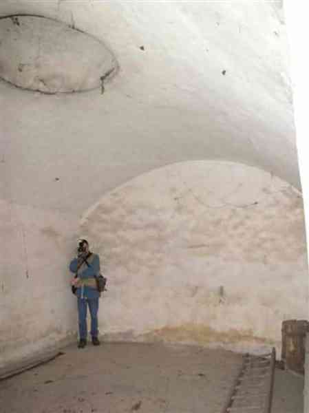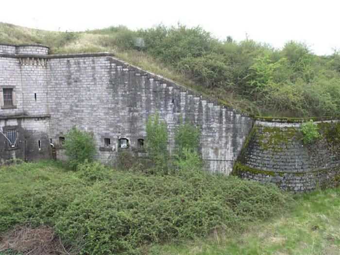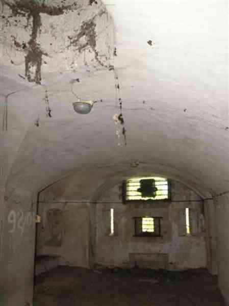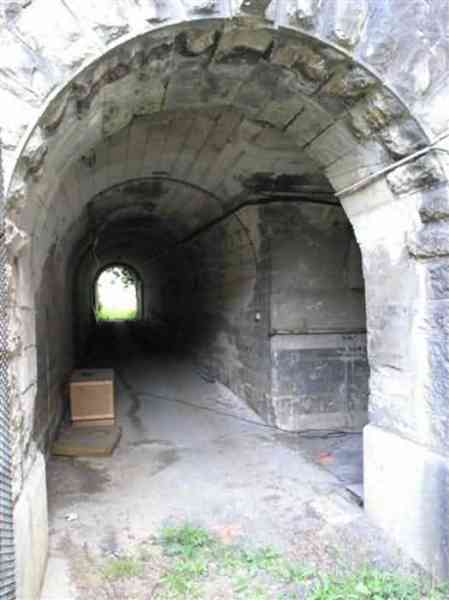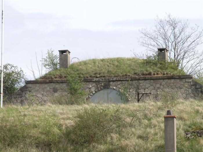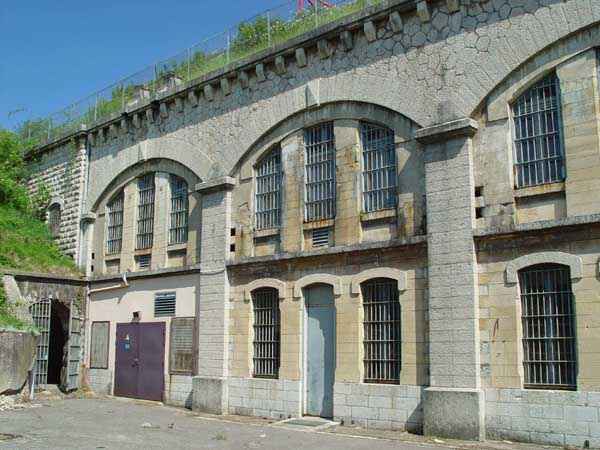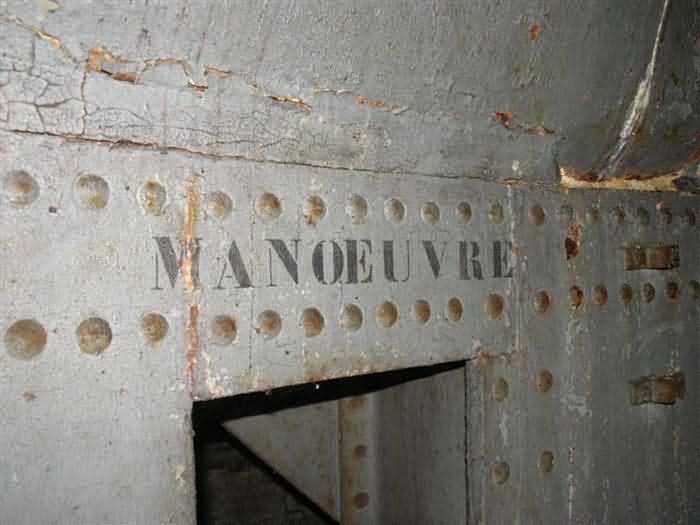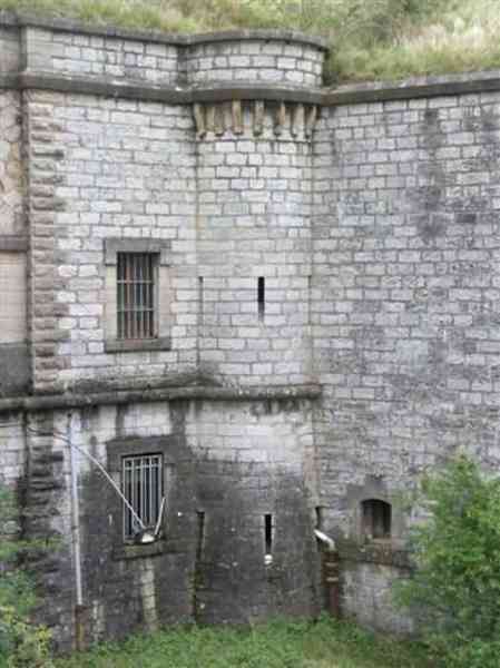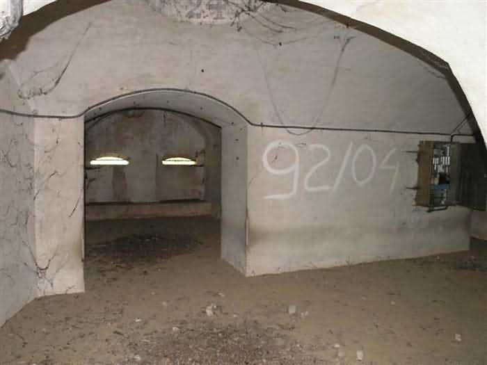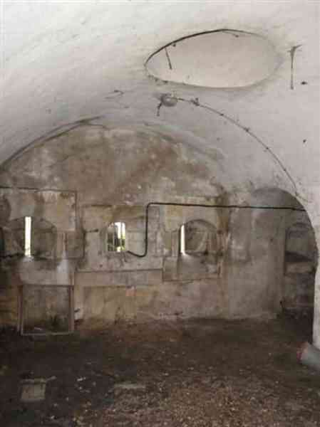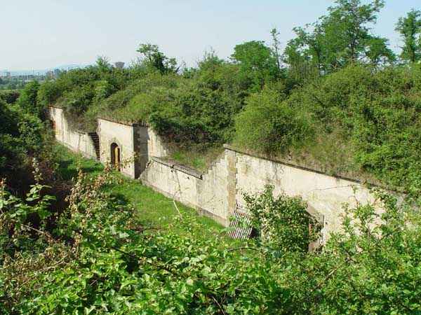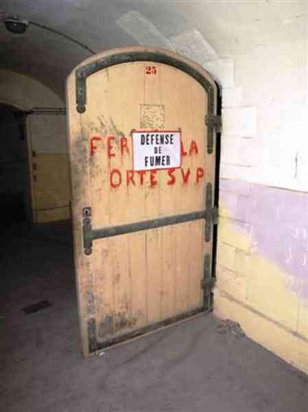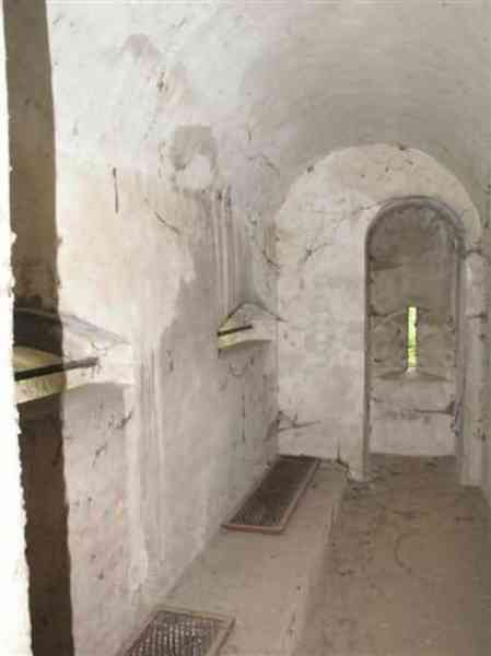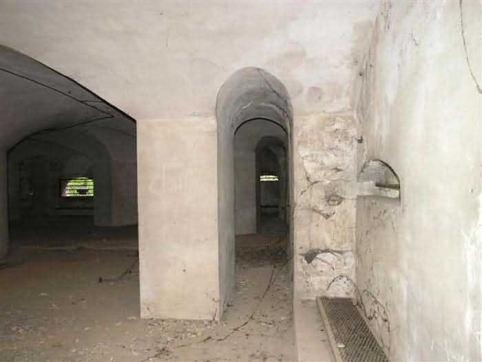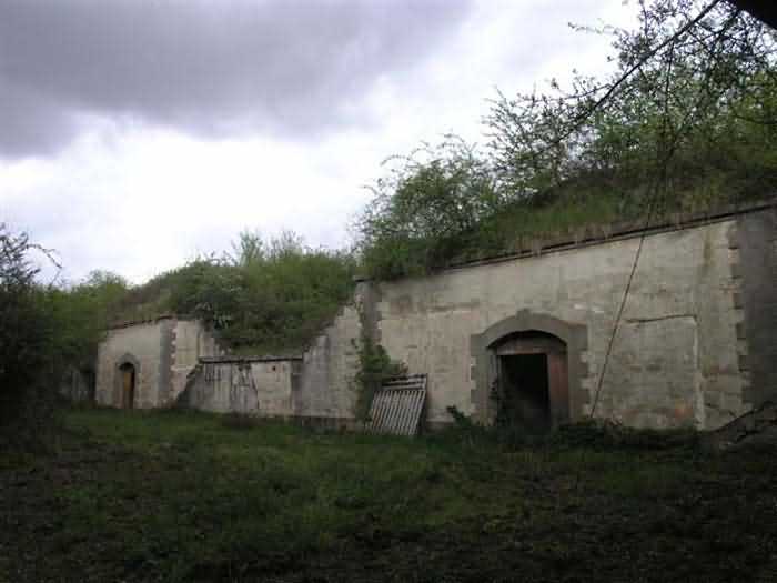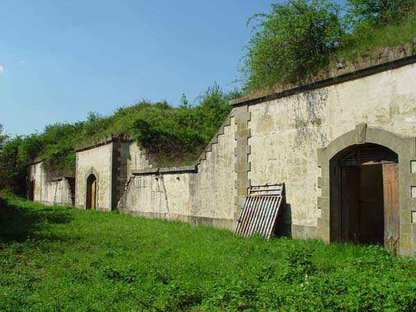Fortress of Lyon, south-south-east of the city, 1878-1880. 210 m/alt. 164 men. Irregular quadrilateral with re-entrant gorge, Fort Corbas occupies a rather restricted area. On this surface, it concentrates a not insignificant sum of points of interest and specificities for the amateur. A covered way follows the perimeter of the counterscarp, except at salient II where it encircles an excrescence of a few tens of metres where two solid traverses are located and at the centre of front III-IV where an infantry bonnet has been arranged. The gorge is also preceded by a ravelin on the glacis. The scarp and counterscarp walls, mostly in concrete, have a pronounced batter, but nevertheless less than at Feyzin. The fixed bridge still rests on the original metal pillars. The entrance is original and very pretty with towers occupying the internal angles of the gorge front curtain. The entrance building is also worth seeing for its basement and mezzanine. The defensive coffres have a very great depth (7 x 4 m), their blind spots are swept from the foot of the corner towers and a conical shaft in their vault must have contributed to their ventilation. A stair-ramp serves each coffre. The one of the right coffre is surmounted by a strange metal tank covering the entire vault and parallel to the first flight of steps as well as the first landing. Of the bascule bridge underneath, few vestiges remain and the shaft, lacking a curbstone, covered with a simple stone plug, opens in the floor of the lower level where the washbasins are still found. The mezzanine is occupied by the remarkably preserved disciplinary rooms, with doors and locks, as well as by the officers' kitchen and the provision store. It should be noted that the vast majority of door frames and panels indicating the function of the rooms are in place. The rather small courtyard precedes the barracks of five bays on two levels transformed over the course of occupations. Nevertheless, the ventilation device of the quarters on the first floor appears in two double small openings on either side of the projection of the piers. The same thing existed on the ground floor but has been blocked up. We do not know of any other fort where one can see a similar arrangement. On either side of the courtyard, a tunnel passage leads towards the rampart street. The left one runs alongside the powder magazine, which is installed perpendicularly on the left of the passage. Rarely, the ventilated voids are discernible in this passage thanks to two basement windows. The lattice doors still bar the lateral galleries in which the usual angular loopholes are replaced by oblique conduits (nine per flank, directed downwards) of 14 cm diameter (also a unique case). The entrance door of the airlock comprises the three locks that are usually found on the outer door of the storage room. This outer door has, here, all its bronze hardware and has preserved its lock which, at 14 x 10 cm is smaller than usual (225 x 113 mm). The inner door is no longer there, but a bronze strap caged the bolt of the lock and hinges of the same metal testify to its past presence. The left lateral gallery ends with a staircase surmounted by a shaft with its armour in place. The staircase descends towards the ventilated voids and there, we find the concrete with which the forts of Lyon are accustomed. A third ventilated void runs under the right lateral gallery. The rampart street, running behind fronts I-II, II-III and III-IV, comprises three shelter-traverses per front. Three traverses are rooted, namely the central one of the head front and those behind salients II and III which, in addition, house the descent galleries towards the caponiers. We must note for accuracy that the traverse behind salient II has no shelter body, the space taken by the substructures of the turret being too cumbersome. This gives us a total of eleven hollow traverses, ten of which with a shelter/magazine. These traverses are covered on the facade with a cement plaster, have for the most part retained their door frames (double-leaf doors surmounted by fixed shutters) and one accesses the firing platforms via stairs originating in a rounded return of their facade. Externally, the double caponier at salient II is almost square. Its access gallery nevertheless emerges into an arc of a circle formed by piers separating the firing chambers, two per flank. The 12 calibre breech-loading guns were placed as they should be on the counterscarp side and the embrasure oriented towards salient III has preserved its wooden sliding obturator shutter. The angle at the junction of the flanks includes a triangular projection provided with loopholes to protect the exterior of these flanks. The wing at salient III has nothing particular except that one accesses the shelter traverse of this salient from the gallery and a staircase and that the concrete is clearly apparent in the rooted passage. Onto the rampart street also open Turkish latrines, the doors of whose cubicles have retained a handle to help visitors get up. Although, as we have just read, the fort is already worthy of interest as it is, we must come to the essential: the Mougin turret Mle 1876 for two 155 L de Bange guns, installed in 1883. This turret, as we have already mentioned, surmounts the access gallery to the double caponier. Certainly the guns have disappeared, but for the rest it is in its original state. Among those we have visited, it retains a special place. Numerous door frames, including tool boards behind the guns, with inexplicable sieves, were only seen there. In the firing chamber, the place of everyone is indicated in full words: ammunition passer, loader, gun captain…. Another inscription, with the same characters, indicates that it was overhauled on 22- ??-3?. The grey colour, as one only encounters in the fortress of Toul, is still everywhere apparent on a background of orange red lead. The embrasures have been walled up and the rotation device has