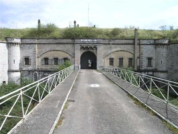 Festung von Lyon, südsüdöstlich der Stadt, 1878-1880. 210 M/ü M. 164 Mann. Unregelmäßiges Viereck mit einspringender Kehle, das Fort Corbas nimmt eine eher begrenzte Fläche ein. Auf dieser Fläche konzentriert es eine nicht unerhebliche Summe an Interessantem und Besonderheiten für den Liebhaber. Ein gedeckter Weg folgt dem Umfang der Kontereskarpe, außer am Saillant II, wo er einen Auswuchs von einigen Dutzend Metern umschließt, in dem sich zwei massive Traversen befinden, und in der Mitte der Front III-IV, wo eine Infanterie-Bonnette eingerichtet wurde. Der Kehle geht ebenfalls ein Ravelin auf dem Glacis voraus. Die Escarpen- und Kontereskarpenmauern, größtenteils aus Beton, haben ein starkes Abflachen, jedoch geringer als in Feyzin. Die feste Brücke ruht noch auf den originalen Metallpfeilern. Der Eingang ist originell und sehr hübsch mit Türmen, die die inneren Winkel der Kurtine der Kehlfront einnehmen. Das Eingangsgebäude ist auch wegen seines Kellers und seines Mezzanins bemerkenswert. Die Verteidigungskoffer haben eine sehr große Tiefe (7 x 4 m), ihre toten Winkel werden vom Fuß der Ecktürme bestrichen und ein konischer Schacht in ihrem Gewölbe sollte zu ihrer Belüftung beitragen. Eine Treppenrampe erschließt jeden Koffer. Der des rechten Koffers wird von einem seltsamen Metallbehälter überwölbt, der das gesamte Gewölbe abdeckt und parallel zum ersten Treppenlauf sowie zum ersten Absatz verläuft. Von der darunter liegenden Wippbrücke sind nur wenige Überreste erhalten und der Schacht, ohne Brüstung, mit einem einfachen Steinpfropfen bedeckt, öffnet sich im Boden des unteren Levels, wo noch die Waschbecken zu finden sind. Das Mezzanin ist von den erstaunlich gut erhaltenen Disziplinarräumen mit Türen und Schlössern sowie von der Offiziersküche und dem Proviantlager belegt. Es ist festzuhalten, dass die überwiegende Mehrheit der Türzargen und Schilder, die die Funktion der Räume angeben, vorhanden ist. Der recht kleine Hof geht der Unterkunft von fünf Jochen auf zwei Ebenen voraus, die im Laufe der Besetzungen umgewandelt wurden. Dennoch erscheint die Belüftungsvorrichtung der Stuben im ersten Stock in zwei doppelten kleinen Öffnungen zu beiden Seiten des Pfeilervorsprungs. Das Gleiche existierte im Erdgeschoss, wurde aber verschlossen. Wir kennen kein anderes Fort, wo man eine ähnliche Anordnung sehen kann. Zu beiden Seiten des Hofes führt ein Tunnelgang zur Wallstraße. Der linke verläuft entlang des Pulvermagazins, das senkrecht auf der linken Seite des Ganges installiert ist. Selten sind die belüfteten Hohlräume in diesem Gang anhand von zwei Kellerfenstern erkennbar. Die Gittertüren versperren noch die seitlichen Galerien, in denen die üblichen eckigen Schießscharten durch schräge Kanäle (neun pro Seite, nach unten gerichtet) mit einem Durchmesser von 14 cm ersetzt sind (ebenfalls ein einzigartiger Fall). Die Eingangstür der Schleuse enthält die drei Schlösser, die man normalerweise an der Außentür des Lagerraums findet. Diese Außentür hat hier ihre gesamte Bronzebeschläge und ihr Schloss erhalten, das mit 14 x 10 cm kleiner ist als üblich (225 x 113 mm). Die Innentür ist nicht mehr da, aber eine Bronzeöse hielt den Riegel des Schlosses gefangen, und Angeln aus demselben Metall zeugen von ihrer früheren Anwesenheit. Der linke seitliche Gang endet mit einer Treppe, über der sich ein Schacht mit noch vorhandener Panzerung befindet. Die Treppe führt hinab zu den belüfteten Hohlräumen, und dort finden wir den Beton wieder, der für die Forts von Lyon üblich ist. Ein dritter belüfteter Hohlraum verläuft unter dem rechten seitlichen Gang. Die Wallstraße, die hinter den Fronten I-II, II-III und III-IV verläuft, umfasst drei Traversenunterstände pro Front. Drei Traversen sind eingewurzelt, nämlich die zentrale der Stirnfront und diejenigen hinter den Saillants II und III, die zudem die Gänge zum Abstieg zu den Kaponnieren beherbergen. Wir müssen der Genauigkeit halber angeben, dass die Traverse hinter Saillant II keinen Unterkunftskörper hat, da der von den Substrukturen des Turms eingenommene Platz zu beengend ist. Das ergibt insgesamt elf hohle Traversen, davon zehn mit einem Unterkunfts-/Magazinteil. Diese Traversen sind an der Fassade mit einem Zementputz überzogen, haben größtenteils ihre Türzargen (zweiflügelige Türen mit festen Jalousien darüber) erhalten, und man gelangt über Treppen auf die Schießplattformen, die in einer abgerundeten Rückbiegung ihrer Fassade entspringen. Äußerlich ist die Doppelkaponniere am Saillant II fast quadratisch. Ihr Zugangsgang mündet dennoch in einem Kreisbogen, der von Pfeilern gebildet wird, die die Schießkammern in der Anzahl von zwei pro Seite trennen. Die 12-Kaliber-Hinterladerkanonen waren wie üblich an der Kontereskarpe platziert, und die Schießscharte, die zum Saillant III ausgerichtet ist, hat ihren hölzernen, gleitenden Verschlussdeckel erhalten. Der Winkel an der Verbindung der Flanken umfasst einen dreieckigen Vorsprung mit Schießscharten, um die Außenseite dieser Flanken zu schützen. Der Flügel am Saillant III hat nichts Besonderes, außer dass man von dem Gang und einer Treppe aus auf die Traversenunterkunft dieses Saillants gelangt und dass der Beton in dem eingewurzelten Durchgang deutlich sichtbar ist. An der Wallstraße liegen auch türkische Latrinen, deren Kabinentüren einen Griff behalten haben, um den Besuchern beim Aufstehen zu helfen. Obwohl, wie wir gerade gelesen haben, das Fort bereits so wie es ist von Interesse ist, müssen wir zum Wesentlichen kommen: dem Mougin-Turm Modell 1876 für zwei 155 L de Bange-Kanonen, aufgestellt 1883. Dieser Turm, wie bereits erwähnt, überragt den Zugangsgang zur Doppelkaponniere. Zwar sind die Kanonen verschwunden, aber ansonsten ist er im Originalzustand. Unter den von uns besuchten behält er einen besonderen Platz. Zahlreiche Türzargen, darunter Werkzeugbretter hinter den Kanonen, mit 