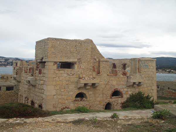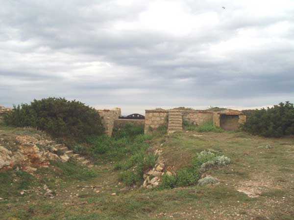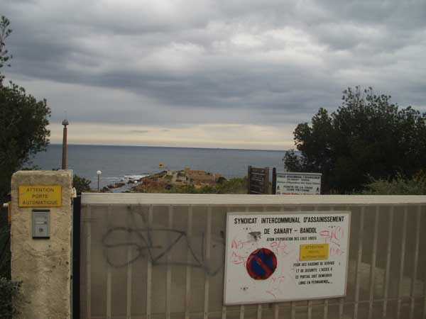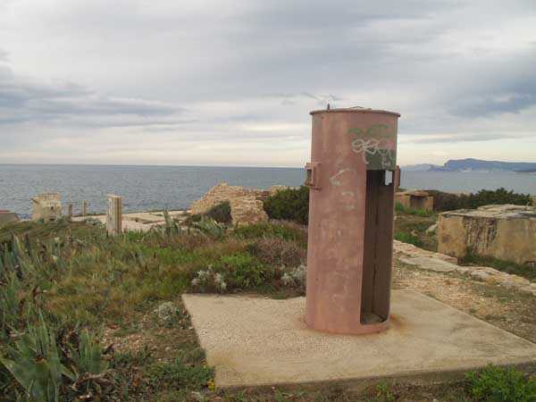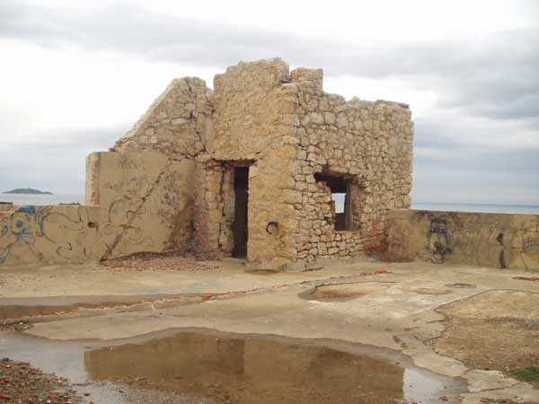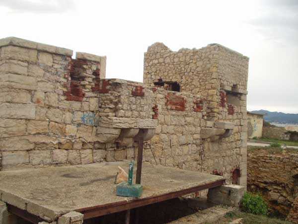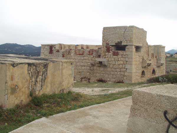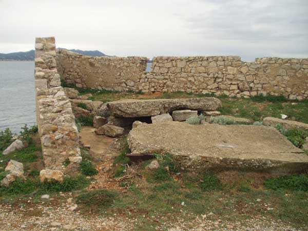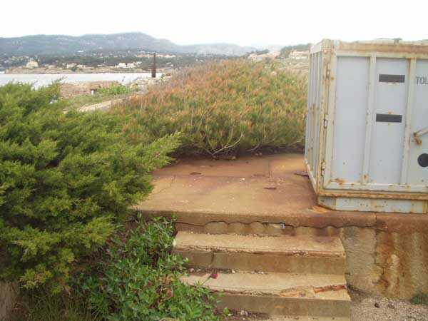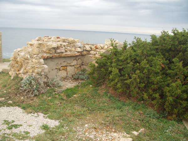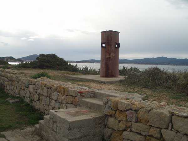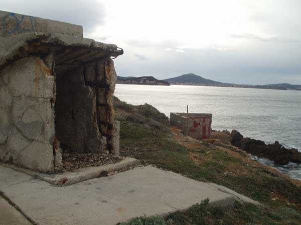 Fortress of Toulon, west of the city. 11 m/alt. Rarely mentioned coastal battery, established at the point of the same name. The position was already fortified in the 18th century and was remodeled between 1846 and 1856. Defended, in 1881, the bay of Saint-Nazaire with the batteries of Cap Nègre and Lauze, as well as the bay of Bandol to the west with the battery of Bandol. Controlling this bay would have authorized a landing that would have allowed to take the city of Toulon from the rear; a threat that was averted by the construction of the fort of Six Fours. The battery occupies a rocky point that it covers with its crenellated tower Mle 1846 no. 2 with embrasures many times modified, and an enclosure composed of a Carnot wall. Several emplacements for small or medium caliber pieces are discernible thanks to their ammunition niches, but they are in very bad condition. It did not escape the great wave of declassifications pronounced on December 3, 1888. We must mention a curiosity: in the center of the front, a strange circular metal tank (diameter ± 100 cm) surmounted by a double beam is sunk into the ground. It is framed by three thin walls, only the side facing the sea remaining free. To the rear, a covered way leads straight onto a masonry-coated slope giving access to the basement of the tower, straight into a room where engine bases remain. It could therefore be the location of a projector, but we have never seen anything similar anywhere else, so we are unable to give any interpretation. Today, the battery is a plot belonging to the municipality of Sanary which is in principle forbidden access because the risk of falling stones is real, so degraded is the tower. (04/2006).
