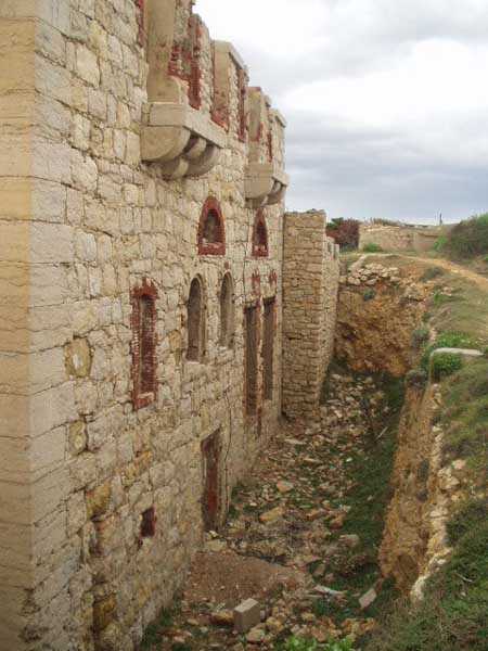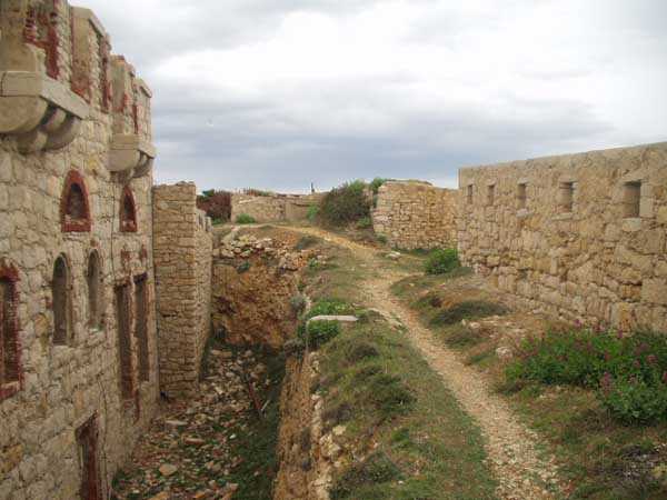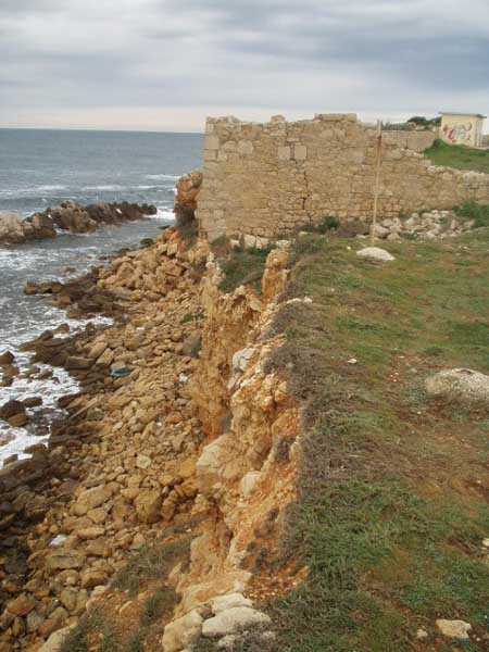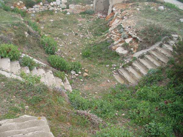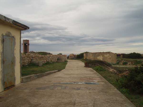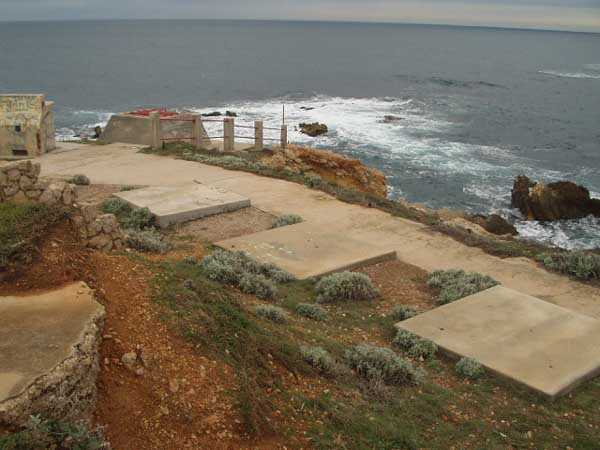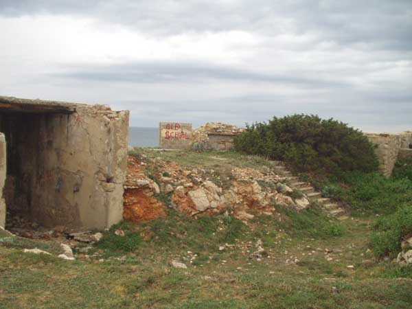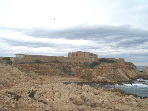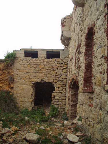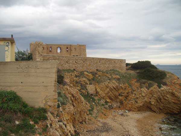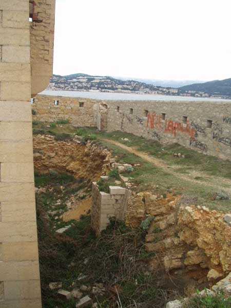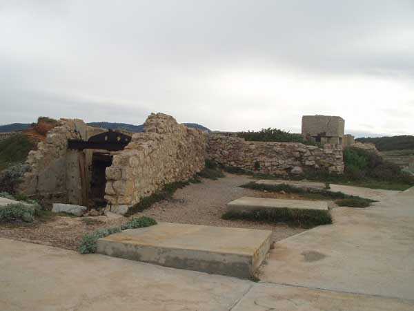 Fortress of Toulon, west of the city. 11 m/alt. Rarely mentioned coastal battery, established at the point of the same name. The position was already fortified in the 18th century and was remodeled between 1846 and 1856. Defended, in 1881, the bay of Saint-Nazaire with the batteries of Cap Nègre and Lauze, as well as the bay of Bandol to the west with the battery of Bandol. Controlling this bay would have authorized a landing that would have allowed to take the city of Toulon from the rear; a threat that was averted by the construction of the fort of Six Fours. The battery occupies a rocky point that it covers with its crenellated tower Mle 1846 no. 2 with embrasures many times modified, and an enclosure composed of a Carnot wall. Several emplacements for small or medium caliber pieces are discernible thanks to their ammunition niches, but they are in very bad condition. It did not escape the great wave of declassifications pronounced on December 3, 1888. We must mention a curiosity: in the center of the front, a strange circular metal tank (diameter ± 100 cm) surmounted by a double beam is sunk into the ground. It is framed by three thin walls, only the side facing the sea remaining free. To the rear, a covered way leads straight onto a masonry-coated slope giving access to the basement of the tower, straight into a room where engine bases remain. It could therefore be the location of a projector, but we have never seen anything similar anywhere else, so we are unable to give any interpretation. Today, the battery is a plot belonging to the municipality of Sanary which is in principle forbidden access because the risk of falling stones is real, so degraded is the tower. (04/2006).