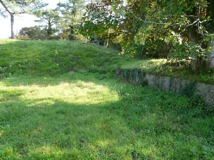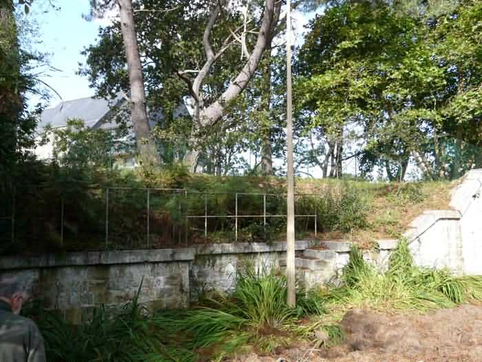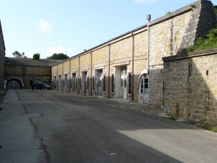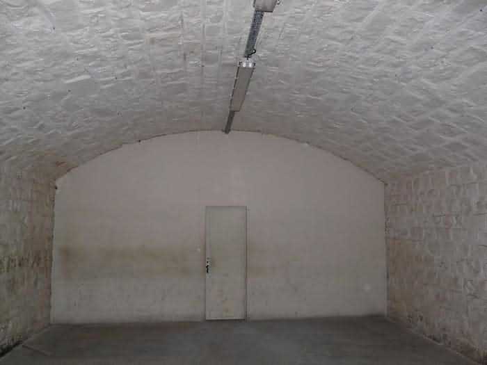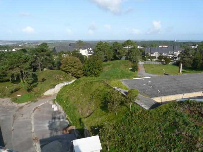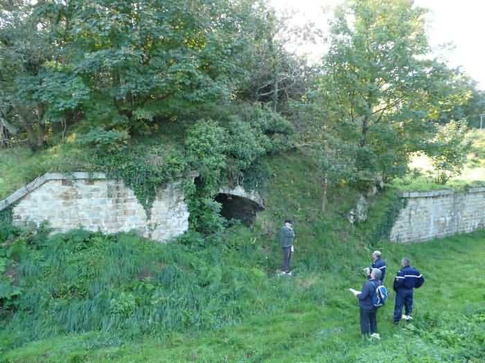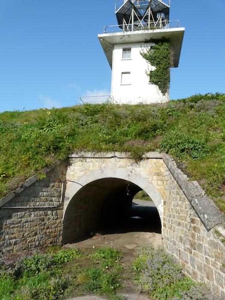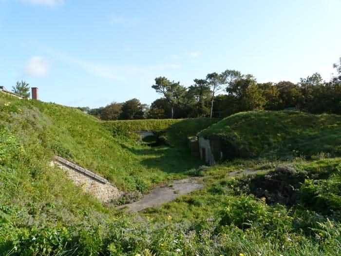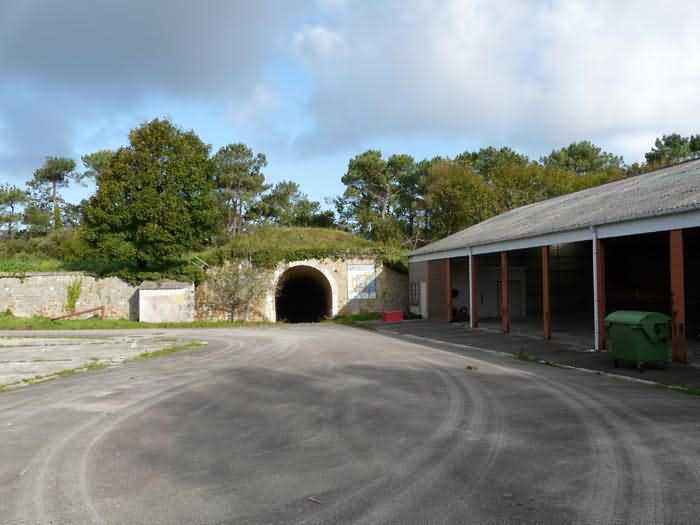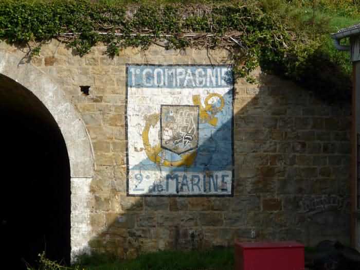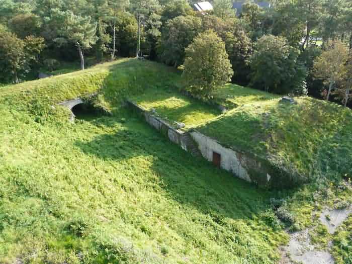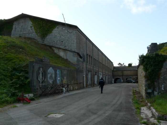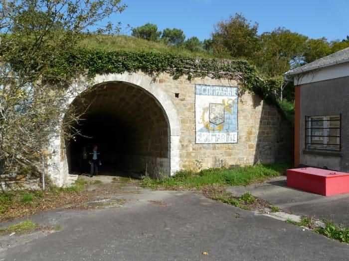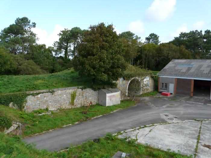 Fortress of Brest, Crozon peninsula, 1883-1886. ± 77 m altitude. Pentagonal fort, established west of the eponymous village. It possesses two double caponiers, currently under water, and a wing, accessible with some gymnastics via the ditch. A large opening gapes in the ceiling inside the caponiers, for the evacuation of firing fumes. The ceiling of the left powder magazine was lowered by concreting in 1902, while that of the right one, remaining as is, shows a segmental arch vault. The concreting may be due to the Germans who occupied it. The two powder magazines were originally identical, each with a storage room of 22.35 m long by 6 m wide. Their back partition had three lamp embrasures aligned on the same plane and two crawl spaces passed under the floor. However, the right one was reinforced by internal concreting in 1902. It now shows a non-vaulted ceiling and a blank back partition; its single lamp embrasure is placed above the entrance door. The radius of the arch encompassing magazine and lateral galleries is 4.30 m. The earth covering of the two-storey barracks was removed and the entrance of the fort, almost condemned, was replaced by a partial filling of the ditch on the gorge front. On the first floor of the barracks, a room, having long served as a soldiers' home, displays on its walls numerous paintings of Navy unit insignia. In one or another dormitory on the first floor, concrete repairs are clearly visible on the ceiling. Was the fort bombed? The rampart street is quite clear, and only the head front has retained its traverses. Behind the barracks, there were two cisterns of 250 m³. No traverse-shelter possesses two arms; it is only one for six of them, except for the one rooted in the capital of the head front which has none. The tops of the barracks were to be organized into infantry parapets as an infantry exit with two issues, similar to that of the Landaoudec redoubt, was spotted. A document dated 26 January 1911 specifies that in case of mobilization, the front I-II would be armed with 2 x 120 L, front II-III with 4 x 120 L, fronts III-IV and IV-V with 2 x 155 L, the south face (?) with 2 x 90 cm and the flanking would be ensured by 5 revolver guns and as many 12 cm breech-loaders, but it is not specified on which mounting. A battery annex at altitude 96 is also mentioned, which would be armed with 4 x 95 mm. In front of the fort's entrance, a commemorative plaque recalls that the contractor (actually works foreman working for the contractor Félix Mandement) to whom the adjudication of the fort's works was awarded was none other than Louis Léon Jouvet (1852-1902), father of the famous actor Louis Jules Eugène Jouvet (1887-1951), native of the town. The fort is located in the centre of the installations of the Gendarmerie Maritime of Brest / Île Longue which uses it partially and its access is forbidden.