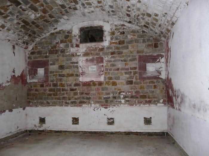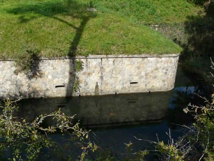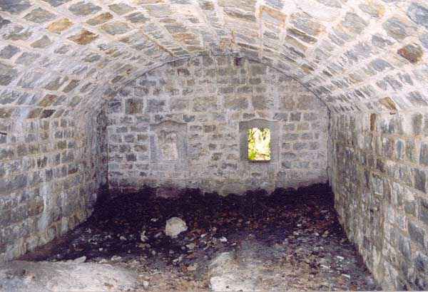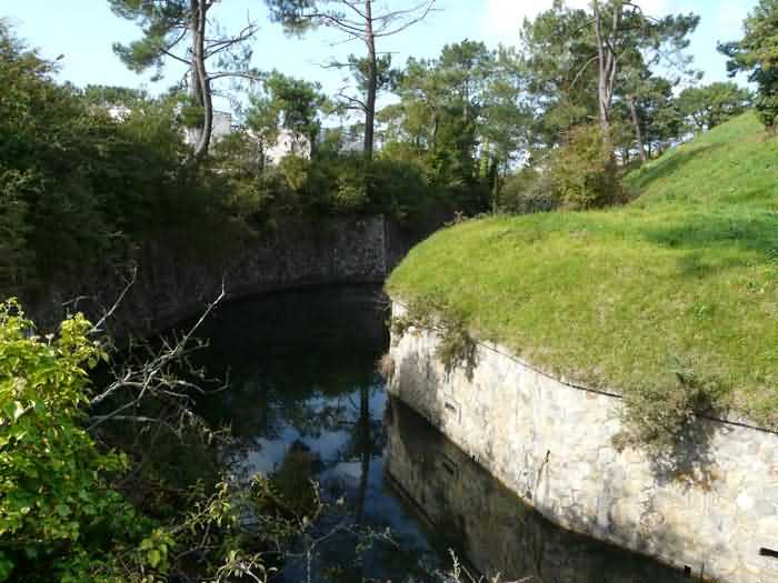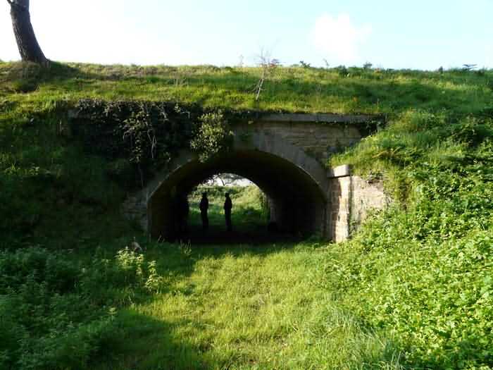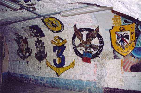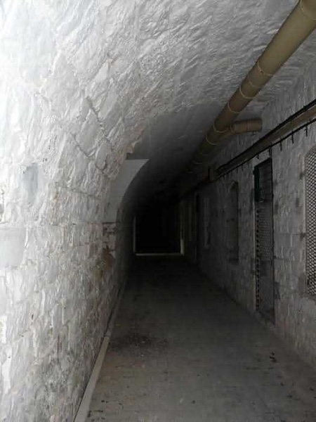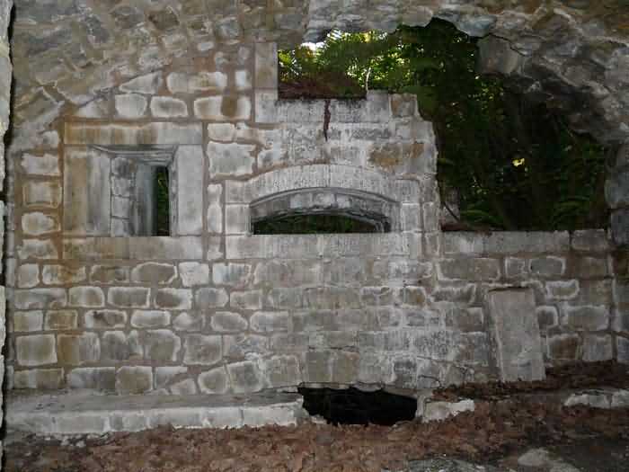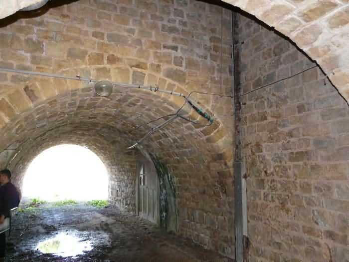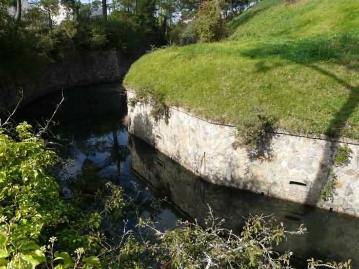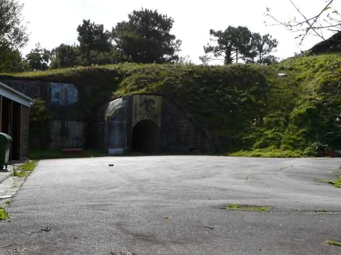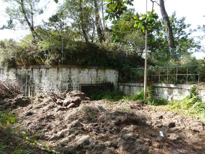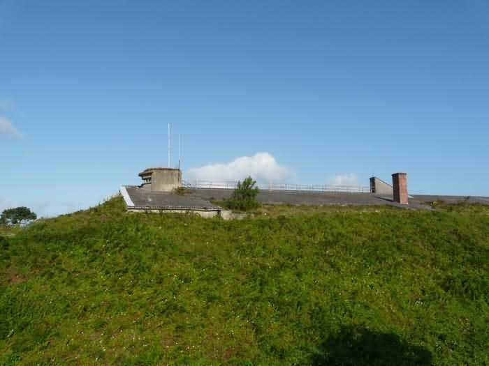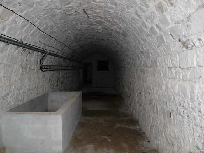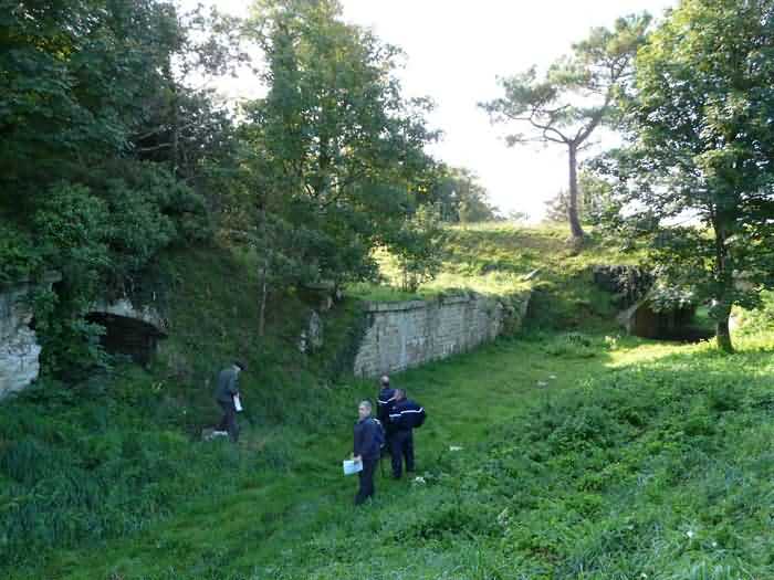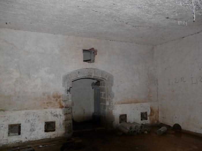 Fortress of Brest, Crozon peninsula, 1883-1886. ± 77 m altitude. Pentagonal fort, established west of the eponymous village. It possesses two double caponiers, currently under water, and a wing, accessible with some gymnastics via the ditch. A large opening gapes in the ceiling inside the caponiers, for the evacuation of firing fumes. The ceiling of the left powder magazine was lowered by concreting in 1902, while that of the right one, remaining as is, shows a segmental arch vault. The concreting may be due to the Germans who occupied it. The two powder magazines were originally identical, each with a storage room of 22.35 m long by 6 m wide. Their back partition had three lamp embrasures aligned on the same plane and two crawl spaces passed under the floor. However, the right one was reinforced by internal concreting in 1902. It now shows a non-vaulted ceiling and a blank back partition; its single lamp embrasure is placed above the entrance door. The radius of the arch encompassing magazine and lateral galleries is 4.30 m. The earth covering of the two-storey barracks was removed and the entrance of the fort, almost condemned, was replaced by a partial filling of the ditch on the gorge front. On the first floor of the barracks, a room, having long served as a soldiers' home, displays on its walls numerous paintings of Navy unit insignia. In one or another dormitory on the first floor, concrete repairs are clearly visible on the ceiling. Was the fort bombed? The rampart street is quite clear, and only the head front has retained its traverses. Behind the barracks, there were two cisterns of 250 m³. No traverse-shelter possesses two arms; it is only one for six of them, except for the one rooted in the capital of the head front which has none. The tops of the barracks were to be organized into infantry parapets as an infantry exit with two issues, similar to that of the Landaoudec redoubt, was spotted. A document dated 26 January 1911 specifies that in case of mobilization, the front I-II would be armed with 2 x 120 L, front II-III with 4 x 120 L, fronts III-IV and IV-V with 2 x 155 L, the south face (?) with 2 x 90 cm and the flanking would be ensured by 5 revolver guns and as many 12 cm breech-loaders, but it is not specified on which mounting. A battery annex at altitude 96 is also mentioned, which would be armed with 4 x 95 mm. In front of the fort's entrance, a commemorative plaque recalls that the contractor (actually works foreman working for the contractor Félix Mandement) to whom the adjudication of the fort's works was awarded was none other than Louis Léon Jouvet (1852-1902), father of the famous actor Louis Jules Eugène Jouvet (1887-1951), native of the town. The fort is located in the centre of the installations of the Gendarmerie Maritime of Brest / Île Longue which uses it partially and its access is forbidden.