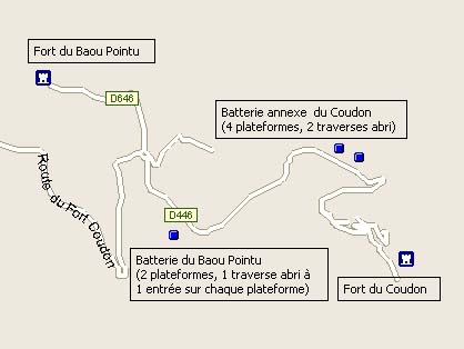 Pevnost Toulon, severovýchodně od města. 658 m/n.m. 250 severozápadně od fortu Coudon, tato baterie, orientovaná na severoseverovýchod, zahrnovala tři duté traversy, které jsou dnes (04/2006) ze tří čtvrtin zásypové. Ta uprostřed je umístěna více vzadu.