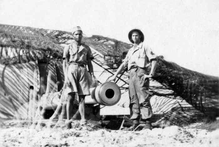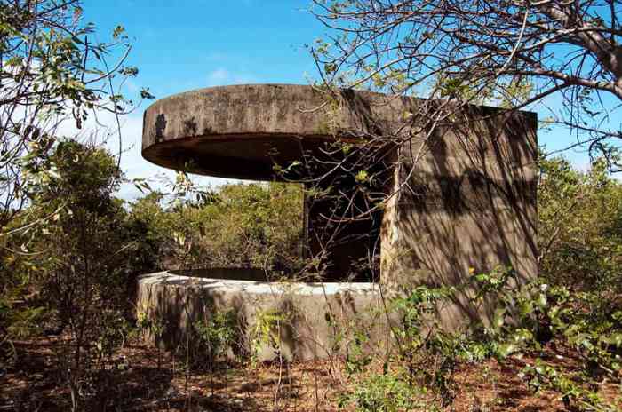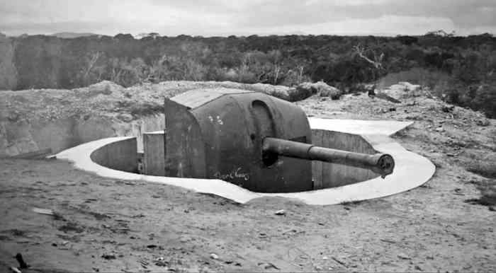 Diego-Suarez. Située dans la presqu’île d’Orangéa, à la cote 84, cette batterie était armée de quatre canons de 164 Mle 1893-96 sur affût C Mle 23. Les tubes provenaient du désarmement du croiseur cuirassé Jules Ferry. Quatre autres canons du même calibre de ce bâtiment étant destinés à la batterie du Fort Tartenson, à Fort-de-France. Dans la terminologie de la Marine, et bien qu’elle soit servie par le groupe d’Artillerie coloniale de Diego-Suarez, il s’agit donc d’une batterie d’artillerie secondaire. Ses matériels expédient, à la distance de 19 kilomètres et à la cadence de 3 coups à la minute, un obus de rupture coiffé pesant 54,9 kilos. Les pièces sont installées dans des cuves de 8 mètres de diamètre, encadrées de niches à munitions bétonnées. Ces niches sont ravitaillées, à partir d’un magasin souterrain, via un monte-charge et une galerie de desserte parcourue par une voie de 60. Un casernement, tout en longueur, communique avec la galerie de desserte, par un escalier à 2 volées de marches. Le poste directeur de tir, situé entre les pièces 3 et 4, possède une entrée indépendante. Il était doté d’un conjugateur « Colonies » et d’un télémètre à coïncidence de 5 mètres OPL. La cuirasse de celui-ci est toujours en place, amputée d’un de ses bras, démonté pour sortir l’instrument. Un projecteur de 150 GP Sauter-Harlé assurait l’éclairage pour le tir de nuit [-12.259085, 49.380821]. Cette batterie a ouvert le feu sur les croiseurs britanniques, en mai 1942. Un duel l’a opposée, d’abord à l’Hermione, puis au Devonshire. Ses pièces ont été sabordées à l’issue des combats, puis remises en état. Elle était encore capable de tirer à la fin des années 1950. Quoique envahie par la végétation tropicale, cette batterie possède encore, spectacle rare, ses quatre canons, encore très présentables. Elle est le plus bel exemple, encore existant, d’une batterie française d’artillerie secondaire. Aussi connue sous le nom de batterie du Point de Vue. Depuis la rédaction de cet article, les ferrailleurs ont sévi. Les masques des pièces ont été découpés, et les bras de la cuirasse du télémètre ont disparu. Diese Batterie liegt auf der Halbinsel Orangéa auf Höhe 84 und war mit vier Kanonen 164 mm Mle 1893-96 auf Lafette C Mle 23 bewaffnet. Die Rohre stammten von der Außerdienststellung des Panzerkreuzers Jules Ferry. Vier weitere Kanonen gleichen Kalibers dieses Schiffes waren für die Batterie des Forts Tartenson in Fort-de-France bestimmt. In der Terminologie der Marine handelt es sich, obwohl sie von der Kolonialartilleriegruppe Diego-Suarez bedient wurde, um eine Sekundärartilleriebatterie. Ihre Geschütze verschießen auf eine Entfernung von 19 Kilometern und mit einer Feuerrate von 3 Schuss pro Minute eine gecappte panzerbrechende Granate von 54,9 Kilogramm. Die Geschütze sind in Gruben von 8 Metern Durchmesser installiert, die von betonierten Munitionsnischen eingerahmt sind. Diese Nischen werden aus einem unterirdischen Magazin über einen Lastenaufzug und einen durch eine Feldbahn der Spurweite 60 befahrenen Versorgungsstollen versorgt. Eine langgestreckte Unterkunft verbindet sich über eine Treppe mit zwei Läufen mit dem Versorgungsstollen. Der Feuerleitstand, zwischen den Geschützen 3 und 4 gelegen, hat einen eigenen Eingang. Er war mit einem „Kolonien“-Konjugator und einem 5-Meter-Koinzidenz-Entfernungsmesser OPL ausgestattet. Dessen Panzerung ist noch vorhanden, jedoch eines ihrer Arme beraubt, der demontiert wurde, um das Instrument herauszunehmen. Ein 150-cm-Scheinwerfer GP Sauter-Harlé sorgte für die Beleuchtung für das Nachtfeuer [-12.259085, 49.380821]. Diese Batterie eröffnete im Mai 1942 das Feuer auf die britischen Kreuzer. Ein Duell lieferte sie sich zunächst mit der Hermione, dann mit der Devonshire. Ihre Geschütze wurden nach den Kämpfen versenkt und dann wieder instand gesetzt. Sie war Ende der 1950er Jahre noch feuerbereit. Obwohl von tropischer Vegetation überwuchert, besitzt diese Batterie noch, ein seltenes Schauspiel, ihre vier Kanonen, die noch sehr ansehnlich sind. Sie ist das schönste noch existierende Beispiel einer französischen Sekundärartilleriebatterie. Auch bekannt unter dem Namen Batterie du Point de Vue. Seit der Abfassung dieses Artikels haben die Schrottdiebe gewütet. Die Geschützblenden wurden herausgeschnitten, und die Arme der Panzerung des Entfernungsmessers sind verschwunden. Deze batterij, gelegen op het schiereiland Orangéa op hoogte 84, was bewapend met vier kanonnen van 164 mm Mle 1893-96 op affuit C Mle 23. De lopen waren afkomstig van de buitendienststelling van de pantserkruiser Jules Ferry. Vier andere kanonnen van hetzelfde kaliber van dit schip waren bestemd voor de batterij van Fort Tartenson in Fort-de-France. In de terminologie van de Marine, en hoewel zij werd bediend door de Koloniale Artilleriegroep van Diego-Suarez, betreft het dus een secundaire artilleriebatterij. Haar materieel vuurt op een afstand van 19 kilometer en met een vuursnelheid van 3 schoten per minuut een pantsergranaat met kap van 54,9 kilogram af. De stukken zijn geïnstalleerd in kazematten van 8 meter doorsnee, omlijst door betonnen munitienissen. Deze nissen worden bevoorraad vanuit een ondergronds magazijn via een goederenlift en een bedieningsgalerij die wordt doorlopen door een veldspoor van spoorwijdte 60. Een langgerekte legering communiceert met de bedieningsgalerij via een trap met 2 bordessen. De vuurleidingspost, gelegen tussen de stukken 3 en 4, heeft een onafhankelijke ingang. Hij was uitgerust met een „Koloniën“-conjugator en een 5-meter coincidentie-afstandsmeter OPL. Het pantser daarvan is nog aanwezig, beroofd van een van zijn armen, gedemonteerd om het instrument eruit te halen. Een zoeklicht van 150 cm GP Sauter-Harlé zorgde voor de verlichting voor het nachtvuur [-12.259085, 49.380821]. Deze batterij opend