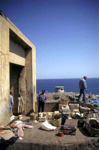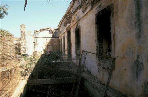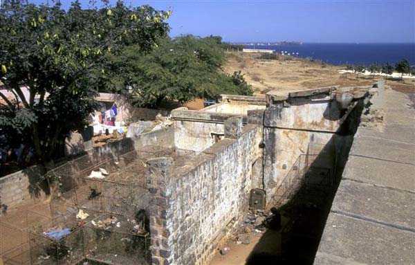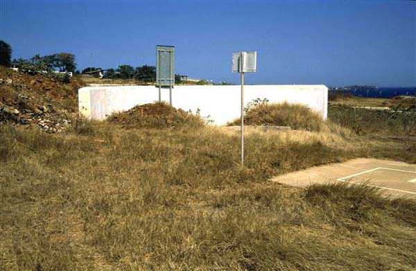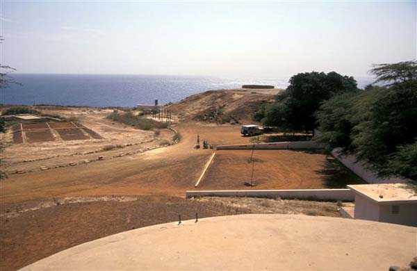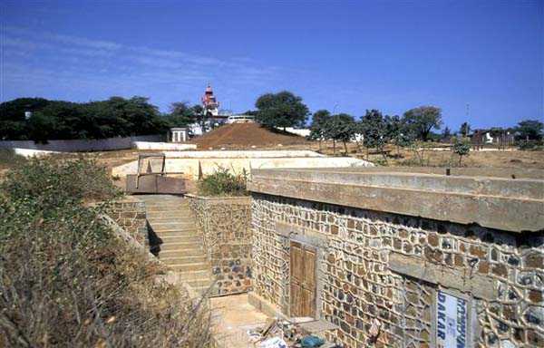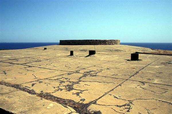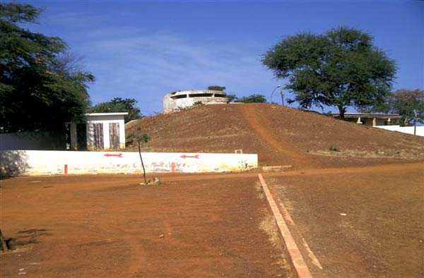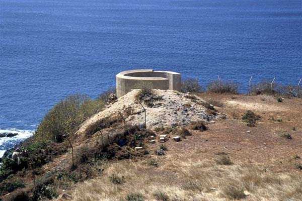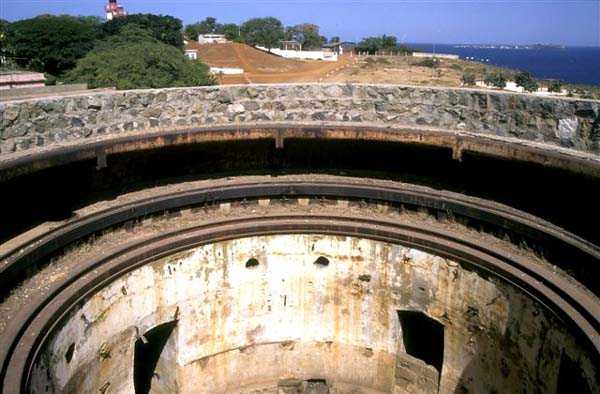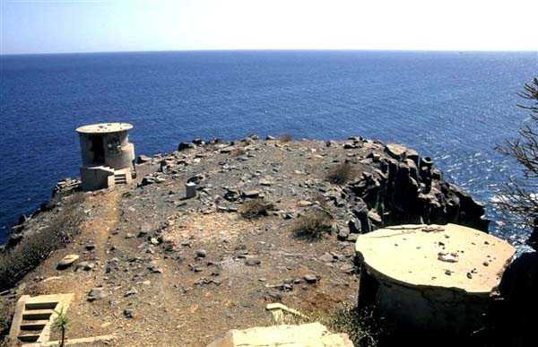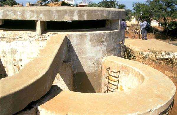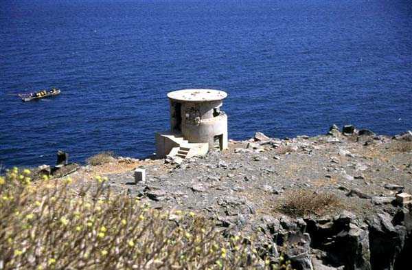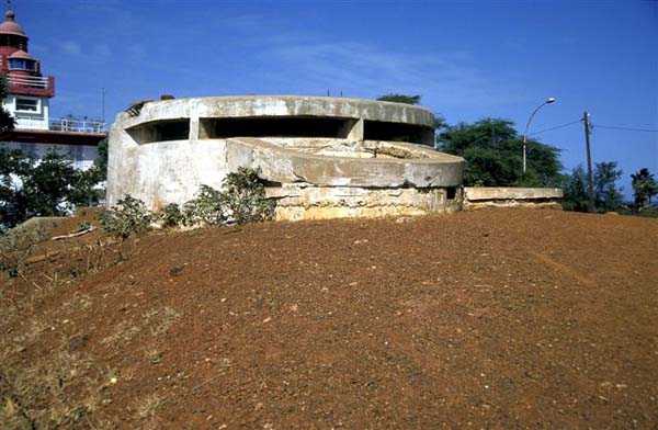 Dakar. Le cap Manuel constitue la pointe sud de la presqu’île du cap Vert, à 3000 mètres du port de Dakar. La portée des pièces augmentant, ce site va se trouver idéalement placé pour défendre le port à grande distance. Un projet de 1897 prévoit, à cet emplacement, 4 canons de 240 Mle 1870-97. Il ne sera pas réalisé. Une batterie à tourelle, armée de 2 canons de 240 Mle 1893-96 M est réalisée à partir de 1907. Elle est identique à celle de Bel-Air. Nous n’y reviendrons donc pas. La tourelle est amputée de ses tubes et berceaux en 1918. Elle est modernisée dans les mêmes conditions que ses semblables, avant la Seconde Guerre mondiale. La batterie est dotée, à cette occasion, d’un P.C.T. moderne, équipé d’un conjugateur « Colonies » et d’un télémètre stéréoscopique de 5 mètres S.O.M. Un abri bétonné protège le projecteur de 150 G.P. assurant l’éclairage, pour le tir de nuit. Ce projecteur est assisté par un système de repérage au bruit, dit mur d’écoute. La tourelle prend une part active aux combats de septembre 1940. Armée par un équipage de la Marine, elle met plusieurs coups au but sur les navires britanniques. Ceux-ci les lui rendent bien, et un coup de gros calibre tombe à toucher la tourelle, qui fait la preuve, à cette occasion, de sa robustesse. Après ces événements, le site est renforcé par la mise en position, sur des plateformes bétonnées, de la batterie de 155 Mle 32. Celle-ci, positionnée à Yoff, n’a pas pris part aux combats, faute de personnel pour la servir. Il s’agit incontestablement de la batterie la plus moderne de Dakar. Chaque pièce peut expédier, à la cadence de 2 coups à la minute, un obus perforant de 56,5 kg à la distance de 26 200 mètres. La batterie dispose de 2 remorques climatisées. L’une est équipée d’un télémètre S.O.M. de 5 mètres et l’autre d’un conjugateur « Colonies ». Une section de défense des passes, armée de 2 canons de 75 Mle 1897 sur affût 1916, remplaçant la section de la pointe de Dakar, est installée après les événements de septembre 1940. Si la batterie de 155 est envoyée au combat en Afrique du Nord, dès 1943, la tourelle reste en position jusqu’à son ferraillage avant l’indépendance du Sénégal. De nos jours, le massif de la tourelle de 240 est dans un état pitoyable, ferraillé et squatté. Le site, transformé en parcours de santé est quand même intéressant. On peut y voir le chemin de roulement de la tourelle, le P.C.T. de 1940, le mur d’écoute, l’abri du projecteur et d’autres éléments, comme les 2 abris jumeaux du dispositif R.E.P., qui permettait aux navires de trouver l’entrée du port dans l’obscurité. JJM 10/08/2008
