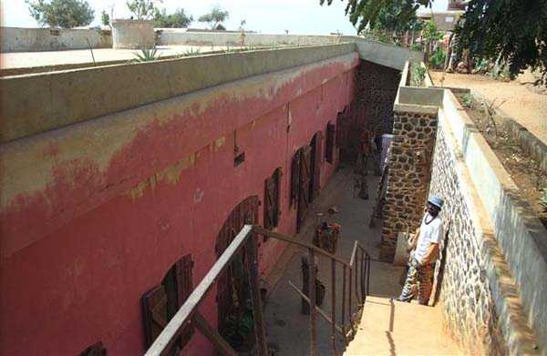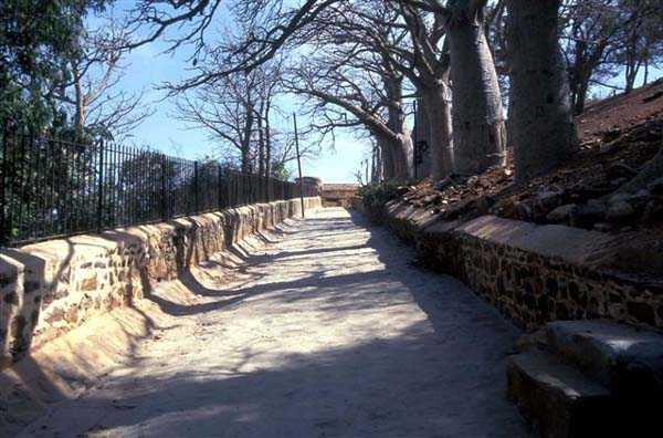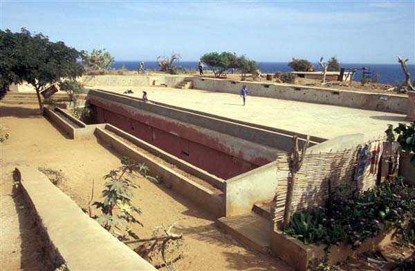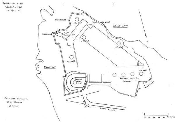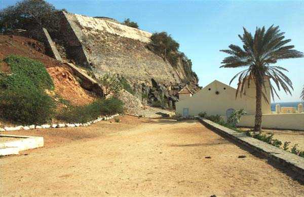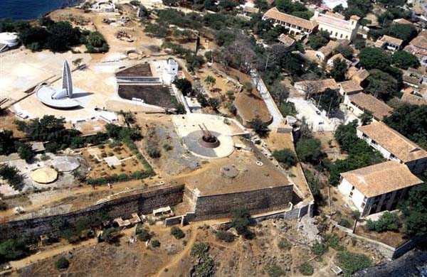Gorée. Nach Gorée zu gehen und den Castel nicht zu besichtigen ist ein Fehler, selbst wenn man kein Befestigungs-Enthusiast ist. Viele Touristen begehen ihn, da sie von der Entdeckung der Pflichtprogramme der Reiseveranstalter absorbiert werden, dem Sklavenhaus, dem historischen Museum des Forts d'Estrées usw.… Schade, denn der Castel von Gorée ist eine außergewöhnliche Verdichtung der französischen, modernen und zeitgenössischen Befestigung. Seit 1837, dem Datum des Baubeginns des fünfeckigen Forts, wurde er bis 1942 unablässig modifiziert und an die Entwicklung der Artillerie und Marine angepasst. Im Grunde ist es nur gut, wenn Touristen weniger von den Überresten der Gefechte von 1940 angezogen werden, als von den fragwürdigen Reizen der Massentourismus-Attraktionen. Das lässt dem Amateur mehr Zeit, seine Leidenschaft zu befriedigen. Und um, wie die Artilleristen des 6. RAC, auf die Melodie der Paimpolaise zu singen: Ich liebe Gorée und seine Klippe, seinen Castel und seine großen Kanonen… 1837 ohne viel Strenge begonnen, wird der Bau des fünfeckigen Forts, das das Fort Saint-Michel ersetzen soll, bis 1846 fortgesetzt. Bereits 1838 beschwert sich der für das Werk verantwortliche Hauptmann des Genies, dass die Arbeiten ohne festgelegten Plan und ohne ministerielle Genehmigung durchgeführt werden. 1844 kritisieren der Prinz von Joinville, Sohn von Louis-Philippe, sowie mehrere Offiziere die Konzeption des Forts, insbesondere seine von Weitem sichtbaren hohen Mauern. Tatsächlich finden sie nur Fehler an diesem Werk, das mit 5 Bastionen ausgestattet ist. Ihre Kritiken werden vom Komitee der Fortifikationen nicht berücksichtigt, und fertiggestellt wird es mit 30 Kanonen und Kanonenhaubitzen von 30 und 50 bewaffnet. Wenige Verbesserungen werden vorgenommen, außer an der Bewaffnung, die 1870 23 gezogene 16-cm-Kanonen umfasst, die nur verbesserte 30-cm-Kanonen sind. 1868 wird ein Projekt zur Installation eines gepanzerten Turms für ein Geschütz großen Kalibers auf einer der Bastionen erwähnt. Es wird nicht weiterverfolgt. Man muss bis zum Ende des 19. Jahrhunderts warten, um endlich das Werk zu sehen, dessen Mauern bis auf das natürliche Geländeniveau abgetragen sind, ausgestattet mit einem Pulvermagazin. 1897 zählt das Fort laut einem Bericht von Konteradmiral Escande 3 Batterien: