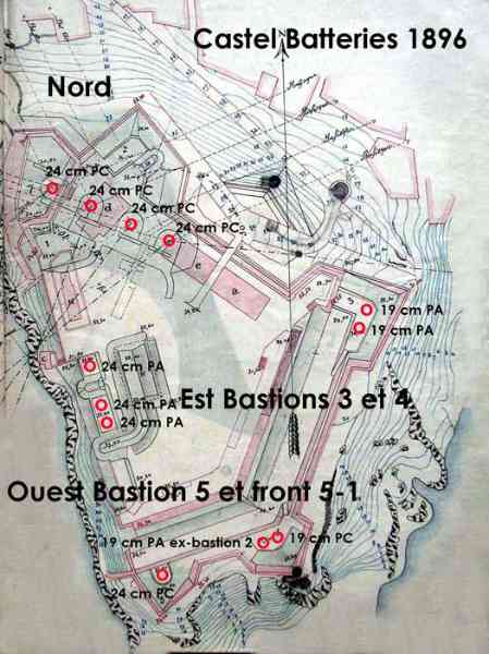 Nur die Nordbatterie ist modern, die anderen sind völlig veraltet. Die Westbatterie soll mit 240-mm-Kanonen Mle 1870 ausgestattet werden. Die Anordnung der Ostbatterie ist mangelhaft. Sie soll durch eine Batterie von 270-mm-Mörsern ersetzt werden, deren Projekt nicht erstellt ist. Ein Projekt von 1902 sieht, zusätzlich zur in ihrem Zustand belassenen Nordbatterie, vor: