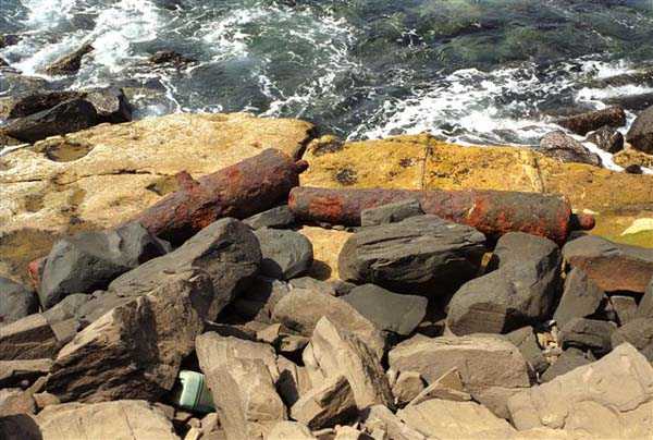 En haut de la route d’accès, le « chemin de charroi des canons », un blockhaus pour canon de 37 TR interdit l’accès au fort. Les canons de 24 cm et les mitrailleuses sont renvoyés en métropole en 1915. Les canons de la tourelle sont déposés en 1918. Ils sont prêts à être expédiés en métropole quand survient l’armistice. Ils seront remontés après la guerre. La tourelle est modifiée avant la Seconde Guerre mondiale, comme ses semblables de Bel-Air et du Cap Manuel, pour recevoir des canons de 240 Mle 1902-06. La batterie Nord est réarmée avec 4 canons de 138 Mle 1881 sur affût PC. Après les événements de septembre 1940, la batterie de 138 est remplacée par 5 canons de 150 Krupp, ultime évolution de l’armement du Castel de Gorée. Outre les vestiges de son armement et de ses installations annexes, magasin souterrain, abri-usine, PDT, abris à projecteur, le passé guerrier du Castel s’exprime par les carcasses de canons et d’affûts de toutes les époques, jetés au bas de sa falaise basaltique. Il est bien dommage que l’on ait jugé utile d’enlaidir le site avec un mémorial de l’esclavage. Gorée n’a eut qu’un rôle marginal dans le trafic des esclaves, mais l’édification de ce monument répond sans doute aux besoins de culpabilisation et de repentance de beaucoup de touristes occidentaux, alors… JJM 10/08/2008