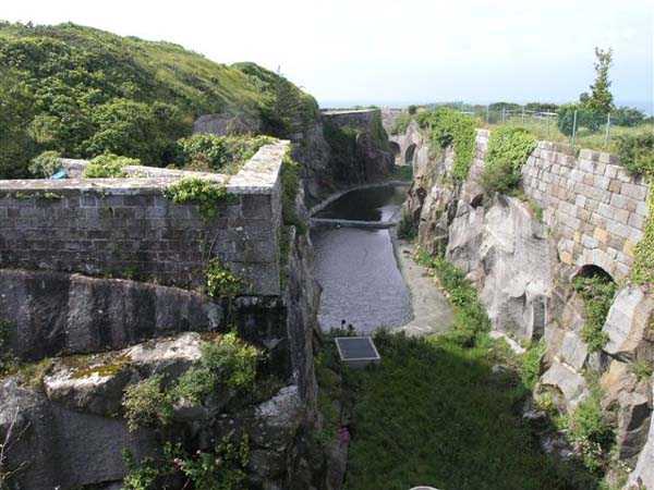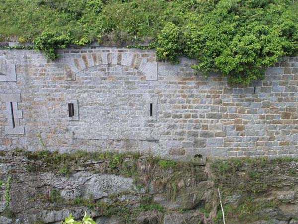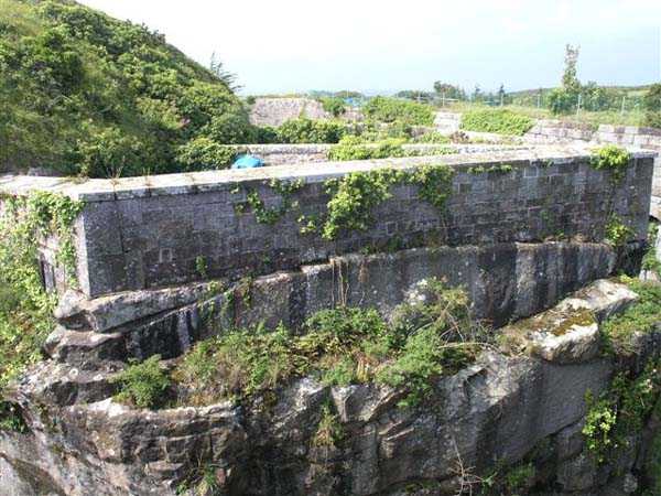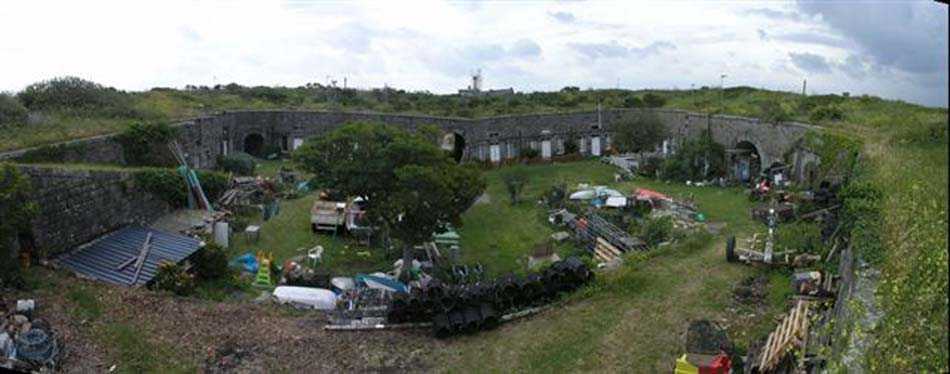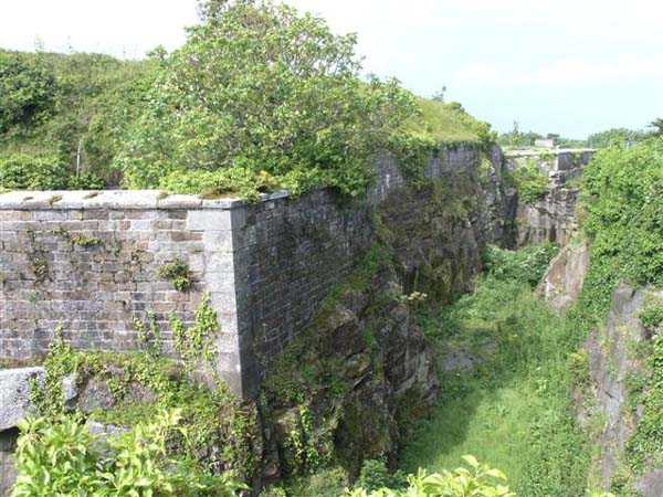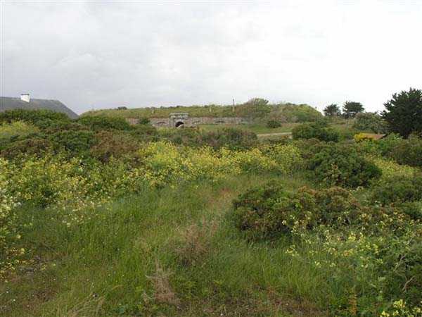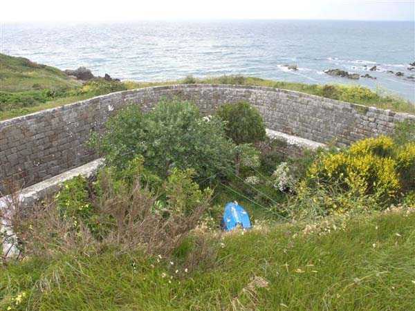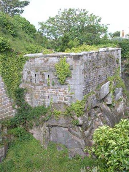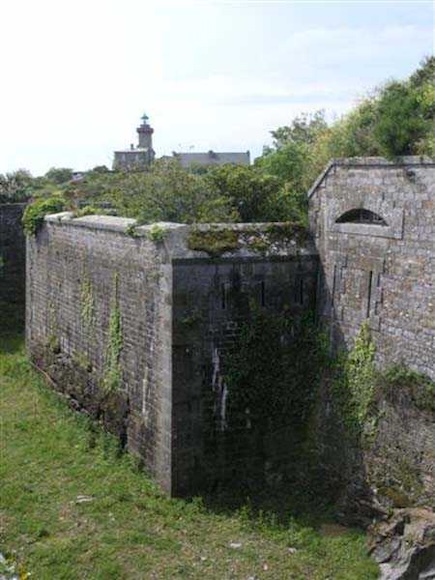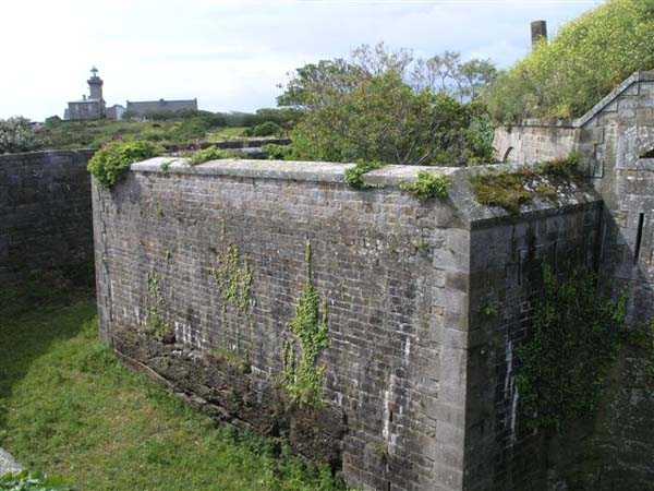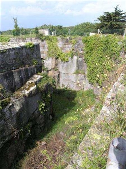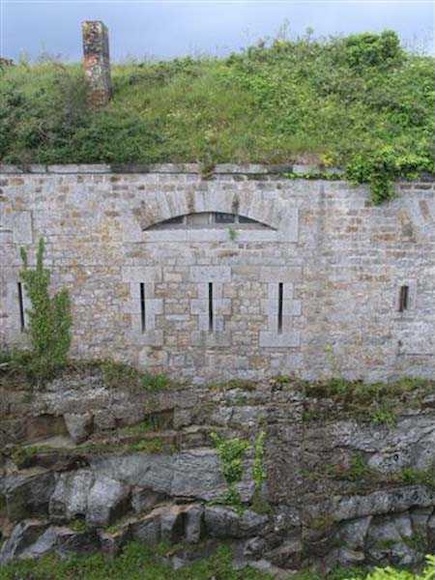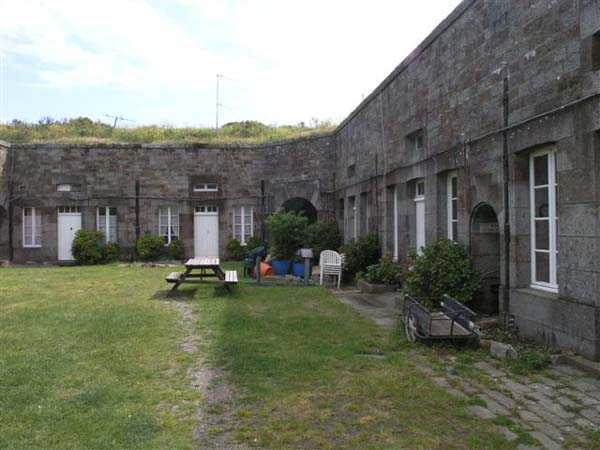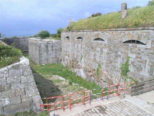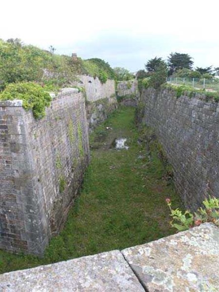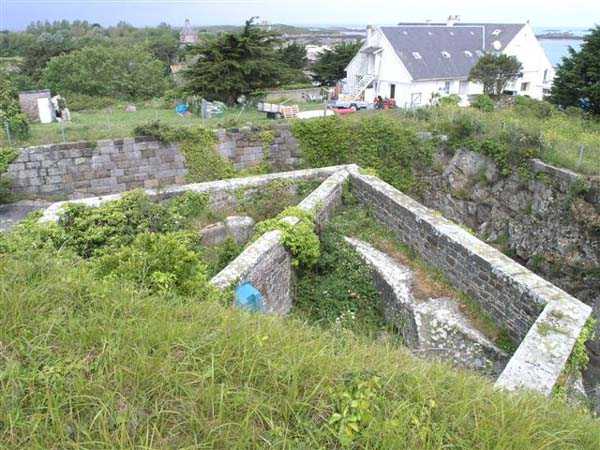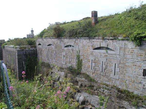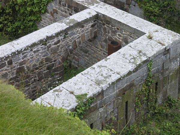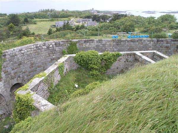 District of Granville, Chausey archipelago. 18 m/alt. Planned as early as 1841, it took until 1866 for this fort to materialize. An almost regular pentagon, it is surrounded by a dry ditch whose escarp and counterscarp rest on the raw granite. Only the counterscarp of front I-II, due to the little available thickness between the latter and the natural slope, will include relieving arches. While the escarps of the curtain walls are rectilinear, the counterscarps facing these curtain walls are re-entrant. A small bastion occupies each salient. All are traversed, but this traverse, one per small bastion, is variably positioned. Three rifle loopholes per flank are to handle the defence of the ditch. The entrance to the fort, very sober, no longer shows any trace of the drawbridge. It is not preceded by a ravelin because it is protected by the very close Lighthouse Battery, situated slightly higher and connected to the fort by a covered way. The rear of the casemates, rooms and magazines, backing onto the ditches, is also provided with loopholes. These casemates were also intended to accommodate the gunners of the neighbouring battery, the total strength (artillery only) of the whole, fort + battery, was to amount to 108 men. The courtyard of the fort includes two ramps to bring the artillery pieces within their parapet. Quite singularly, only front III-IV was provided with artillery, the rest of the perimeter consisted of an infantry parapet. Before 1881, the fort contained only two smoothbore 22 cm howitzers. An armament project, adopted in 1881, consisted of a rifled and hooped 22 cm howitzer in bastions 3 and 4 (+ 2 others?) and two 19 cm guns whose mission would have been to block the Beauchamp channel. It is by no means established that this armament was installed because in 1888, the Superior Council of War concluded that it was useless to retain coastal defence installations there and decided its decommissioning. In 1871, 150 Communards were imprisoned there and, during the First World War, 300 German prisoners stayed there. Today (05/2007), the fort is in a very good state of preservation. Its casemates are occupied by fishermen and only the courtyard and the exterior perimeter are freely accessible. Property of the Coastal Conservatory.