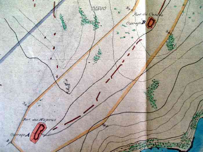 Diego-Suarez. Le fort du Centre assure le flanquement à gauche, vers le fort des Mapous, et à droite, vers le fort du Cap Bivouac. Il dispose de deux casemates de Bourges, armées chacune de 2 canons de 95 Mle 1888 sur affût C Mle 1904 G, et d’un abri bétonné. L’altitude moyenne de l’ouvrage est de 66 mètres. Il est défendu par un fossé sec, avec contrescarpe maçonnée, entouré d’une grille défensive, aujourd’hui disparue. Deux mitrailleuses assurent la continuité des feux d’infanterie. L’ouvrage est en terrain libre. Das Fort du Centre sichert die Flankierung nach links in Richtung Fort Mapous und nach rechts in Richtung Fort Cap Bivouac. Es verfügt über zwei Bourges-Kasematten, jede bewaffnet mit 2 Kanonen 95 mm Mle 1888 auf Lafette C Mle 1904 G, und einen betonierten Unterstand. Die durchschnittliche Höhe des Werks beträgt 66 Meter. Es wird durch einen trockenen Graben mit gemauerter Kontereskarpe verteidigt, umgeben von einem heute verschwundenen Verteidigungsgitter. Zwei Maschinengewehre gewährleisten die Kontinuität des Infanteriefeuers. Das Werk befindet sich auf freiem Gelände. Het fort du Centre verzekert de flankering naar links, richting het fort Mapous, en naar rechts, richting het fort Cap Bivouac. Het beschikt over twee Bourges-kazematten, elk bewapend met 2 kanonnen van 95 mm Mle 1888 op affuit C Mle 1904 G, en een betonnen onderkomen. De gemiddelde hoogte van het werk is 66 meter. Het wordt verdedigd door een droge gracht met gemetselde contrescarpe, omgeven door een verdedigingsrooster, dat tegenwoordig verdwenen is. Twee mitrailleurs verzekeren de continuïteit van het infanterievuur. Het werk bevindt zich op vrij terrein. The Centre fort provides flanking to the left, towards the Mapous fort, and to the right, towards the Cap Bivouac fort. It has two Bourges casemates, each armed with 2 guns of 95 mm Mle 1888 on mounting C Mle 1904 G, and a concrete shelter. The average altitude of the work is 66 metres. It is defended by a dry ditch, with masonry counterscarp, surrounded by a defensive grid, now disappeared. Two machine guns ensure the continuity of infantry fire. The work is on open ground. Pevnost Centre zajišťuje flankování doleva směrem k pevnosti Mapous a doprava směrem k pevnosti Cap Bivouac. Má k dispozici dvě kasematy Bourges, každou vyzbrojenou 2 děly ráže 95 mm vz. 1888 na lafetě C vz. 1904 G, a betonový kryt. Průměrná nadmořská výška díla je 66 metrů. Je bráněno suchým příkopem se zděnou kontreskarpou, obklopeným obrannou mříží, dnes zmizelou. Dva kulomety zajišťují kontinuitu pěchotní palby. Dílo se nachází na volném terénu. © JJM 25/03/2026