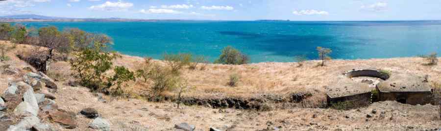 Diego-Suarez. Front de mer. Cette batterie, armée de 4 canons de 138 Mle 1881 sur affût Mle 1917, vient tout juste d’être mise en service au moment de l’attaque britannique de mai 1942. Ces matériels sont anciens, même si l’affût Mle 1917 peut être considéré comme assez moderne. Les pièces sont disposées dans des cuves avec niches à munitions attenantes, reliées par une tranchée maçonnée. Le PDT, maçonné et recouvert d’un blindage, est situé au sommet de la colline. L’abri du projecteur est situé en contrebas de la batterie, avec le poste de commande de celui-ci. Ces deux éléments étaient recouverts d’un blindage, ou d’un toit en béton armé, aujourd’hui disparu, comme celui du PDT. La mission de la batterie, située à 50 mètres d’altitude, et commandée par le capitaine Caussèque, du Groupe d’Artillerie Coloniale de Diego-Suarez, est l’interdiction d’un débarquement dans la baie du Courrier, défendue par ailleurs par un champ de 111 mines. Sa situation très isolée, et donc très exposée, lui vaut d’être protégée par une section du 3e bataillon du 2e RTM (régiment de tirailleurs malgaches), aux ordres du sergent Desbat. Cette protection n’empêche pas la conquête par surprise de l’ouvrage par le 5e commando, débarqué le 5 mai, à 2 heures du matin, dans l’anse d’Ampankara. Le sergent Desbat trouve la mort dans l’engagement, et se trouve ainsi être le premier tué de la bataille. La batterie est encore en bon état, même si le ferraillage des parties métalliques la dénature progressivement. Le site mérite le détour. Küstenfront. Diese Batterie, bewaffnet mit 4 Kanonen 138 mm Mle 1881 auf Lafette Mle 1917, war gerade erst in Dienst gestellt worden, als die britische Attacke im Mai 1942 erfolgte. Dieses Material ist alt, auch wenn die Lafette Mle 1917 als recht modern gelten kann. Die Geschütze sind in Gruben mit angrenzenden Munitionsnischen angeordnet, die durch einen gemauerten Graben verbunden sind. Der Feuerleitstand (PDT), gemauert und mit einer Panzerung abgedeckt, befindet sich auf dem Gipfel des Hügels. Der Scheinwerferunterstand liegt unterhalb der Batterie, zusammen mit dessen Kommandostand. Diese beiden Elemente waren mit einer Panzerung oder einem Stahlbetondach abgedeckt, die heute verschwunden sind, ebenso wie das des Feuerleitstands. Die Aufgabe der Batterie, die sich auf 50 Metern Höhe befindet und von Hauptmann Caussèque von der Kolonialartilleriegruppe Diego-Suarez kommandiert wird, besteht darin, eine Landung in der Baie du Courrier zu verhindern, die zudem durch ein Minenfeld mit 111 Minen verteidigt wird. Ihre sehr isolierte und daher sehr exponierte Lage bringt es mit sich, dass sie durch eine Sektion des 3. Bataillons des 2. RTM (Regiment madagassischer Schützen) unter dem Befehl von Sergeant Desbat geschützt wird. Dieser Schutz verhindert nicht die überraschende Eroberung des Werks durch das 5. Kommando, das am 5. Mai um 2 Uhr morgens in der Anse d’Ampankara landete. Sergeant Desbat findet bei dem Gefecht den Tod und ist damit der erste Gefallene der Schlacht. Die Batterie ist noch in gutem Zustand, auch wenn die fortschreitende Demontage der Metallteile sie allmählich entstellt. Der Ort ist einen Umweg wert. Zeefront. Deze batterij, bewapend met 4 kanonnen van 138 mm Mle 1881 op affuit Mle 1917, was net in dienst gesteld op het moment van de Britse aanval in mei 1942. Dit materieel is oud, ook al kan de affuit Mle 1917 als vrij modern worden beschouwd. De stukken zijn opgesteld in kazematten met aangrenzende munitienissen, verbonden door een gemetselde loopgraaf. De vuurleidingspost (PDT), gemetseld en bedekt met een pantsering, bevindt zich op de top van de heuvel. De zoeklichtbunker bevindt zich lager dan de batterij, samen met de commandopost ervan. Deze twee elementen waren bedekt met een pantsering of een gewapendbetonnen dak, die tegenwoordig verdwenen zijn, net als dat van de vuurleidingspost. De taak van de batterij, gelegen op 50 meter hoogte en onder bevel van kapitein Caussèque van de Koloniale Artilleriegroep van Diego-Suarez, is het beletten van een landing in de baai van Courrier, die overigens wordt verdedigd door een mijnenveld van 111 mijnen. Haar zeer geïsoleerde en dus zeer blootgestelde ligging maakt dat zij wordt beschermd door een sectie van het 3e bataljon van het 2e RTM (regiment Malagassische scherpschutters), onder bevel van sergeant Desbat. Deze bescherming verhindert niet de verrassende verovering van het werk door het 5e commando, dat op 5 mei om 2 uur 's nachts landde in de inham van Ampankara. Sergeant Desbat vindt de dood in de strijd en is daarmee de eerste gesneuvelde van de slag. De batterij is nog in goede staat, ook al wordt zij langzaam ontsierd door de sloop van de metalen delen. De site is een omweg waard. Seafront. This battery, armed with 4 guns of 138 mm Mle 1881 on mounting Mle 1917, had just been put into service at the time of the British attack in May 1942. This equipment is old, even if the Mle 1917 mounting can be considered fairly modern. The pieces are arranged in pits with adjacent ammunition niches, connected by a masonry trench. The fire control post (PDT), masonry-built and covered with armour, is located at the top of the hill. The searchlight shelter is located below the battery, together with its command post. These two elements were covered with armour or a reinforced concrete roof, now disappeared, as has that of the PDT. The mission of the battery, located at an altitude of 50 metres, and commanded by Captain Caussèque, of the Diego-Suarez Colonial Artillery Group, is to deny a landing in Baie du Courrier, also defended by a minefield of 111 mines. Its very isolated, and therefore very exposed, situation means it is protected by a section of the 3rd battalion of the 2nd RTM (Malagasy rifle regiment), under the orders of Sergeant Desbat. This protection does not prevent the surprise capture of the work by the 5th