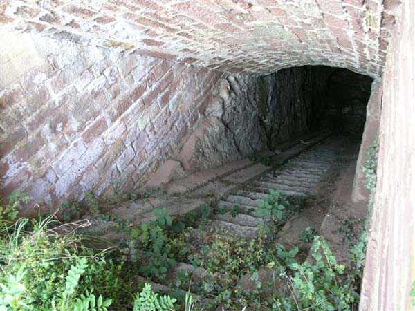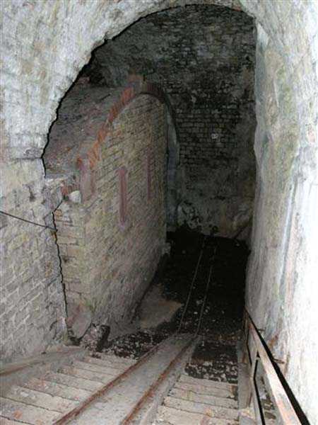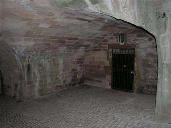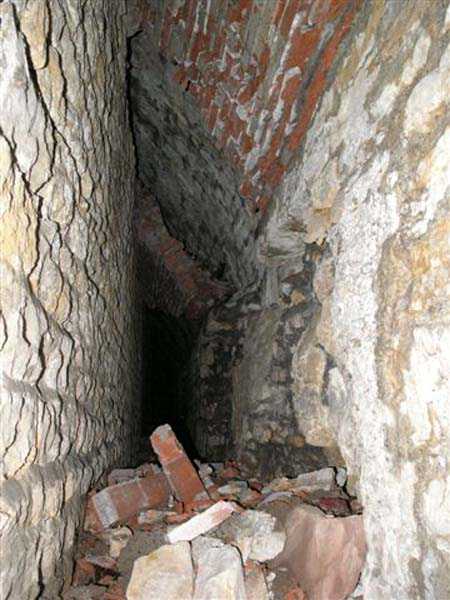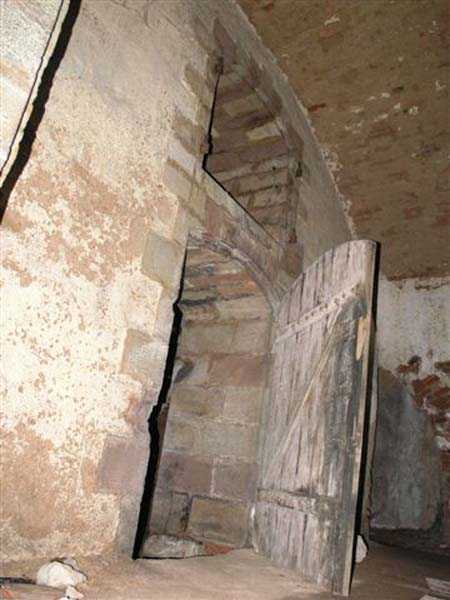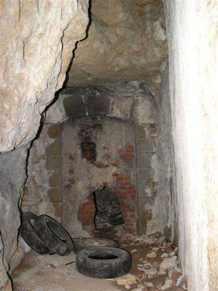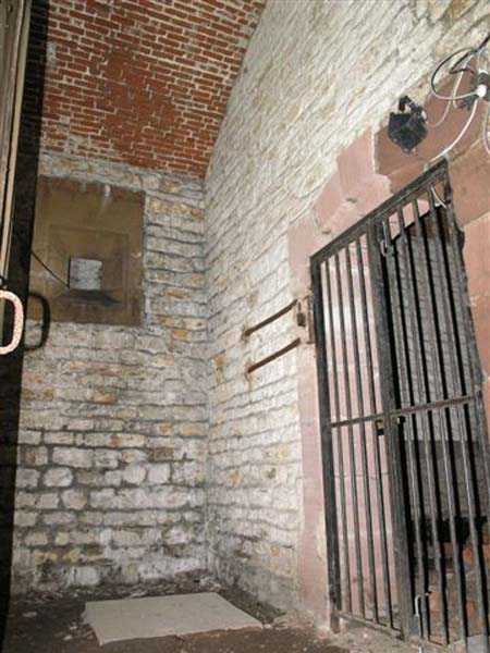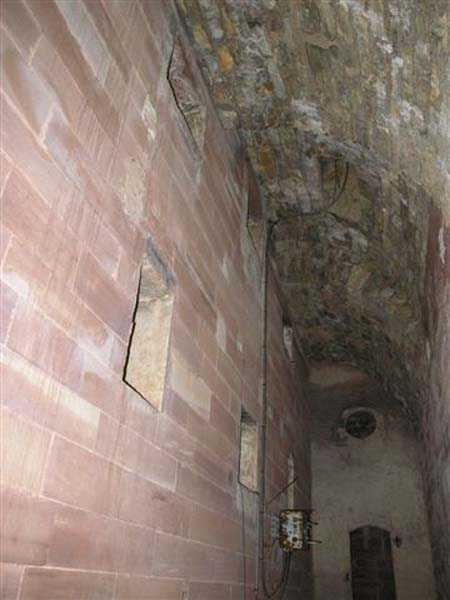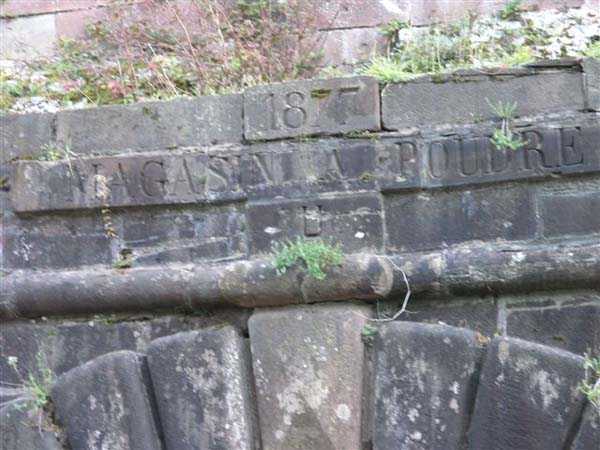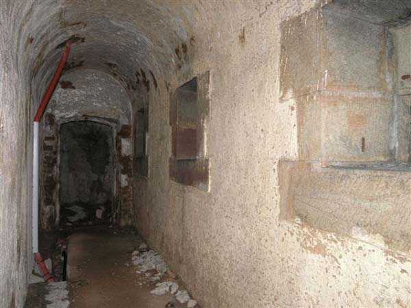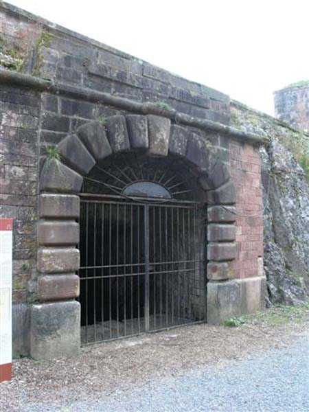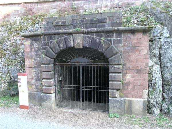 Place de Belfort, west center of the square, 1876-1877. Under the third enclosure, in 1876, the "S" store was dug. As a reminder, the central stores of Justice are designated "A" and "B", and a third, which we were unable to visit and designated "N" (1876), is located in the trench between the castle and the Justice ridge. The "S" store is accessible by a double staircase totaling 34 steps of 20 cm. The right part of the descent is masonry, the left is rough rock. At the foot of the staircase, an arched masonry buttress supports the entrance hall of the store, the storage room of which is offset to the right in relation to the axis of the access staircase. This is a nested type store, that is to say, built of rubble masonry in an artificial cavity. The vault was to be topped with a framework supporting a tiled roof, but only the supports of this framework remain today (10/2007). The lateral sanitary ducts show buttresses along the entire length of the store, the dimensions of which are 20 x 6 m. The lamp room is 156 cm wide and allowed three lamps to be served, the crenellations of which are 140 cm from the ground. On the other hand, between the base of the crenellation and the trace of the floor in the storage room, there is only 110 cm, which is singularly little. The left lateral duct extends beyond the lamp room to reach a corridor leading to another staircase emerging, this one, in the fourth enclosure. This store is quite degraded by humidity. If we return to the second enclosure, we cannot miss the bossed entrance of the "U" magazine, surmounted by the 1877 chronogram. Here, two parallel flights of a staircase-ramp lead down to the depths. The central ramp was later equipped with rails allowing the supply or evacuation of powders with less effort. 37 steps below, after crossing a superb horseshoe-shaped masonry arch, the magazine, also nested, is installed perpendicularly on the left. The lamp niche of the entrance airlock is 262 cm from the ground. The storage room is essentially identical to that of the "S" magazine, although with a greater apparent height. The side galleries also have buttresses but are more discreet, the narrow width of the galleries naturally leading to this. The major difference is that the cavity here has been lined with rubble masonry. The roof of the storage room shows no traces of any covering, even though we remain convinced that there was one. The terracotta brick vault largely collapsed during an earthquake in February 2003. What remains suspended is just waiting to collapse. To discuss the third reason, we must return to the access route to the castle courtyard. In the tunnel of the second enclosure, on the left, a third powder magazine, as devoid of a chronogram as of a designation letter, has all the characteristics of a model conforming to the ministerial circular of July 27, 1867. Its storage room, 13 x 6 m, is provided with six lamp crenellations in two lines of three superimposed. In order to support the floor of the upper level, rather than corbels, the sides are provided with a continuous coping of pink sandstone, along the entire length of the storage room. The side shafts are quite wide; barbicans for ventilation open into it, but what is striking is the contrast between the masonry of the envelope, banal, and that of the store itself, in very neat pink sandstone. The lamp room was closed on both sides by a thin partition in which a door surmounted by an oculus was pierced. The absence of any trace of an intermediate floor in this room suggests that the upper crenellations were reached using a ladder. This store serves as a warehouse for various works and statues. Unfortunately, its walls have served as a support for the multicolored writing of messages that are certainly praiseworthy, but not appropriate in one of the rare and best preserved Mle 1867 stores that remain in France. See also Belfort central stores.