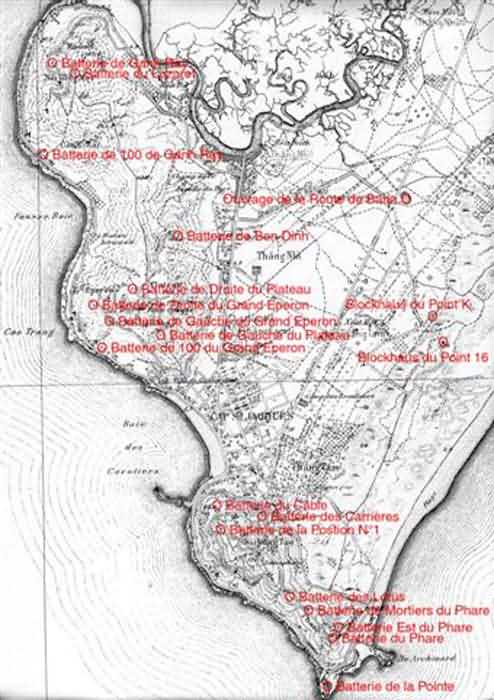 The defence of the rivers is ensured by the Rach-Cat work, armed with 4 guns 240 Mle 1893-96 M "Colonies" under armoured Schneider turrets. The majority of this equipment is sent back to mainland France during the First World War and, in 1920, the defence only comprises the 30 cm pieces Mle 1893 of the Lighthouse mortar battery, the 24 cm guns of the Ganh Ray battery, the 13.8 cm guns of the Lotus, Lazaret, right and left Plateau batteries, as well as the turret of the Route de Baria work. A first project of a rearmament programme is sketched in 1930. It envisages, initially, the rearmament of the Cable battery, and the 100 batteries of Ganh Ray and Grand Éperon. The modernisation of the Lighthouse and Lotus mortar batteries is also considered. In a second phase, a 155 Mle 1920 battery is to be installed on each of the three massifs. One of the two Rach Cat turrets is to be rearmed, but it is not known with which guns. None of this will be realised, and one must wait until 1934 to see a coherent programme appear. In 1939, the armament of the land front of Cape Saint-Jacques is as follows: