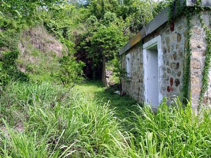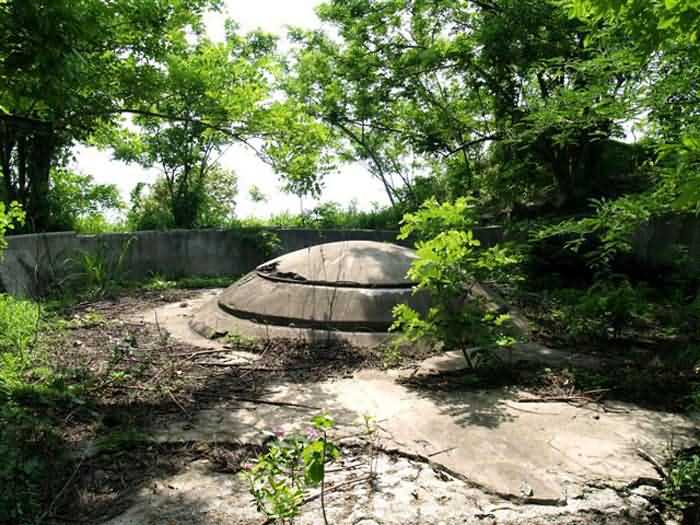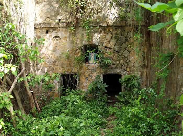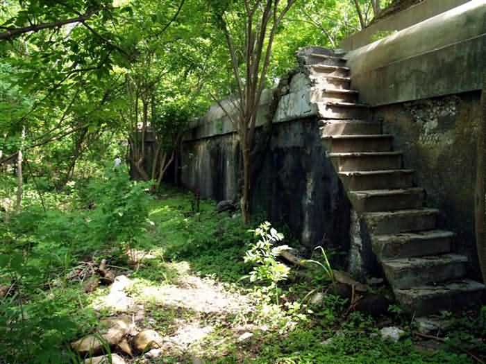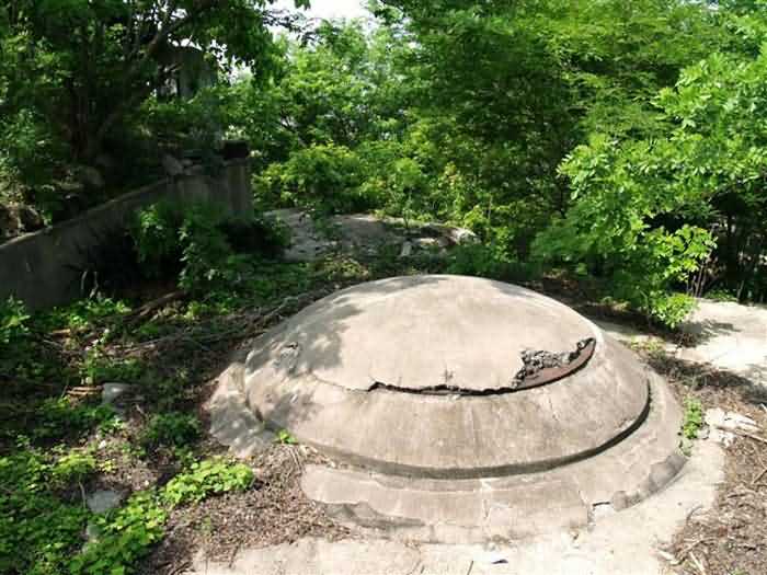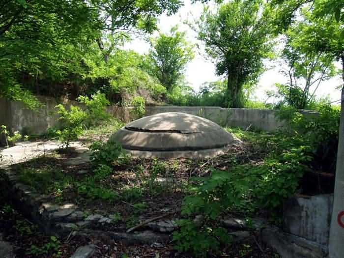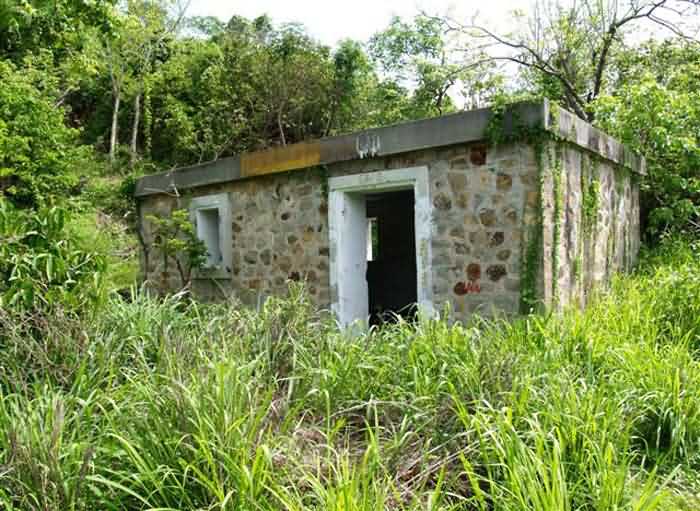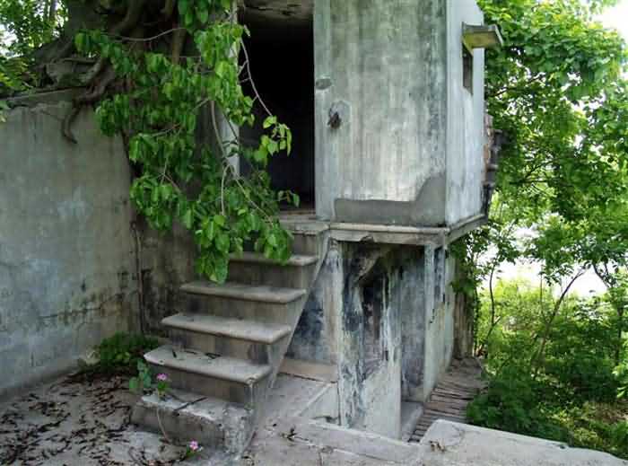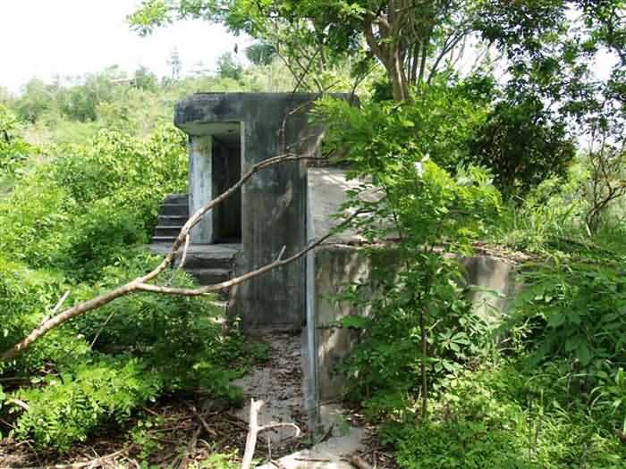 Former Battery t, Cape Saint-Jacques. This battery, built at an altitude of 94 metres, is part of the Lighthouse group. A support battery, armed with four 14 cm guns Mle 1870 on rampart carriage Mle 1878, then Mle 1897 PC, was first built. It was in service in 1899. It was replaced in 1912 by a modern battery, armed with 4 194 mm guns Mle 1893-96 M on PC carriage with inclined chassis. It is a reinforced concrete work, absolutely identical to that of Position No. 1. The equipment was removed and sent back to mainland France during the First World War. The work was not reused during the Second World War, despite a 1930 project that planned to combine the Cable battery and Position No.1 into a single work, armed with four 194 mm guns Mle 1893-96 M on a raised carriage. It is nowadays in good condition, but very overgrown. On the access road, one can see a magazine with two entrances, roughly hewn from the rock, and, in the immediate vicinity of the battery, a masonry cavern magazine, near the keeper's house, which has been converted into a pagoda. JJM 03/07/2008