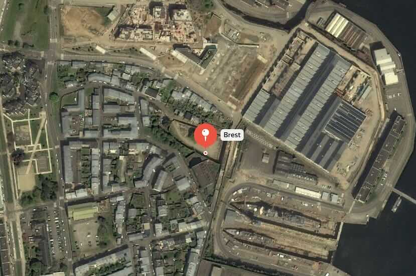 Fortress of Brest. A plan of this powder magazine built under Vauban was discovered by chance in the Navy archives in Brest (Génie, series Z, F 34). The storage room had an ogival shape and was 29.3 m in length for a width of 8.20 m. It was updated to the standards of the 1874 model by the addition of an entrance sas and lateral galleries covering the six original buttresses. A German plan dating from 1899, published in the small work by Alain Boulaire (see bibliography), p.13, shows it, right bank of the Penfeld, south of the docks of the pointe du Salou, i.e., in the Recouvrance district which was razed during the heavy fighting of 1944. Two other similar magazines suffered the same fate, namely those of Bouguen and the Pépinière.