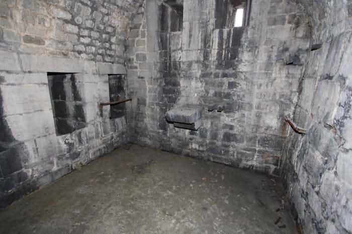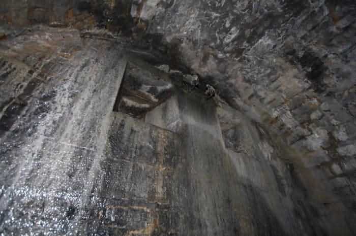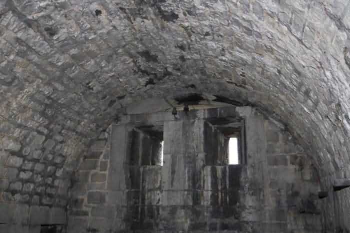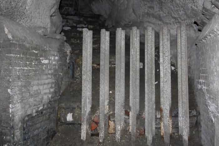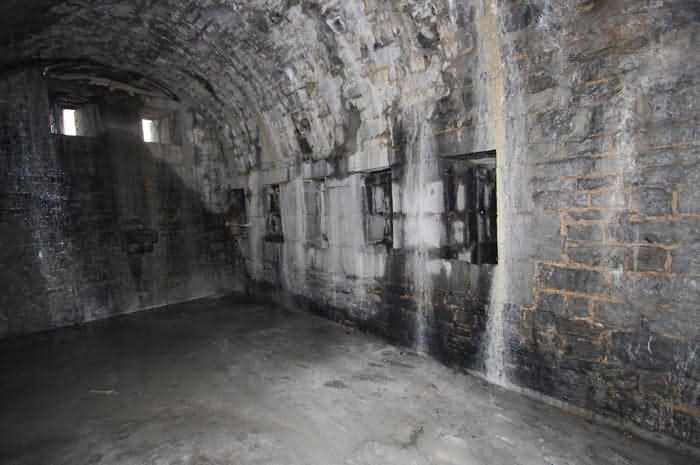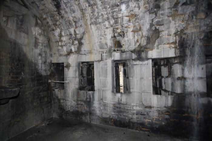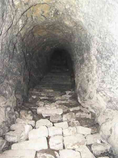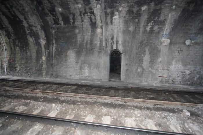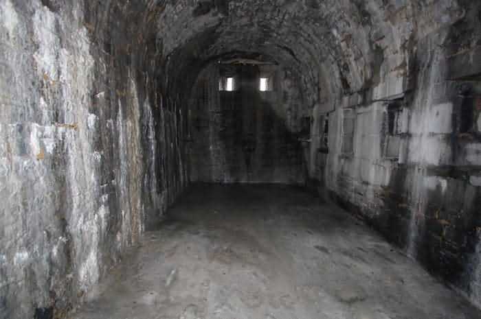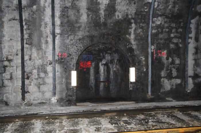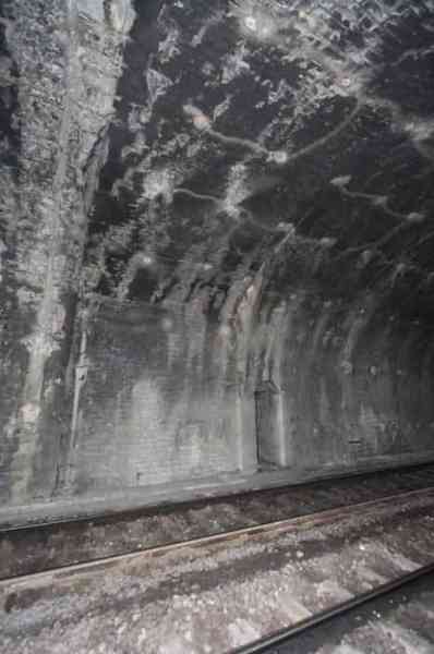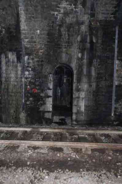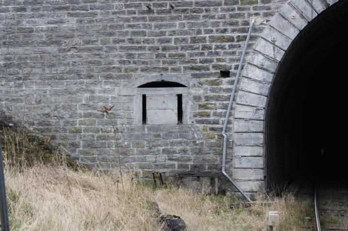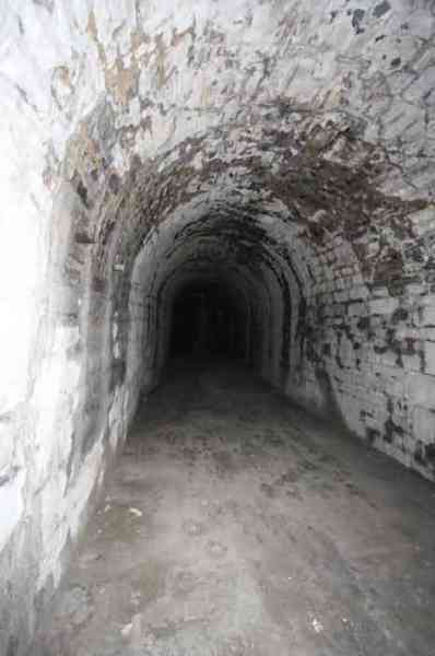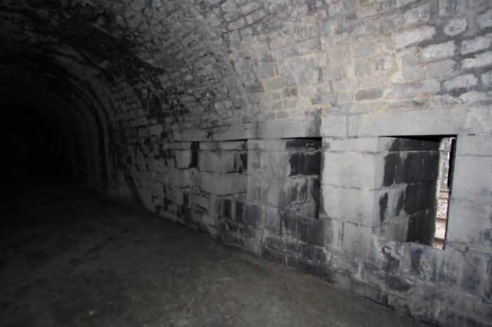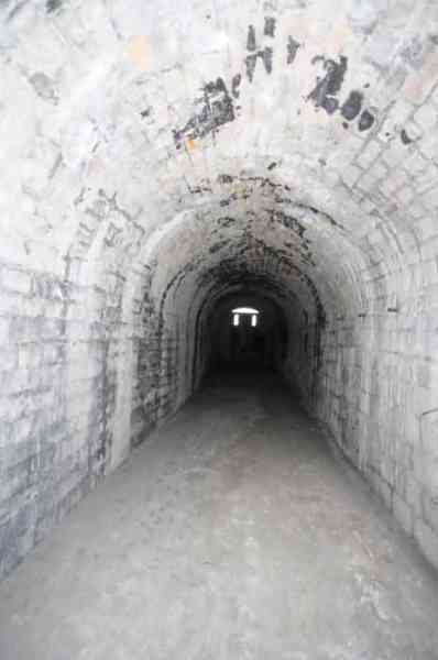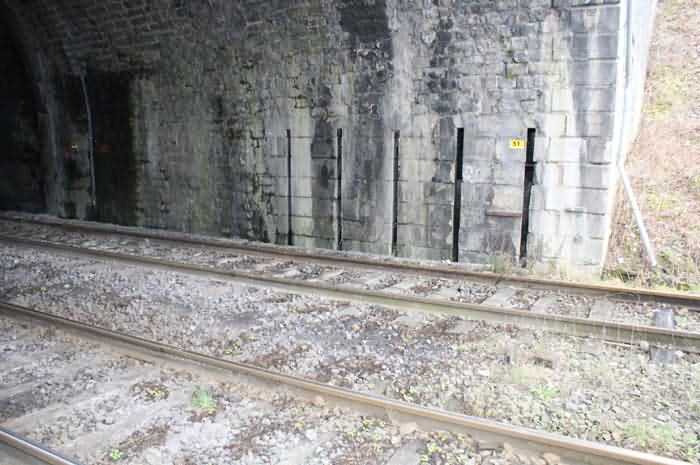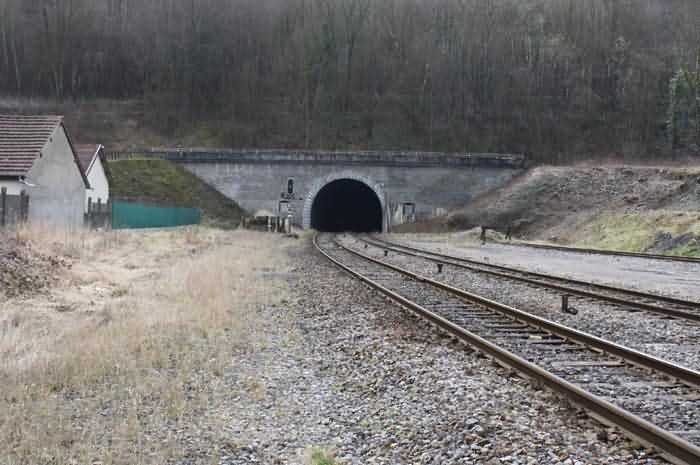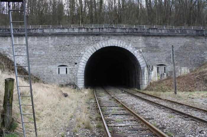 Dept 08 (Ardennes), 1862. With a length of 850 metres, this tunnel, commissioned in 1863, allowed the connection between the Belgian and French railway networks via the Meuse valley. This tunnel passes beneath the Charlemont fortress. On the Belgian border side, on either side of the entrance, a casemate about twenty metres long by 3.5 m wide was provided. These casemates each have two rifle loopholes defending the approach to the tunnel and five other loopholes blocking the entrance to the tunnel. Between these loopholes and the access doors to the casemates, the tunnel was to be capable of being barred by strong doors, a possibility of which only a masonry ledge bears witness today (03/2009). A system of mine chambers exists in the crown of the vault. Access is via a shaft opening in the keystone where a sliding ladder is still in place. About 200 m from the north entrance, a staircase barred by a grid emerges in the west flank. This is the access to the fort; 407 steps for the most part (at least in the lower part) disrupted by decades of almost continuous water seepage. This staircase emerges opposite the easternmost of the rock-cut magazines contained within the fort. We doubt this is anything other than a possible exit for the garrison. Indeed, the width of the gallery and, above all, the total absence of fittings such as a cemented slope with rails, does not indicate any real provision or intention to supply the fort's garrison, which numbered nearly 3,000 men. The hypothesis of carrying supplies and/or ammunition on men's backs through this passage, although theoretically possible, urges us to be cautious and not too categorical. According to the Nord-Belge review of 1929, this tunnel was initially single-track. Its conversion to double track is said to have been done by the occupier during the First World War. Still in service, it is obvious that this tunnel is off-limits.