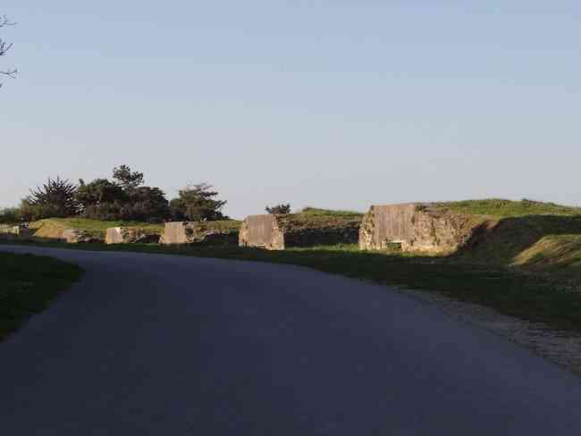Place de Lorient, Belle-Île. Peu d’informations sur cette batterie ont filtré jusqu’à nous, à tel point qu’il nous a fallu passer à côté pour en apprendre l’existence. Elle se situe sur le territoire de la commune du Palais, entre la porte de Secours de la citadelle et la lunette E. Il s’agit manifestement d’une construction remontant à environ 1890 laquelle consiste en un alignement de plates-formes de tir séparées par des traverses pleines à la racine desquelles une niche à munitions a été aménagée et recouverte d’une dalle de ±100 cm de béton. Alignée le long de la route d’accès à la porte de Secours, parallèlement à l’enceinte de l’ancienne colonie pénitentiaire pour enfants (qui eut cette fonction de 1880 à 1977) dont elle tire son nom, elle a probablement été construite en deux temps. En effet, aux quatre plates-formes prévues pour, chacune et selon la Société Historique locale, accueillir un canon de 120 L de Bange, succèdent, sur la gauche (vers l’ouest) et au-delà du petit local pour téléphoniste et du poste de direction de tir -doublé ici-, deux autres plates-formes réputées prévues pour deux canons de 95 mm sur affût de campagne. Nous n’avons pu relever de différence marquante dans les maçonneries des deux parties accolées mais la présence de béton dans la partie orientale pourrait signifier sinon une construction plus tardive, au moins une éventuelle modernisation. La batterie n’a plus ses cotes d’origine, les niches n’étant presque plus visibles à cause du rehaussement du niveau du sol nécessité par l’établissement de l’actuelle chaussée. Bien assise à une vingtaine de mètres d’altitude, la batterie protégeait de ses tirs directs les approches du port du Palais. Elle pouvait puiser ses approvisionnements en obus et poudre propulsive dans les magasins de la citadelle et de son enveloppe. Sur ses devants et en contrebas, on trouve un ancien stand de tir ainsi que l’emplacement de l’ancienne batterie Hoche, aménagée en 1801 et déclassée en 1874 (voir Belle-Île). La batterie de la Colonie, acquise simultanément avec la citadelle par M. André Larquetoux le 12 août 1960, a été restaurée par ce dernier. Elle est aujourd’hui (04/2012) d’accès libre et se prête merveilleusement au pique-nique.