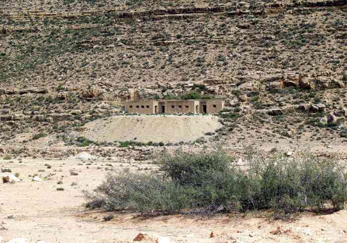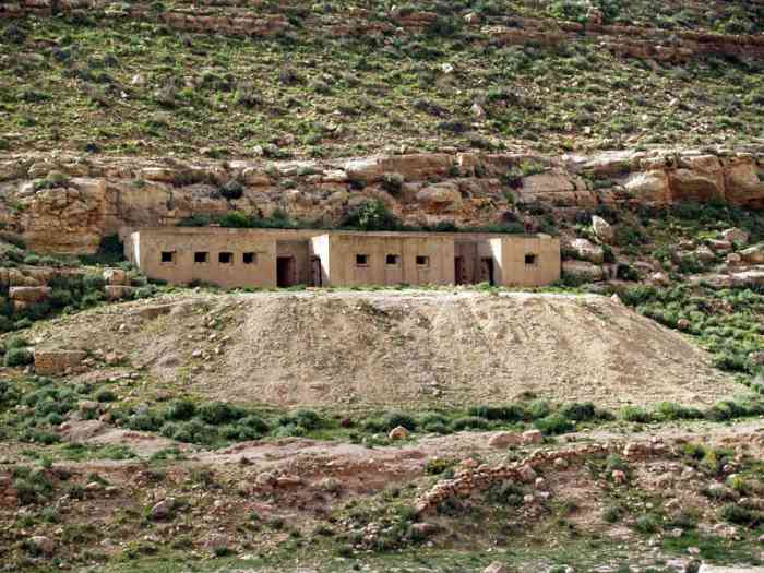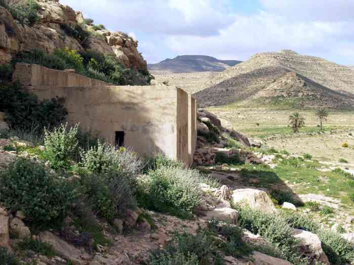 Mareth. PC de régiment du secteur Ouest, situé à quatre kilomètres en arrière de la ligne principale de résistance, à la cote 329. Il mesure vingt-sept mètres sur trois, et comprend, sur son arrière, une partie souterraine en U, comportant quatre pièces. Il a visiblement servi d’abri aux troupes de l’Axe, car ses murs sont couverts de fresques, dont l’origine ne fait aucun doute. Il s’agissait vraisemblablement du PC, prétendument localisé à la cote 147. Un poste optique est installé à proximité. En juin 1940, il est occupé par le colonel commandant le 32e RTT, et par son état-major. Regimentsgefechtsstand des Westsektors, vier Kilometer hinter der Hauptwiderstandslinie gelegen, auf Höhe 329. Er misst siebenundzwanzig mal drei Meter und umfasst auf seiner Rückseite einen unterirdischen U-förmigen Teil mit vier Räumen. Er hat offensichtlich den Achsentruppen als Unterstand gedient, da seine Wände mit Fresken bedeckt sind, deren Herkunft unzweifelhaft ist. Es handelte sich vermutlich um den angeblichen Gefechtsstand auf Höhe 147. In der Nähe ist ein optischer Posten installiert. Im Juni 1940 wurde er von dem Oberst, der das 32. RTT kommandierte, und seinem Stab bewohnt. Regimentscommandopost van de sector West, gelegen op vier kilometer achter de hoofdweerstandslijn, op hoogte 329. Hij meet zevenentwintig bij drie meter en omvat aan zijn achterzijde een ondergronds U-vormig deel met vier kamers. Hij heeft klaarblijkelijk gediend als onderkomen voor de troepen van de As, want zijn muren zijn bedekt met fresco's, waarvan de oorsprong niet twijfelachtig is. Het was vermoedelijk de commandopost, zogenaamd gelokaliseerd op hoogte 147. Een optische post is in de buurt geïnstalleerd. In juni 1940 wordt hij bezet door de kolonel commandant van het 32e RTT en door zijn staf. Regimental command post of the Western sector, located four kilometres behind the main line of resistance, at contour 329. It measures twenty-seven metres by three, and comprises, on its rear, a U-shaped underground part, containing four rooms. It has visibly served as a shelter for the Axis troops, as its walls are covered with frescoes, whose origin is beyond doubt. It was presumably the command post, supposedly located at contour 147. An optical post is installed nearby. In June 1940, it is occupied by the colonel commanding the 32nd RTT, and by his staff. Plukovní velitelské stanoviště západního úseku, nacházející se čtyři kilometry za hlavním obranným postavením, na kótě 329. Měří dvacet sedm krát tři metry a zahrnuje na své zadní straně podzemní část do tvaru U se čtyřmi místnostmi. Viditelně sloužilo jako úkryt pro vojska Osy, protože jeho stěny jsou pokryty freskami, jejichž původ je nesporný. Pravděpodobně se jednalo o velitelské stanoviště, údajně lokalizované na kótě 147. V blízkosti je instalováno optické stanoviště. V červnu 1940 je obsazeno plukovníkem velícím 32. pluku RTT a jeho štábem. © JJM 05/03/2026