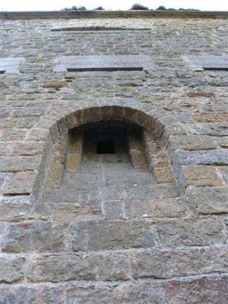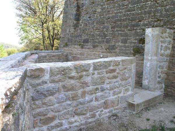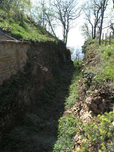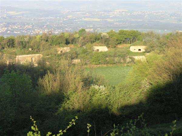 Fortress of Lyon, north-northwest of the city, 1874-1877. 588 m/alt. 41 men, 6 guns. Located a short distance southwest of Fort Mont Verdun and has commanding views of Fort Paillet. Irregular pentagon with unflanked ditches. Semi-detached scarp at the gorge, attached on the other fronts. The scarp and counterscarp are not revetted and clearly reveal the battery's foundation composed of gryphaea limestone (Sinemurian). The head front has no counterscarp as it is preceded by a pronounced slope. The entrance, marked by two pilasters, leads directly into the courtyard. Three shelter-traverses of 11 x 3.5 m (the one near the barracks is one meter longer) possess a singular niche on their left facade, reminiscent of the traverses of the neighboring fort. The barracks consist of three quarters of 11 x 5.5 m separated by piers 1 m thick. Each quarter includes three rifle loopholes and three small foot-level loopholes. This barracks, which is moreover very aesthetic, is surrounded by an 80 cm wide sanitary gallery. The carcass of an old stove was removed from a pile of rubble lying in the battery. The site is now managed by the association "Limonest Patrimoine" (as of 04/2007) and is being reborn from its ashes. The walls have been cleared of their tags, the most fragile masonry has been restored, and vegetation has been contained. This is a most commendable initiative as the defensive barracks are a genuine little marvel.
