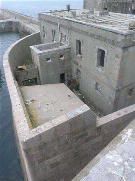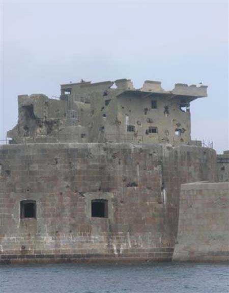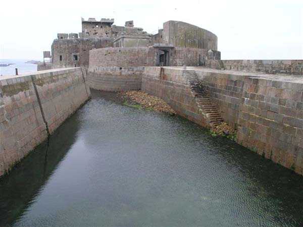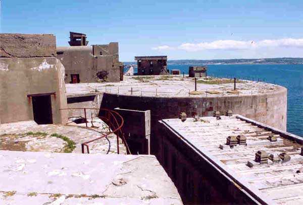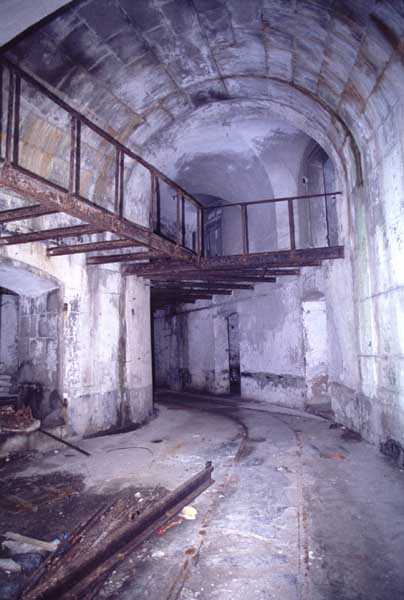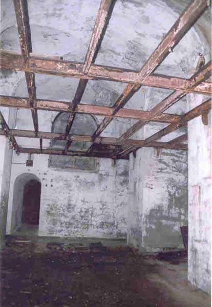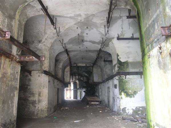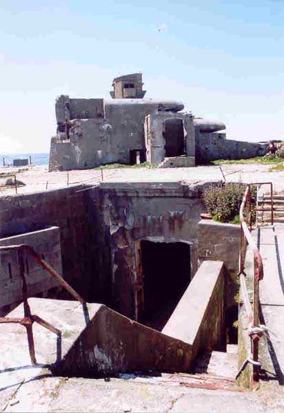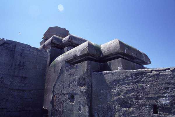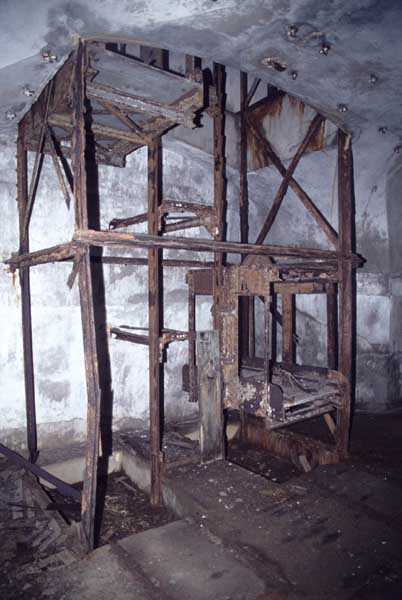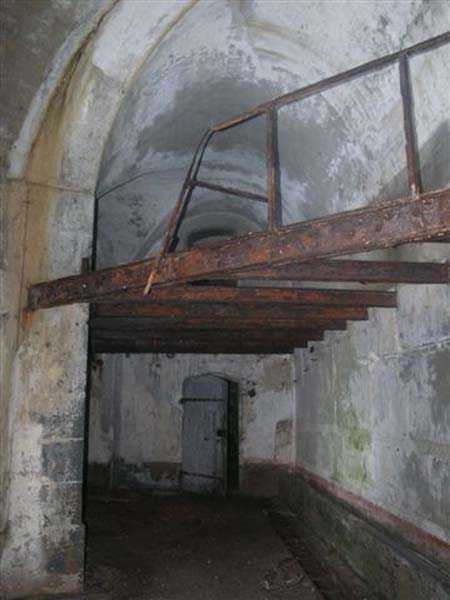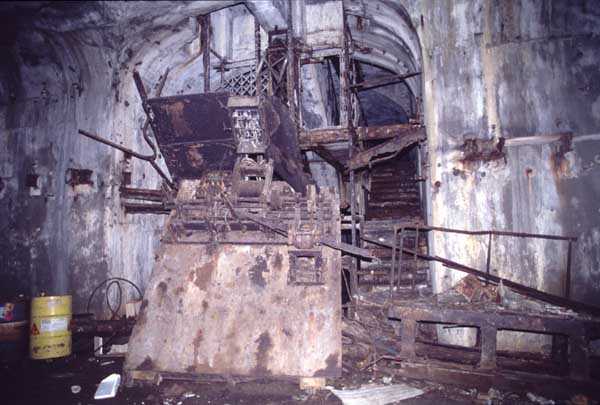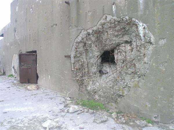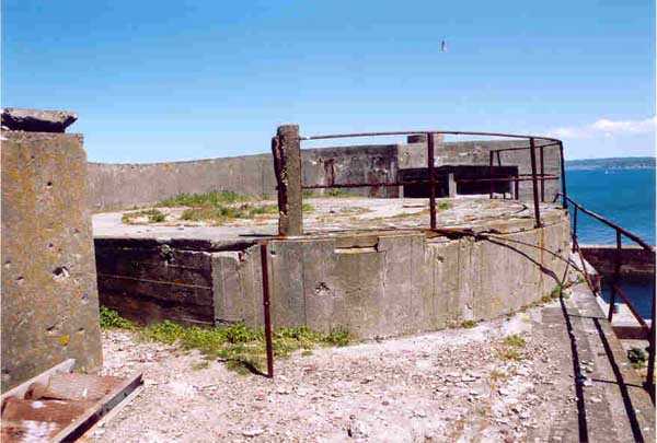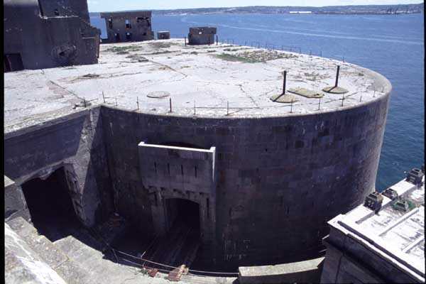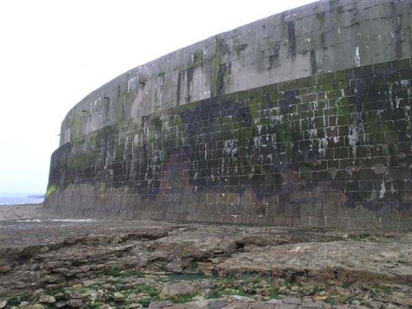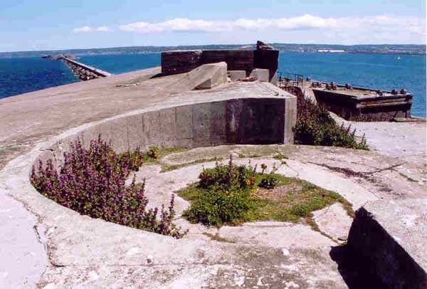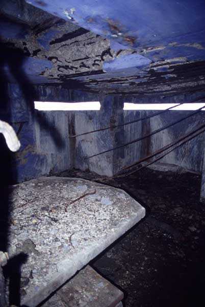 Fortress of Cherbourg, north of the city. A first fort was inaugurated on August 16, 1804. It was called "Bonaparte Battery" and then "Napoleon Battery." This battery was destroyed in February 1808 by a storm that left 176 (246?) dead. It was not until the July Monarchy that work resumed to erect a fort with two levels of casemates topped with barbette-firing guns, all arranged around an oval courtyard. This fort was completed in 1859. Around 1890, the height of the redoubt was reduced before pouring a 3 m thick concrete slab, enclosing the central courtyard, the redoubt, and the front-line battery. On either side, to the rear, two new barracks measuring 18 x 7 m were built, replacing the existing ones. The shape of the fort is an oval semicircle with, at the throat, an oval concrete redoubt projecting. It has a length of 130 m and a maximum width of 70 m. Its location and the fact that access is prohibited have preserved it from many problems, so it is one of the structures that suffered the least from reinforcement. Thus, in June 2007, one could observe: two Poncelet bridges (access to the redoubt), practically all the freight elevators, several gun carriages from the Second World War, an almost complete electrical plant with its ALSTHOM motor, a François-Vaillant furnace model 1887 type C or D, … This is without counting the very numerous door frames with the designations of the premises in German, as well as a splendid fresco also dating from the German occupation. The coal store still contains several cubic meters of this fuel. The redoubt, although modernized, nonetheless retained its deadmen at each of its entrances. In the central gallery, an enormous metal mass rests at a 45° angle in the center of the fort. It is a winch whose southern supports were cut by the ironworkers. The supports on the north side of the gallery bent under the weight. This winch surmounted the 0.80 m railway track which crossed the fort in its length and must have had a serious lifting capacity. The entire northern part of the fort is devoted to the ammunition and charges of the batteries installed on the tops of the fort. Here too, the freight elevators are present and, it must be admitted, we have rarely encountered so many metal remains. However, many beams were cut with a blowtorch. As the recovery was carried out from top to bottom, the metal salvagers attacked many beams supporting the floors of the first floor, but, clearly, they were unable to complete their work of destruction… to our great delight. The freight elevators are still there, as are the grilles, shutters, shelves for the loads, not to mention the door frames,… The fort's armament was installed entirely on its superstructures. We only have precise details from 1904, namely 6 x 32 c guns in two groups of three and two batteries of 4 x 100 mm rapid fire. The 32 c guns were installed on either side of the central fire director position, while the 100 mm batteries occupied the sides of the sky slab. All these guns fired barbettes. We counted at least five access routes to these tops. The sky slab is impressive with its enormous command and fire direction post which has two narrow visors at sea. This behemoth is none other than the fire direction post of the Castel Vendon battery surprised in 1940 by the Germans in full construction, 12.5 km further west. The lower visor controlled the four 138 mm guns installed on the fort in the 1930s and only the upper one was to be used for Castel Vendon. Inside this PdT, we find on the walls the blue color typical of the constructions of the French Navy of the interwar period. A ceiling served as a support for a compass rose and several armored doors escaped the scrap dealers. The German occupier went there with its parasitic constructions such as this anti-aircraft defense tower behind and to the east of the PdT. Thus, in the interwar period, the tops were modified. On each side of the PdT, the 138 mm guns were separated by anti-aircraft defense guns. Despite this, at least two sub-saddles of P.A. model 1882 carriages for 32 c guns are still there, in fact the outer ones of groups of three which in no way hindered the installation of the 138 guns. At the height of the latter, the parapet was modified and we will note duck-step stairs. At the location of the left anti-aircraft gun, we can still see, aimed at the city of Cherbourg, a German 37 mm cannon whose state of preservation astonished us. It should be noted that in 1944, the last German defenders of the Festung Cherbourg entrenched themselves here. The U.S. troops bombarded the Central Fort as evidenced by the numerous impacts in the Flak tower, but also on the granite facing at the rear of the fort. In this regard, it is worth noting two impacts close to each other near the eastern entrance. These impacts, probably from the 57 or 75 mm, are surprisingly little damaged. One hit a rubble stone in the center, the other near a corner. If the second blasted about two cubic decimeters of granite, the first had no other effect than to dig with its splinters diverging lines of little depth in the stone. Good concrete would not have behaved better. The right anti-aircraft tank still houses the metal cross supporting a carriage for a 37 mm Flak 36 gun. Another cross, with a carriage this time, is tilted near the right front of the PdT. From the rear of this PdT, one can return to the first floor of the front-end magazines, but be careful, the staircase is very narrow with its steps covered in guano and when one takes it from outside, the eyes must get used to the darkness and no railing comes to your aid although on each side there is nothing. On either side of the fort there is a small docking port whose pierheads each received two 47 T.R. cannons. These pierheads retain no trace of them. It should also be noted that the three forts on the dike were connected to this dike by a cofferdam topped with a lady, that today there remains only one having