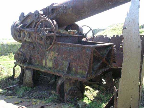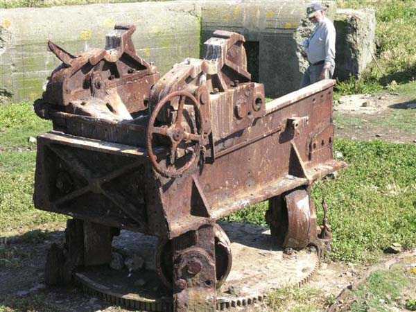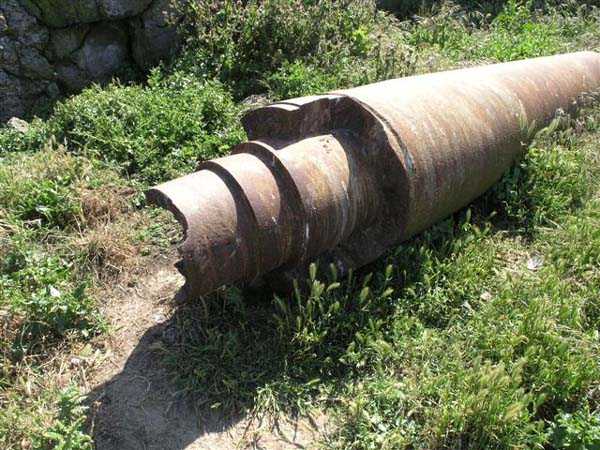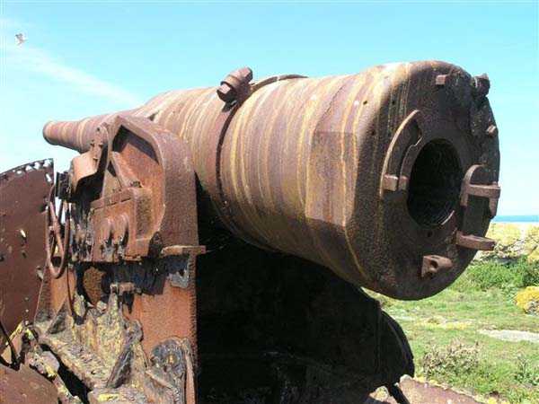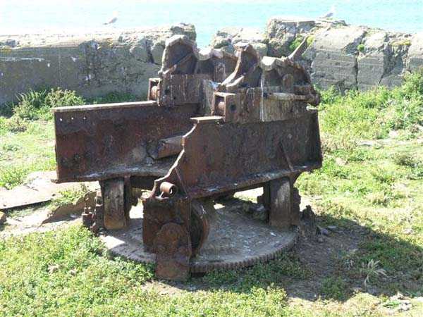 Festung von Saint-Malo, 4200 m nordwestlich der Altstadt. Es war nicht einfach, Informationen über diese Insel zu sammeln, die 1944 in die Geschichte eingehen sollte. Sie ist 250 m lang und durchschnittlich 38 m breit. Sie besteht aus zwei Hügeln, die jeweils 38 m über dem Meeresspiegel liegen und durch eine Senke verbunden sind. Auf dem westlichen Hügel wurde ein Wachhaus, Modell 1846 Nr. 1, errichtet, während der östliche ein Wachhaus Nr. 2 erhielt. Wir konnten weder die Baujahre dieser Wachhäuser noch Hinweise auf ihre Bewaffnung herausfinden. 1888 schlug der Hohe Kriegsrat vor, dort eine Festungsstellung zu errichten, ein Vorschlag, der 1890 umgesetzt wurde. Der westliche Hügel wurde zum Eckpfeiler der Küstenverteidigung der Korsarenstadt, da er die beiden einzigen großkalibrigen Batterien an diesem Ort beherbergte. Nur wenige Meter rechts vom noch erhaltenen Wachhaus, senkrecht dazu, wurde ein Geschossschuppen errichtet. Links vom Wachhaus, in Richtung Südwesten, wurde eine Reihe von vier 24c-Geschützstellungen angelegt, die durch solide Querstreben voneinander getrennt waren, an deren Fuß sich lediglich eine Nische zum Schutz der Sicherheitsgeschosse befand. Am nördlichen Ende dieser Reihe wurde ein kleines Felsmagazin ausgehoben. Immer noch nach Südwesten ausgerichtet, aber hinter dem Wachhaus, wurden zwei Plattformen für jeweils zwei 90-mm-Geschütze auf Feldlafetten vorbereitet. Hinter diesen, aber nach NNW ausgerichtet, befand sich eine Reihe von drei Feuerstellungen für 27c-Mle-1887-Mörser auf P.C.-Lafetten. Diese Mörser hatten links von ihnen ihr eigenes Felsmagazin. Auch auf dem östlichen Hügel blieb sein Wachhaus erhalten, hinter dem zwei Batterien mit jeweils 4 x 95-mm-Geschützen auf Doppelplattformen aufgestellt wurden. Zwischen 1916 und 1918 konnte Belgien die Insel nutzen, um flämische Soldaten zu internieren, die Anzeichen von Unabhängigkeit zeigten. Das Lager wurde in der Senke in der Mitte der Insel errichtet, während die großen Artilleriegeschütze in Richtung Front gerichtet waren. Während der Besatzung im Zweiten Weltkrieg zerstörten die Deutschen die französischen Anlagen und installierten sechs 194-mm-Geschütze M Modell 1870-93 auf M Modell 1866 P.C.-Lafetten, ex-ALVF, in offenen Panzern. Cézembre, die letzte Bastion des Nazi-Widerstands in Ille-et-Vilaine, hatte das traurige Privileg, zusammen mit der Cité die ersten Phosphor- und Napalmangriffe zu erleiden. Es hielt als einziges den US-Truppen vom 13. August bis 2. September 1944 stand. Während dieser ganzen Zeit vernichteten die Bombenangriffe die letzten oberflächlichen Spuren der französischen Batterien. Wachhaus Nr. 1 ist heute pulverisiert, während die hintere Hälfte von Nr. 2 noch steht. Dieses Überbleibsel lässt nicht nur erkennen, dass die Deutschen es mit einer Betonhülle abgedeckt hatten, sondern auch, dass das kleine ursprüngliche Pulvermagazin um 1890 umgebaut und mit einer Schießscharte für Laternen versehen wurde. Die beiden Steinmagazine von 1890, die die Deutschen in ihr System einbauten, sind noch vorhanden, aber schwer zugänglich. Obwohl das Innere der Insel mehreren Minenräumaktionen unterzogen wurde, ist der Zutritt verboten. Bei unserem Besuch im Juni 2007 versperrte ein neuer Zaun jeglichen Zugang, und nur der kleine Strand zum Festland war frei zugänglich. Die Orte sind fast in ihrem Zustand von 1944 erhalten geblieben, und die Auswirkungen der Bombenangriffe auf die Artilleriegeschütze sind beeindruckend. Es ist mehr als bedauerlich, bestimmte Geschütze, die heute einen hohen historischen Wert haben, auf diese Weise verrotten zu lassen. Wir denken insbesondere an das fast intakte 194-mm-Geschütz auf dem östlichen Hügel. Es könnte zurückgebracht, restauriert und in der Gedenkstätte des Fort de la Cité in Saint-Servan ausgestellt werden… Geld, immer wieder Geld…. Zumindest kommt dieses Verbot der Vogelpopulation und der nitrophilen Vegetation zugute. Cézembre ist wahrscheinlich die wichtigste französische Station des Schwarzen Bilsenkrauts (Hyoscyamus niger).