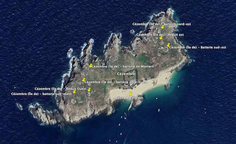 Pevnost Saint-Malo, 4200 m severozápadně od starého města. Nebylo snadné shromáždit informace o tomto ostrově, který vešel do historie v roce 1944. Je dlouhý m a má průměrnou šířku 250 m a skládá se ze dvou pahorků, z nichž každý vrcholí v nadmořské výšce 38 m a je spojen prohlubní. Na západním pahorku byla postavena strážnice, model 1846 č. 1, zatímco na východním č. 2. Nepodařilo se nám najít roky výstavby těchto strážnic ani žádné údaje o jejich výzbroji. V roce 1888 navrhla Nejvyšší rada války zřídit zde silnou pozici, tento návrh následoval v roce 1890. Západní pahorek se stal ústředním bodem pobřežní obrany korzárského města, protože hostil jediné dvě velkorážní baterie v místě. Jen několik metrů napravo od dochované strážnice, kolmo k ní, byla instalována střelnice. Nalevo od strážnice, směrem na jihozápad, byla vytvořena řada čtyř dělostřeleckých stanovišť kalibru 24c, oddělených pevnými příčkami, u jejichž paty byl pouze výklenek pro krytí bezpečnostních střel. Na severním konci této linie byl vykopán malý kamenný zásobník. Stále směrem na jihozápad, ale za strážnicí, byly připraveny dvě plošiny, každá pro dva 90mm kanóny na polních lafetách. Za nimi, ale směrem na severozápad, se nacházela řada tří palebných stanovišť pro minomety ráže 27c mle 1887 na polních lafetách. Tyto minomety měly po levé straně vlastní kamenný zásobník. Východní pahorek si také zachoval svou strážnici, za níž byly rozmístěny dvě baterie, každá se 4 x 95mm kanóny na dvojitých plošinách. V letech 1916 až 1918 mohla Belgie ostrov využívat k internaci vlámských vojáků, kteří projevovali známky nezávislosti. Tábor byl zřízen v prohlubni uprostřed ostrova, zatímco velké dělostřelecké kusy byly namířeny dopředu. Během okupace za druhé světové války Němci narušili francouzské instalace a nainstalovali šest kanónů M ráže 194 mm model 1870-93 na lafetách M model 1866 PC, ex-ALVF, v otevřených tancích. Cézembre, poslední bašta nacistického odboje v Ille-et-Vilaine, měla smutnou výsadu, že spolu s Cité utrpěla první bombardování fosforem a napalmem. Jediná odolala americkým vojskům od 13. srpna do 2. září 1944. Během celé této doby bombardování vymazalo poslední povrchové stopy francouzských baterií. Strážnice č. 1 je nyní rozdrcena na prach, zatímco zadní polovina budovy č. 2 zůstala zachována. Tato stopa nám umožňuje vidět nejen to, že ji Němci zakryli betonovou skořepinou a že malý původní prachový sklad byl kolem roku 1890 přestavěn přidáním střílny pro lampu. Dva kamenné prachové sklady z roku 1890, které Němci zahrnuli do svého systému, jsou stále zde, ale obtížně přístupné. Přestože ostrov prošel několika odminovacími kampaněmi, je do vnitrozemí zakázán přístup. Během naší návštěvy v červnu 2007 byl zaveden nový elegantní plot, který zakazoval veškerý průchod a volně přístupná byla pouze malá pláž s výhledem na kontinent. Místa zůstala téměř ve stavu z roku 1944 a dopady bombardování na dělostřelecké zbraně jsou impozantní. Je více než politováníhodné nechat některé kusy takto shnít, i když mají nyní velkou historickou hodnotu. Myslíme zejména na téměř neporušenou dělostřeleckou zbraň ráže 194 mm na východním pahorku. Mohla by být přivezena zpět, restaurována a vystavena v památníku Fort de la Cité v Saint-Servan… Peníze, vždycky peníze…. Tento zákaz alespoň prospívá ptačí populaci i nitrofilní vegetaci. Cézembre je pravděpodobně nejdůležitější francouzskou stanicí blínu černého (Hyoscyamus niger).