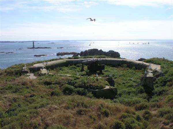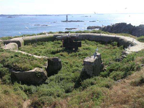 Vesting van Saint-Malo, 4200 m ten noordwesten van de oude stad. Het was niet eenvoudig om informatie te verzamelen over dit eiland, dat in 1944 de geschiedenis in zou gaan. Het is 1,5 m lang en gemiddeld 250 m breed. Het bestaat uit twee heuvels, elk met een hoogteverschil van 38 m/hoogte, verbonden door een dal. Op de westelijke heuvel werd een wachthuis gebouwd, model 1846 nr. 1, terwijl op de oostelijke een nr. 2 werd gebouwd. We konden de bouwjaren van deze wachthuizen niet vinden, noch enige aanwijzingen over hun bewapening. In 1888 stelde de Hoge Raad voor de Oorlog voor om daar een sterke positie te vestigen, een voorstel dat in 1890 werd gevolgd. De westelijke heuvel werd de hoeksteen van de kustverdediging van de kapersstad door de enige twee batterijen van groot kaliber op de locatie te huisvesten. Slechts een paar meter rechts van het bewaard gebleven wachthuis, loodrecht daarop, werd een projectielenloods geplaatst. Links van het wachthuis, op het zuidwesten gericht, werd een rij van vier 24 mm geschutsopstellingen gecreëerd, gescheiden door massieve dwarsbalken. Aan de basis daarvan was slechts een nis voorzien om de veiligheidsschoten te beschermen. Aan het noordelijke uiteinde van deze rij werd een klein rotsmagazijn gegraven. Nog steeds op het zuidwesten gericht, maar achter het wachthuis, werden twee platforms voorbereid, elk voor twee 90 mm kanonnen op veldgeschut. Daarachter, maar naar het noordnoordwesten gericht, bevond zich een rij van drie vuurpunten voor 27 mm MLE 1887 mortieren op P.C.-geschut. Deze mortieren hadden links hun eigen rotsmagazijn. De oostelijke heuvel behield ook zijn wachthuis, waarachter twee batterijen waren opgesteld, elk met 4 x 95 mm kanonnen op dubbele platforms. Tussen 1916 en 1918 kon België het eiland gebruiken om Vlaamse soldaten te interneren die tekenen van onafhankelijkheid vertoonden. Het kamp werd opgezet in de holte in het midden van het eiland, terwijl de grote artilleriestukken naar voren werden gericht. Tijdens de bezetting van de Tweede Wereldoorlog verstoorden de Duitsers de Franse installaties en installeerden zes M 194 mm kanonnen van het model 1870-93 op M model 1866 P.C.-onderstellen, ex-ALVF, in openluchttanks. Het laatste bastion van het nazi-verzet in Ille-et-Vilaine, Cézembre, had het droevige voorrecht om, samen met de Cité, de eerste fosfor- en napalmbombardementen te ondergaan. Het was de enige die de Amerikaanse troepen van 13 augustus tot 2 september 1944 weerstond. Gedurende al die tijd hebben de bombardementen de laatste sporen van de Franse batterijen uitgewist. Wachthuis nr. 1 is nu verpulverd, terwijl de achterste helft van nr. 2 nog steeds bestaat. Dit overblijfsel laat ons niet alleen zien dat de Duitsers het hadden bedekt met een betonnen granaat en dat het kleine oorspronkelijke kruitmagazijn rond 1890 was omgebouwd met de toevoeging van een schietgat voor lampen. De twee rotsmagazijnen uit 1890, die de Duitsers in hun systeem hebben opgenomen, zijn er nog steeds, maar moeilijk toegankelijk. Hoewel er meerdere mijnenruimingscampagnes hebben plaatsgevonden, is het binnenland van het eiland verboden terrein. Tijdens ons bezoek in juni 2007 verbood een nieuw, slim hek alle doorgang en was alleen het kleine strandje tegenover het vasteland vrij toegankelijk. De plaatsen zijn vrijwel in de staat van 1944 gebleven en de gevolgen van de bombardementen op de artilleriestukken zijn indrukwekkend. Het is meer dan betreurenswaardig dat bepaalde stukken, die nu een grote historische waarde hebben, op deze manier zijn vergaan. We denken in het bijzonder aan de vrijwel intacte 194 mm-granaat op de oostelijke heuvel. Deze zou kunnen worden teruggebracht, gerestaureerd en tentoongesteld bij het monument van Fort de la Cité in Saint-Servan… Geld, altijd geld…. Dit verbod komt in ieder geval de vogelpopulatie en de stikstofminnende vegetatie ten goede. Cézembre is waarschijnlijk de belangrijkste Franse bron van zwart bilzekruid (Hyoscyamus niger).