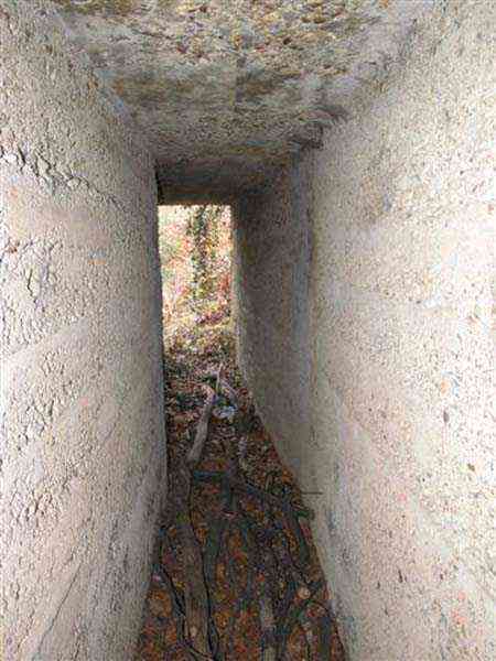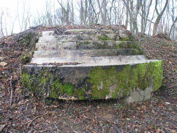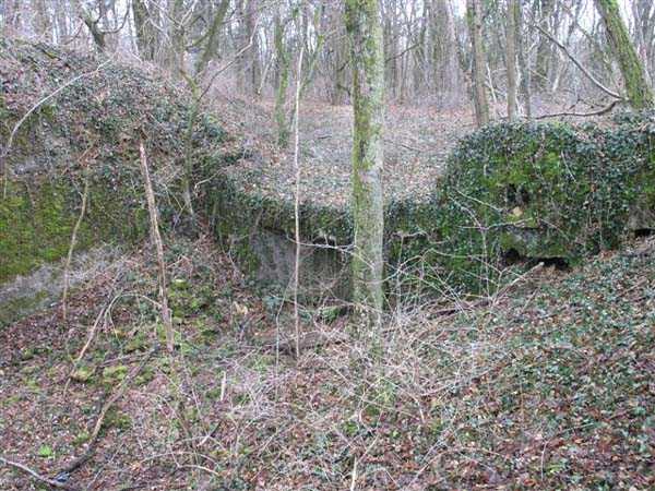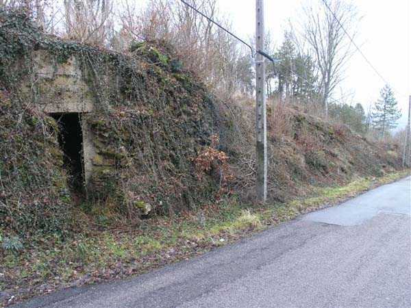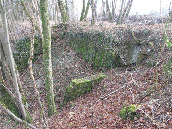 Northwest of Nancy, 600 m northeast of the fort of Frouard, > 1884. 325 m/alt. We were unable to determine precisely the year of construction of this battery, referred to as an "earth battery" in the report of the High Commission of Strongholds of October 17, 1904. This report mentions several things ranging from the possibility of removal, even leveling, to a reorganization of this battery for 4 x 120 mm. At the end of 1908, no firm decision had yet been made and the archives are rich in the prevarications of the different levels of responsibility. Thus, after having given rise to much debate regarding its location, considered too advanced and fueled studies with a view to its replacement, it would eventually be preserved and even significantly improved. Connected by a narrow gauge track (Séverac type) to the Frouard fort, it will retain its initial configuration, its solid sleepers at the root of which a niche has been created for safety shots. The four firing points are located approximately 180 cm lower than the parapet. The parapet shows a notch carrying its sides a good meter higher, at the same level as the top of the sleepers. Parapets and sides of the firing platforms were concreted. However, it should be put into perspective, this is clearly not concrete intended to resist projectiles, but rather earth retaining concrete. Under the parapet, an arc-shaped hollow was created and carefully smoothed with false joints to imitate rubble masonry. Just behind the center of this arc, there are still some fine remains of a Mle 1883 platform with a removable pivot, for a 120 L or 155 L gun with hydraulic brake on siege carriages and a Mle 1880 place. The strangest thing is that the space between the crossbars has been divided. Where there was only one firing platform, a shelter made of masonry and light roofing was attached along the entire length of the crossbar, to the right of the platform, the center of which was consequently moved to the left. These four shelters, with internal dimensions of approximately 5 x 2 m, avoided the expense of leveling and concreting shelters under the crossbars. The entrance to these shelters, particularly narrow, was built against the parapet and, on the side of the traffic lane running along the base of the crossbars, a window provided lighting and ventilation. This circulation path is, like the battery, deeply embedded in the ground. To the right of the battery, we were surprised to discover a covered concrete trench, with a single outlet onto the battery, but three separate entrances leading directly onto the road leading from the village of Champigneulles to the Frouard fort. By taking the rearmost entrance, the visitor is forced to pass through a small room where there are two sinks and a central pillar. The gallery continues until its junction with the diverticulum coming from the second entrance, which first passed through latrines. Then, if we continue forward, we leave on our left the outlet onto the circulation path of the battery before reaching the intersection with the third entrance. The corridor then veers to the left and leads directly into the semicircular room of an observatory whose two crenellations still have their metal shutters. Notches have been made in front of each crenellation for an optical device. While we are barely offset in front of the battery's firing parapets, we take advantage of a setback from the hillside to have magnificent direct views of the Meurthe valley. If the concrete work on the battery is probably later than 1908-1910, but before 1914, on the other hand, for this observatory we remain in suspense. Is it a construction from before or after 1914? At the level of the first entrance to the covered trench, on the other side of the road, two low walls frame the beginning of another trench, open to the sky, whose tortuous network joins an observatory and, at least, a (collapsed) shelter on the front of the battery of Parc Lattier. The Champigneulles battery will be considered poorly located and even at the mercy of a raid. The top of the Raybois ravine, west of the Éperon battery, was proposed as an alternative location. It was also planned to remove the armament and transfer it to one of the three so-called "evacuation" batteries, much closer to the Frouard fort (see the fortified complex of Parc Lattier). While it can operate with direct lines of sight, its shots will inevitably be curved due to the presence of a glacis several dozen meters long between it and the steep hillside of the Meurthe valley. Few of its targets are located on the same plane; most are significantly lower down, where the river flows at elevation 189. Today (01/2008), all of this is freely accessible, but the whole area can only be easily seen in winter, in the absence of vegetation.