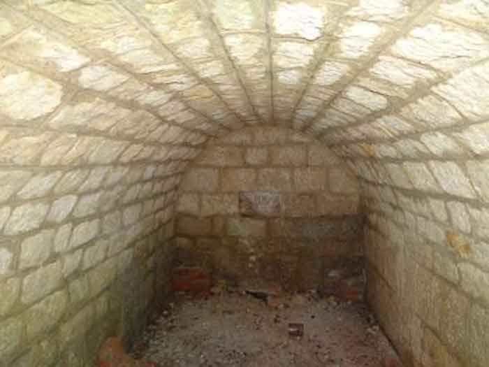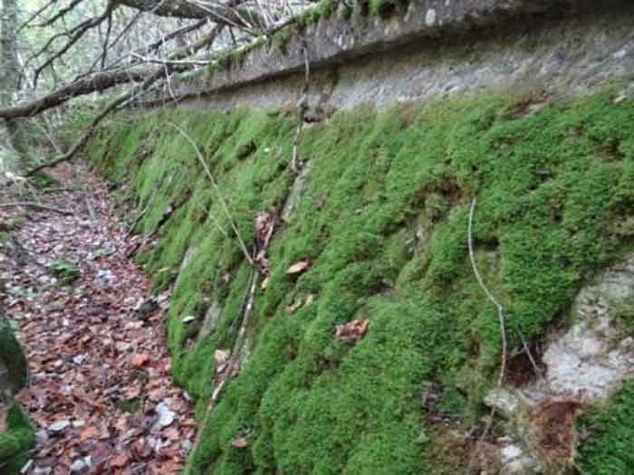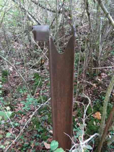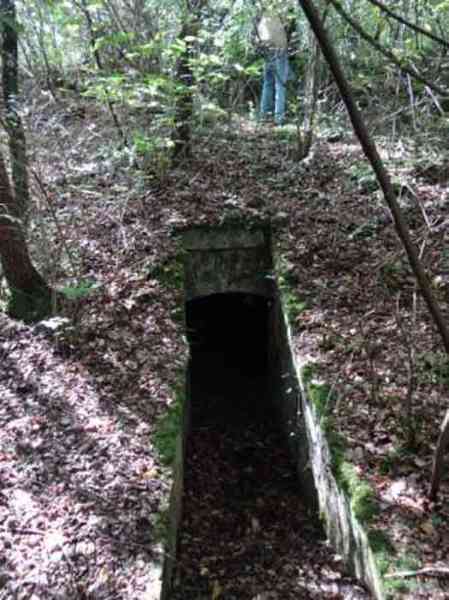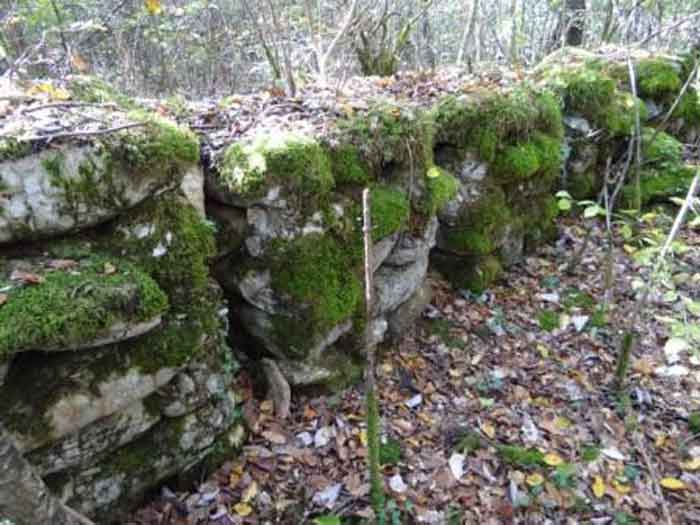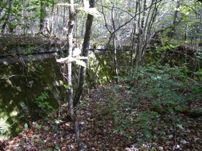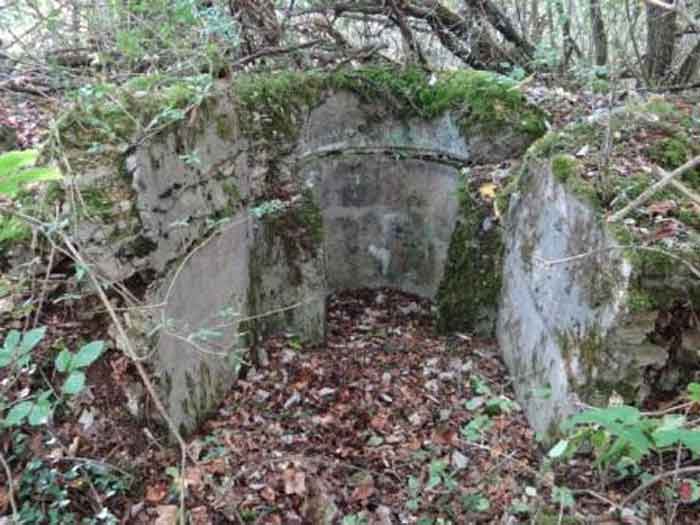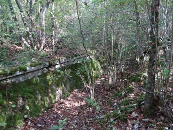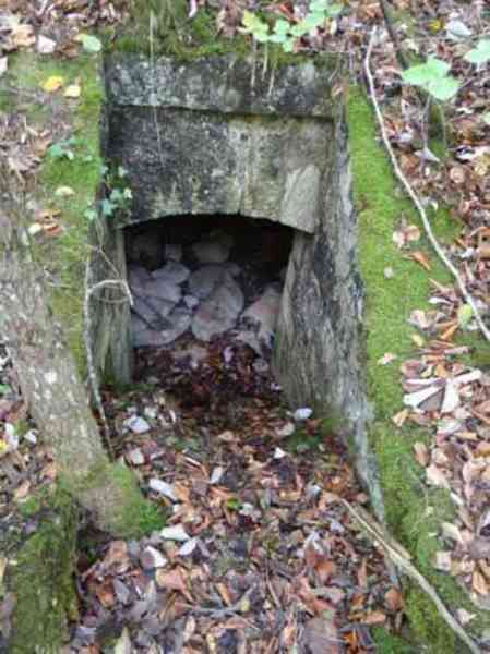 Toul fortified camp, southeast of the city. 294 m alt. Small infantry structure located 750 m SSW of the fort of the same name. Ovoid, it comprises three small section shelters, built of masonry, which are accessed by a staircase of a few steps, placed behind a firing parapet. In front of this parapet, a glacis has been carefully laid out up to a gate in front of a masonry counterscarp wall, approximately 180 cm high. On each side of the structure, beyond the masonry shelters, the parapet has been extended as best it can by a pile of cement bags simply sprinkled with water. The ditch only begins the line of the gorge on the left and right. In the center of this gorge, a similar accumulation of cement bags was created a few decimeters high in a large rectangle, while creating a projection resembling a defensive bastion to the rear. These bags were probably placed during the First World War, with the aim of defending the Toul square. An unprepossessing concrete site seems to have been created for an observation post, but without any real trace of actual installation. The installation of a T 75 was also planned, which was never carried out. Today (10/2012), the structure is still military land, access to which is prohibited by signs. We insist: this prohibition must be respected! Indeed, numerous shells, including mortars, with their fuses, are scattered here and there, most of them under a layer of dead leaves. This place is really not suitable for use. The ditch is still well defined, but the defensive grid has been ribbed. A hideous, dilapidated wooden shack occupies the center of the structure; as for the three masonry shelters, they are not worth the trip. The similar ones in the structures of Gye (but with a bench) or Villey-Saint-Etienne (with a niche in the back wall) are preferable for a visit.