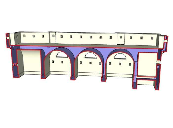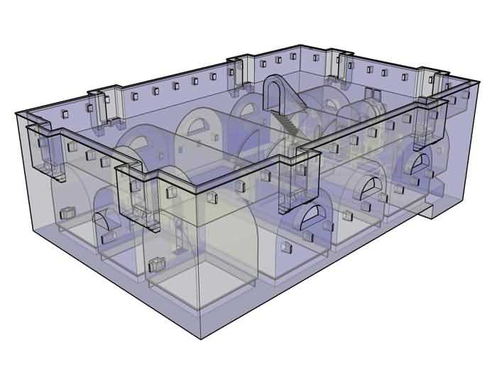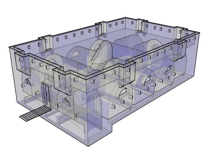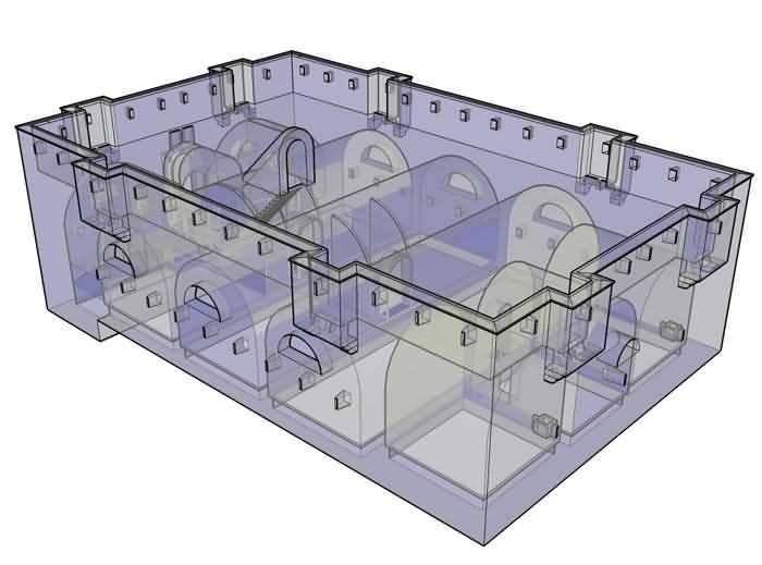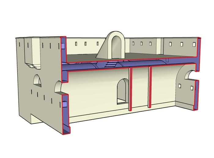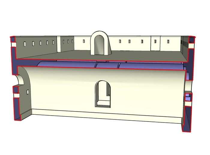 Approximately 150 units will have been built along the coastline. Those built after 1861 will be slightly reinforced by thickening of the interior walls and those surrounding the magazines. They will bear the name guardhouse Model 46/61. When an odd number of guns and/or mortars is allocated, provision is made to arrange the interior space for 50 or 30 men.