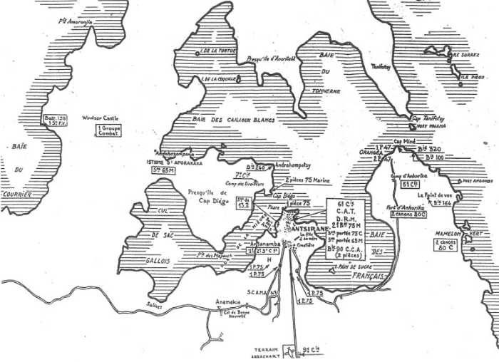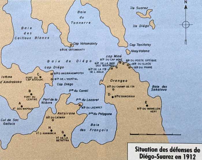 Im Rahmen der Einrichtung der Flottenstützpunkte war die Verteidigung von Diego-Suarez prioritär und wurde tatsächlich als erste fertiggestellt. Unter dem Druck der Faschoda-Krise wurde das Bewaffnungsprogramm geändert und einige der geplanten M-Kanonen 194 mm Mle 1870-93 durch weniger leistungsstarke, aber verfügbare G-Kanonen 19 cm Mle 1875-76 ersetzt. Die Dringlichkeit dieser Umsetzung hatte eine unerwartete Folge. 1914 war die Verteidigung von Diego-Suarez aufgrund der Fortschritte der Artillerie veraltet, und ihre Kanonen mit zu geringer Reichweite und zu langsamer Feuerrate waren völlig überholt. Infolgedessen wurden im Gegensatz zu Dakar, Fort-de-France oder Cap Saint-Jacques, die später gebaut und mit modernerem Material ausgestattet wurden, nur wenige Kanonen von dort abgezogen, um ins Mutterland geschickt zu werden und die schwere Artillerie zu verstärken. Nur die G-Mörser 270 mm Mle 1889 und die M-Kanonen 194 mm Mle 1870-93 der Küstenfront sowie die 155-mm-Langrohrkanonen Mle 1877 und die 95-mm-G-Kanonen der Landfront wurden abgezogen. Alles andere war am Vorabend des Zweiten Weltkriegs noch vorhanden und befand sich auch nach dessen Ende noch dort. Deshalb, aufgrund seiner Insellage und folglich der Schwierigkeit und Kosten der Bergung seines Materials, besitzt der Ort noch sehr schöne Überreste. Nach dem Zweiten Weltkrieg wird sich das Problem der Wiederbewaffnung von Diego-Suarez stellen. Aber die Dinge werden sich in die Länge ziehen, und erst Ende der 1930er Jahre wird man sich entschließen, vom Projekt zur Umsetzung überzugehen. Der Waffenstillstand vom Juni 1940 wird die Arbeiten verlangsamen.