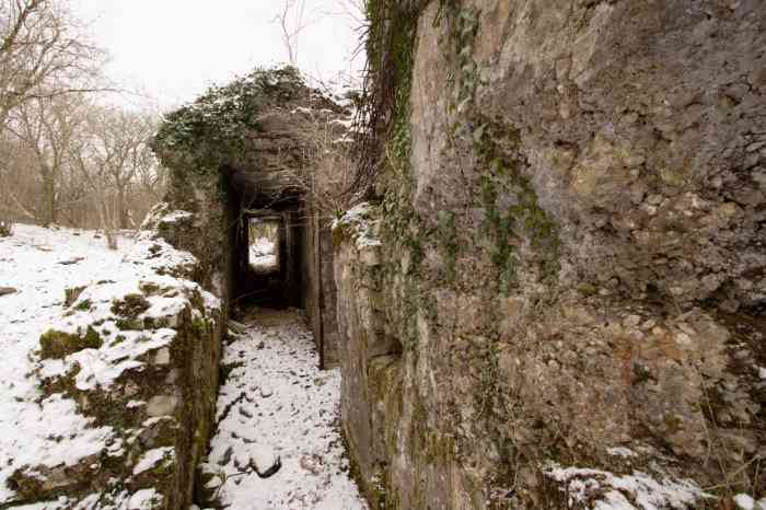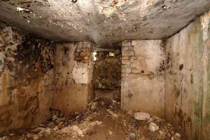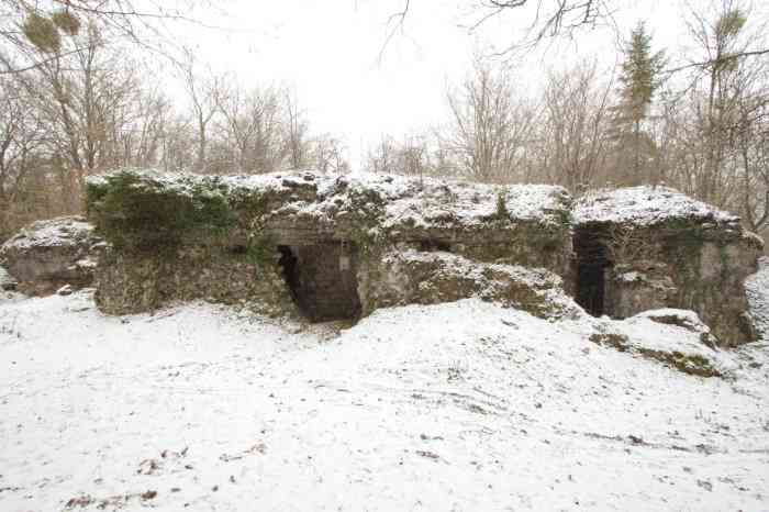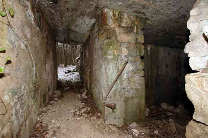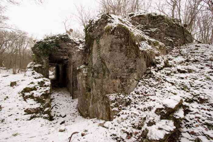 Verdun fortified camp, northeast of the town (interval Douaumont – Vaux – 3), 1905-1907 for ½ company. 282 m alt. Located in the middle of Fumin wood, almost 800 m northwest of salient I of fort de Vaux, it is in all respects similar to its neighbor DV-2. Although conquered by the Germans, they did not hold it long enough for the French artillery, like its neighbors DV-1 and 2, to completely destroy the mask wall. A large-caliber shell managed to pierce the right chamber. The two cemented sarcophagi of the cisterns were pierced and converted into premises by the Germans who, in the rear wall of the shelter, in the basement, began digging a sap, now collapsed after a few meters. The JMO of the 28th RI indicates, on the afternoon of April 10, 1916, that a 380 mm shell pierced the roof; result: 14 killed, 51 wounded and 3 missing. Although located off the beaten track, an unscrupulous person managed to extract a few meters of air duct and abandon them nearby (09/2010). On the left of the shelter, a trench, still clearly visible, leads after a few dozen meters to shapeless remains which would be, with all due respect, those of one of the constituent elements of the position of the projector of the wood Fumin. Sometimes referred to as "shelter 4296" and even "entrenchment 4296". See also Fumin (photoelectric post).