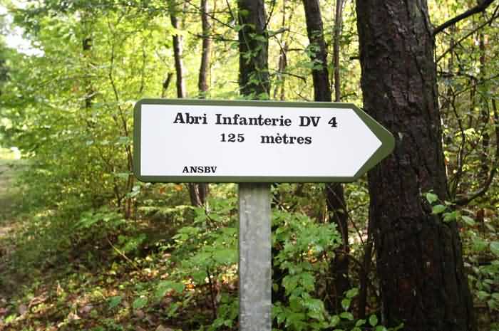 Camp retranché de Verdun, nord-est de la ville (intervalle Douaumont – Vaux – 4), 1905-1907, pour ½ compagnie. 270 m alt. Situé 400 m au nord-ouest du saillant I du fort de Vaux, pratiquement à mi-chemin d’une ligne joignant ce saillant à DV-3. Il était d’une disposition inverse par rapport à DV-3, c’est-à-dire que la cuisine était à gauche des chambres et les latrines sur la droite. Lui aussi il fut capturé par les Allemands mais pas tenu suffisamment longtemps pour que les bombardements français ne pulvérise la totalité de son mur de masque. Les Français le reprennent sans résistance, l’ennemi l’ayant évacué, dans la nuit du 2 au 3 novembre 1916. La chambrée gauche a été percée tandis que la droite présente un impressionnant fléchissement de voûte de presque 50 cm. Á proximité immédiate, se trouvent les croix indiquant les lieux où sont tombés deux combattants français les 3 et 6 juin 1916. Sur la façade de l’abri, une plaque commémorative en fonte a été dérobée durant l’été 2010. Elle portait le texte suivant : LEUTNANT D. RESERVE GUSTAV SCHIEN 6. / R.I.R. 88 20.12.84 – 02.08.16. Dans le coin inférieur gauche figurait un rameau de chêne, brisé. Parfois désigné ”abri 4595“.