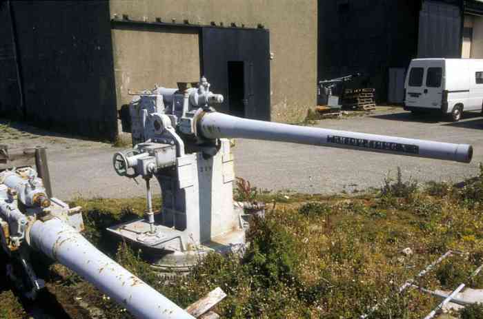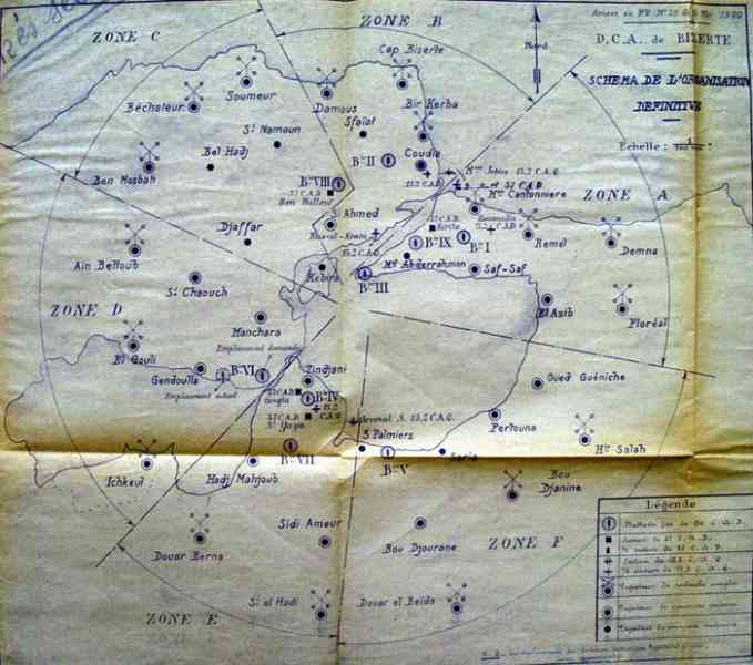Bizerte. Le programme de 1922 prévoit la réalisation, pour la défense contre-avions de Bizerte, de six batteries armées chacune de quatre canons G de 75 Mle 1897 sur affût CA Mle 1915 G de 75. Ce programme est effectivement réalisé, et les batteries sont opérationnelles en 1930. Elles sont numérotées de 1 à 6. Trois défendent la ville et le port, N° 1 Ben Négro, N° 2 Djebel Abiod et N° 3 Ras Charaa. Trois autres défendent l’arsenal, N° 4 Sidi Yaya, N° 5 Oued Guénine et N° 6 Mergazine. Les canons sont remplacés, à partir de 1933, par des 75 Mle 1922-24, sur affût CA Mle 22. En 1939, les batteries de 75 CA sont renforcées par les batteries mobiles N° 5 et 6, armées chacune de quatre canons de 90 CCA Mle 26-30 sur affût Mle 32. Dans l’organisation de Bizerte, elles prennent les numéros 7 et 8, et sont positionnées à Sidi-Zid, à l’ouest de l’aérodrome, et au Remel. Elles partent pour Casablanca en août 1940. Aucune batterie de DCA de Bizerte n’est désarmée au titre des conventions d’armistice. En 1941, les batteries de 75, renumérotées de 21 à 26, reçoivent chacune deux affûts de 13,2 CAD (21 à 24) ou CAS (25 et 26) d’auto-défense. Toute cette DCA est appuyée par un réseau de vingt-sept projecteurs, abrités le jour dans des abris types, présentant l’aspect de maisons locales. Ces projecteurs sont guidés par neufs murs d’écoute et par des télésitemètres. Les batteries auront l’occasion de tirer sur les Italiens en 1940, puis sur les Alliés en 1942, et sur les Allemands après mai 1943. En 1952, une batterie armée de quatre canons de 105, avec masque-tourelle, est implantée dans, et à proximité, de l’ancien ouvrage du Remel. Ce sont les derniers canons installés sous béton par la France à Bizerte. Une autre batterie de ce modèle aurait dû être réalisée dans l’ouvrage du Rara mais, pour des raisons budgétaires, vraisemblablement, elle ne verra pas le jour. Das Programm von 1922 sieht für die Flugabwehr von Bizerte die Errichtung von sechs Batterien vor, die jeweils mit vier 75-mm-Geschützen G Mle 1897 auf Flaklafette Mle 1915 G bewaffnet sind. Dieses Programm wird tatsächlich umgesetzt, und die Batterien sind 1930 einsatzbereit. Sie sind von 1 bis 6 nummeriert. Drei verteidigen die Stadt und den Hafen, Nr. 1 Ben Négro, Nr. 2 Djebel Abiod und Nr. 3 Ras Charaa. Drei weitere verteidigen das Arsenal, Nr. 4 Sidi Yaya, Nr. 5 Oued Guénine und Nr. 6 Mergazine. Die Geschütze werden ab 1933 durch 75-mm-Geschütze Mle 1922-24 auf Flaklafette Mle 22 ersetzt. 1939 werden die 75-mm-Flakbatterien durch die mobilen Batterien Nr. 5 und 6 verstärkt, die jeweils mit vier 90-mm-Flugabwehrkanonen CCA Mle 26-30 auf Lafette Mle 32 bewaffnet sind. In der Organisation von Bizerte erhalten sie die Nummern 7 und 8 und werden in Sidi-Zid, westlich des Flugplatzes, und in Remel positioniert. Sie gehen im August 1940 nach Casablanca. Keine Flakbatterie von Bizerte wird aufgrund der Waffenstillstandsabkommen außer Dienst gestellt. 1941 erhalten die von 21 bis 26 umnummerierten 75-mm-Batterien jeweils zwei 13,2-mm-Lafetten CAD (21 bis 24) oder CAS (25 und 26) zur Selbstverteidigung. Diese gesamte Flak wird durch ein Netz von siebenundzwanzig Scheinwerfern unterstützt, die tagsüber in typischen Unterständen untergebracht sind, die das Aussehen von örtlichen Häusern haben. Diese Scheinwerfer werden von neun Horchgeräten und von Entfernungsmessern gelenkt. Die Batterien werden Gelegenheit haben, 1940 auf Italiener, 1942 auf Alliierte und nach Mai 1943 auf Deutsche zu schießen. 1952 wird eine mit vier 105-mm-Kanonen mit Turmblende bewaffnete Batterie in und in der Nähe des alten Werks Remel errichtet. Dies sind die letzten von Frankreich in Bizerte unter Beton installierten Kanonen. Eine weitere Batterie dieses Modells hätte im Werk Rara errichtet werden sollen, aber aus Haushaltsgründen, vermutlich, wird sie nicht das Licht der Welt erblicken. Het programma van 1922 voorziet in de realisatie, voor de luchtafweer van Bizerte, van zes batterijen elk bewapend met vier kanonnen G van 75 mm Mle 1897 op luchtafweeraffuit Mle 1915 G. Dit programma wordt daadwerkelijk gerealiseerd, en de batterijen zijn in 1930 operationeel. Ze zijn genummerd van 1 tot 6. Drie verdedigen de stad en de haven, Nr. 1 Ben Négro, Nr. 2 Djebel Abiod en Nr. 3 Ras Charaa. Drie andere verdedigen het arsenaal, Nr. 4 Sidi Yaya, Nr. 5 Oued Guénine en Nr. 6 Mergazine. De kanonnen worden vanaf 1933 vervangen door 75 mm Mle 1922-24, op luchtafweeraffuit Mle 22. In 1939 worden de 75 mm luchtafweerbatterijen versterkt door de mobiele batterijen Nr. 5 en 6, elk bewapend met vier kanonnen van 90 mm CCA Mle 26-30 op affuit Mle 32. In de organisatie van Bizerte krijgen ze de nummers 7 en 8, en zijn ze gestationeerd te Sidi-Zid, ten westen van het vliegveld, en te Remel. Ze vertrekken in augustus 1940 naar Casablanca. Geen enkele luchtafweerbatterij van Bizerte wordt ontwapend op grond van de wapenstilstandsconventies. In 1941 krijgen de van 21 tot 26 hernummerde 75 mm batterijen elk twee affuiten van 13,2 mm CAD (21 tot 24) of CAS (25 en 26) voor zelfverdediging. Al deze luchtafweer wordt ondersteund door een netwerk van zevenentwintig zoeklichten, overdag ondergebracht in type-onderkomens, die het uiterlijk hebben van lokale huizen. Deze zoeklichten worden geleid door negen luisterapparaten en door afstandsmeters. De batterijen zullen de gelegenheid krijgen te vuren op de Italianen in 1940, vervolgens op de Geallieerden in 1942, en op de Duitsers na mei 1943. In 1952 wordt een batterij bewapend met vier kanonnen van 105 mm, met torenschild, geplaatst in en nabij het oude werk Remel. Dit zijn de laatste door Frankrijk in Bizerte onder beton geïnstalleerde kanonnen. Een andere batterij van dit model had moeten worden gerealiseerd in het werk Rara, maar om budgettaire redenen, vermoedelijk, zal ze het daglicht niet zien. The 1922 programme provides for the constructi