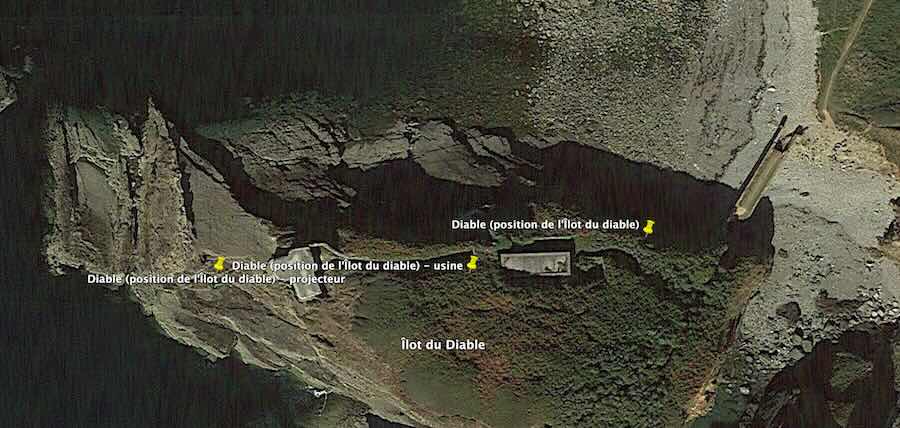 Place de Brest, presqu'île de Roscanvel. Immédiatement au sud du vieux fort de la Fraternité, un îlot escarpé et accessible par un petit pont abrite une usine électrique sise en arrière d'une casemate bétonnée pour un projecteur située, elle, sur le front de mer. Au-dessus de la falaise, assez difficile d'accès, est implanté le poste de commande du projecteur, sous abri bétonné. En fait, c'est en 1884 que l'on installera pour la première fois un projecteur sur l'îlot, mais dès l'année suivante, on le déplacera aux Capucins. En 1907, le nouveau plan d'éclairage prévoit un feu de tir de 150 cm au profit des batteries hautes des Capucins. Les infrastructures actuelles datent de 1912-1913. Site enchanteur tout à fait libre d'accès.