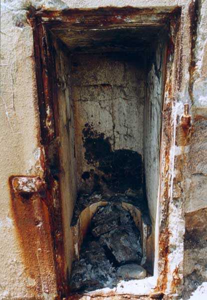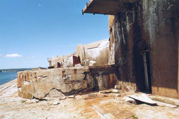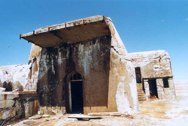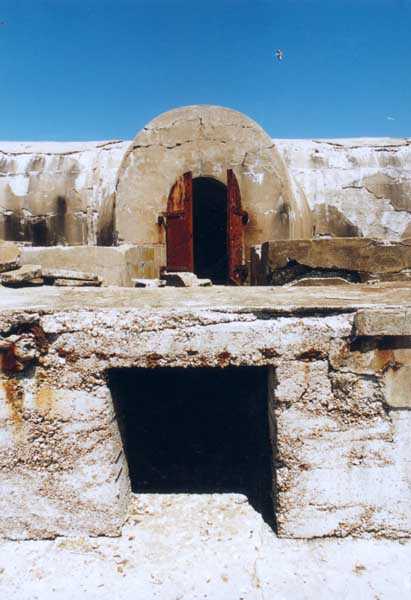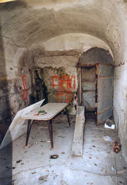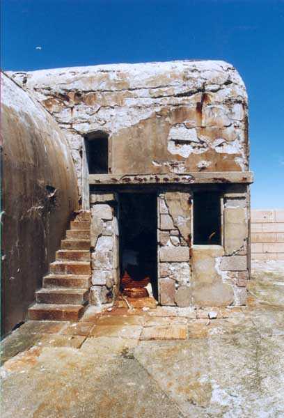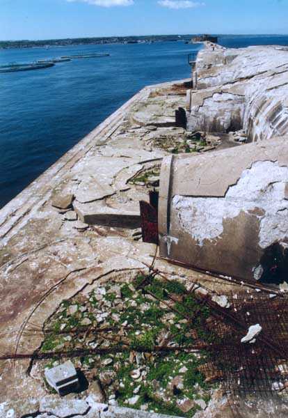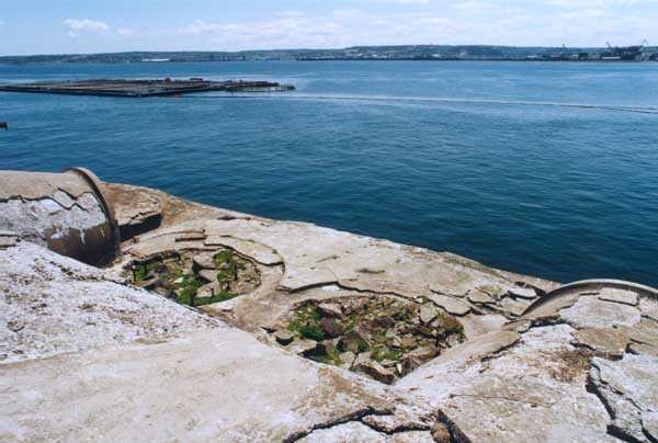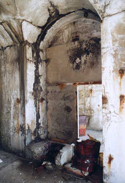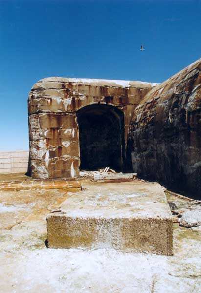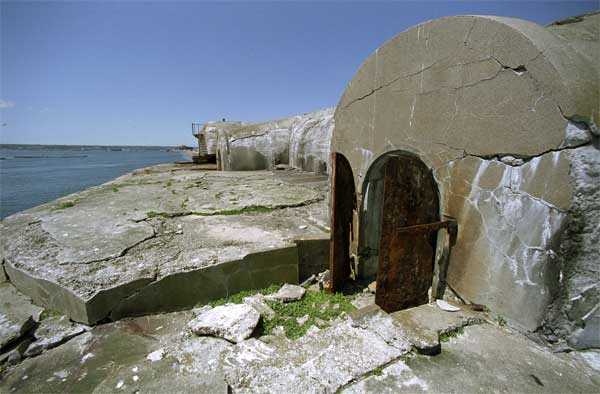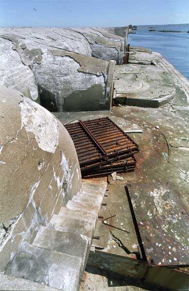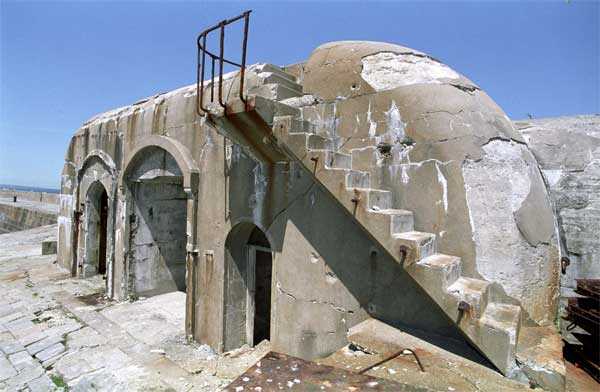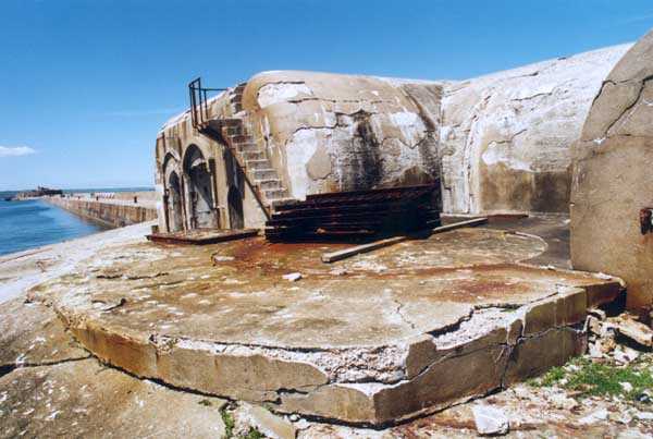 Fortress of Cherbourg , north of the town. The axis of this battery is located 930 m from the Fort Musoir Ouest and 1040 m from the Fort Central. A battery was established there in 1860, but we have no details about it. In 1899, it was completely reorganized. At its height, the dike goes from a width of 9 m (parapet included) to 24 m. The battery is a rectangle of 82 m (head front) and 20 m wide. The six platforms of the 30 c mortars are separated by three hollow traverses giving access to the powder and projectile magazine. This magazine has an interior length of 57 m and a width of 4.6 m. The mortars were arranged at a rate of 1 per platform for the exteriors and 2 on two platforms in the center. Compared to the ground of the dike, the firing platforms are located 156 cm higher and the top of the parapet of the pieces culminates 607 cm higher. The thickness of the head front is 5 m. Even before construction, it was decided to adjoin on the left of the battery an electrical plant (Chaligny fixed ½ machine) and the day shelter of a 150 cm projector. Planned but not fully realized were accommodation for 34 men on hammocks, 1 accommodation for 2 masters on 2 iron beds, 1 galley and 1 coal store which was itself built as well as a telegraphist's post. To the right of the battery, latrines and the command telemetry post have been added. The battery has no landing port. This battery, along with that of Toulbroch in Brest, is a valuable testament to what a mortar battery was like at the end of the 19th century. The undeniable advantage is that it is not hidden by vegetation and, although access is prohibited, it is free (or almost!) of graffiti. While the metal frames and doors are still there, the sub-saddle plates of the command post carriages and the rails of the 60 gauge tracks have been recovered. The sea is now the number one factor in deterioration. The front-end magazine is used to store materials for repairing the sea wall. The main sea wall is closed to access.