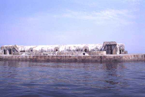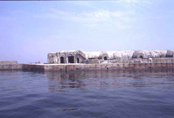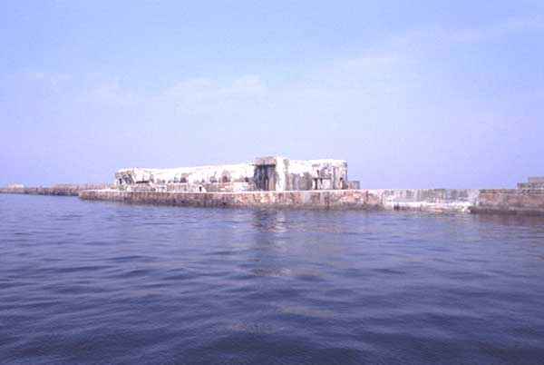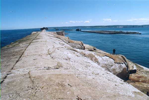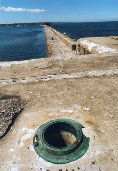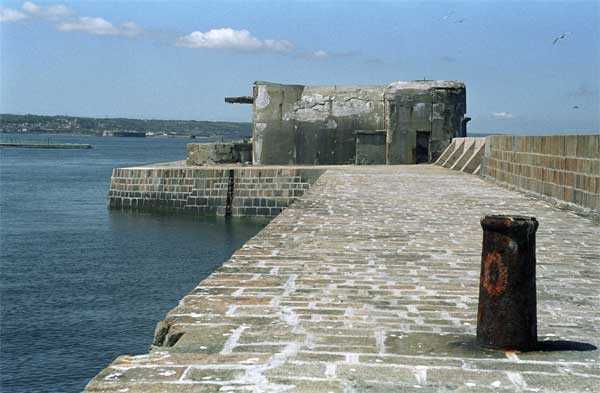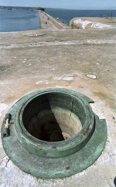 Place de Cherbourg, N de la ville. L'axe de cette batterie se situe à 930 m du fort du Musoir Ouest et à 1040 m du fort Central. Dès 1860 une batterie fut implantée là, mais nous ne possédons aucun détail à son sujet. En 1899, on la réorganisa complètement. À sa hauteur, la digue passe d'une largeur de 9 m (parapet compris) à 24 m. La batterie est un rectangle de 82 m (front de tête) et 20 m de large. Les six plates-formes des mortiers de 30 c sont séparées par trois traverses creuses donnant accès au magasin à poudre et projectiles. Ce magasin a une longueur intérieure de 57 m pour une largeur de 4,6 m. Les mortiers étaient disposés à raison de 1 par plate-forme pour les extérieurs et 2 sur deux plates-formes au centre. Par rapport a sol de la digue, les plates-formes de tir se situent 156 cm plus haut et le sommet du parapet des pièces culmine 607 cm plus haut. L'épaisseur du front de tête est de 5 m. Dès avant la construction, il était décidé d'accoler sur la gauche de la batterie une usine électrique (machine ½ fixe Chaligny) et l'abri de jour d'un projecteur de 150 cm. Étaient prévus mais qui ne furent pas réalisés en totalité, un logement pour 34 hommes sur hamacs, 1 logement pour 2 maîtres sur 2 lits en fer, 1 cambuse et 1 magasin à charbon qui, lui, fut réalisé tout comme un poste pour télégraphiste. Sur la droite de la batterie, on a accolé des latrines et le poste télémétrique de commandement. La batterie ne dispose d'aucun port d'accostage. Cette batterie est, avec celle de Toulbroch à Brest, un précieux témoin de ce qu'était une batterie de mortiers à la fin du XIXè siècle. L'avantage indéniable c'est qu'aucune végétation ne la dissimule et qu'interdite d'accès, elle est exempte (ou presque !) de tags. Si les huisseries et portes métalliques sont encore là, les sous-sellettes des affûts P.C. et les rails des voies de 60 ont été récupérés. La mer constitue désormais le facteur n°1 de dégradation. Le magasin du front de tête sert pour l'entreposage de matériaux de réfection de la digue. La grande digue est interdite d'accès.
