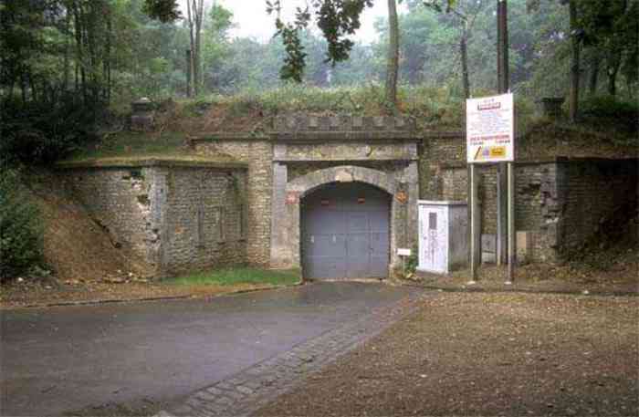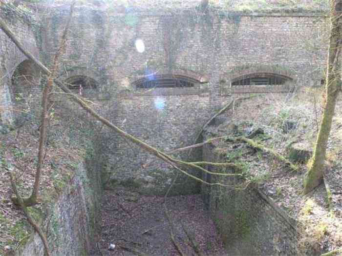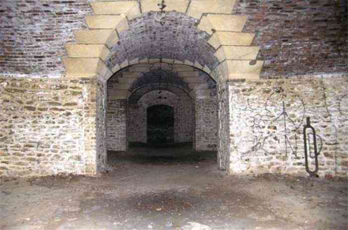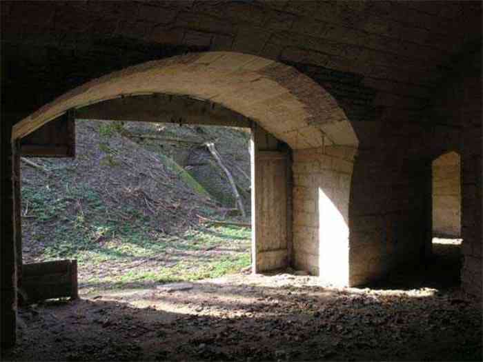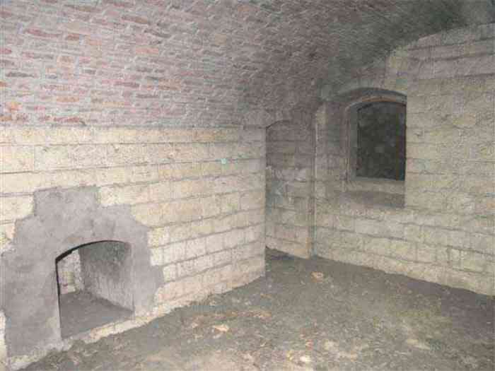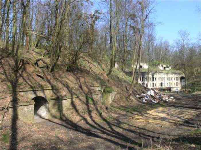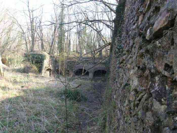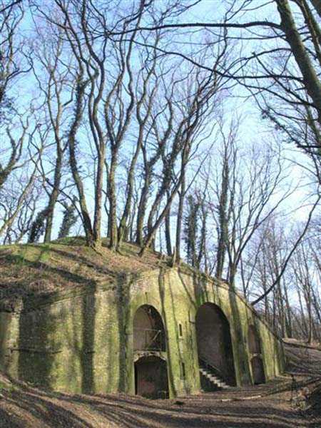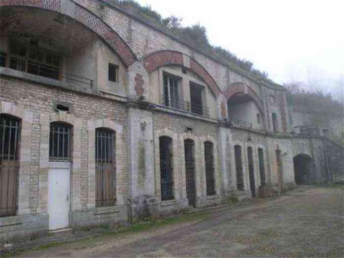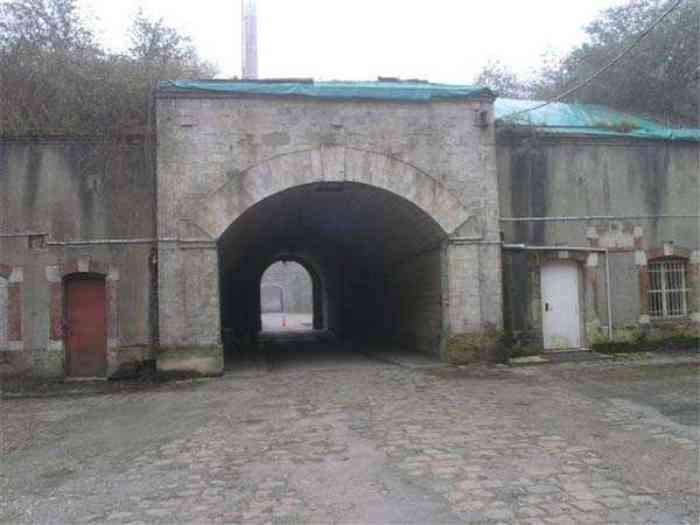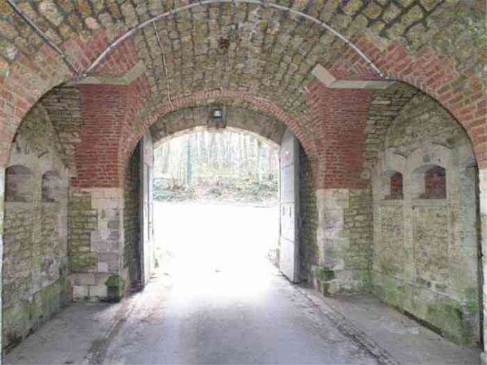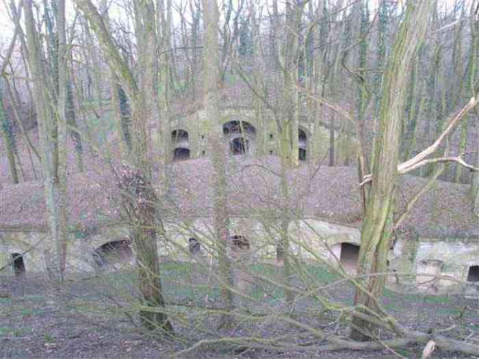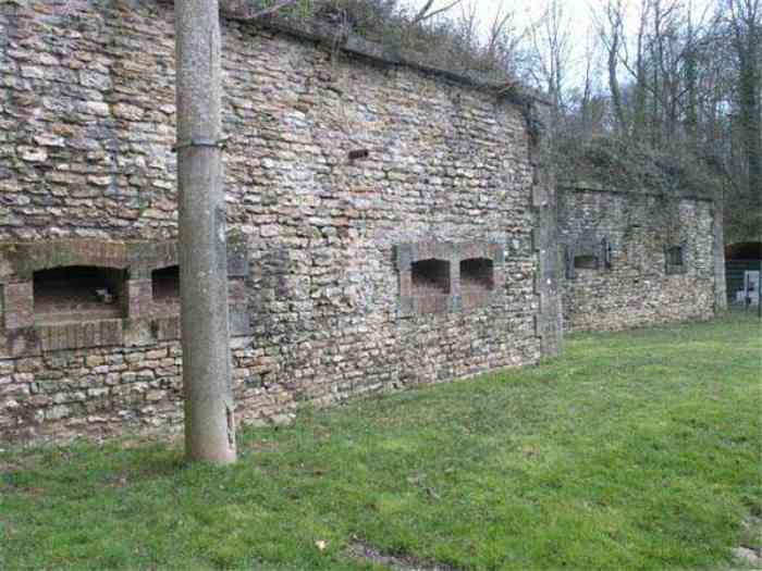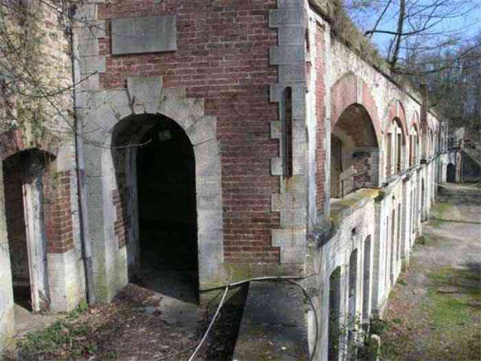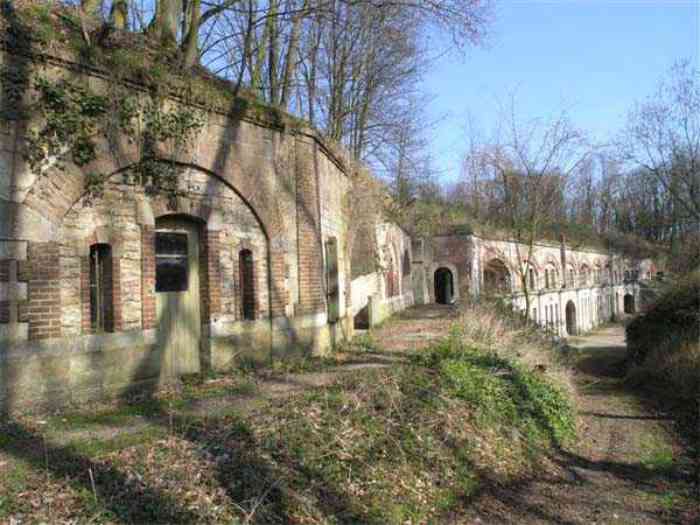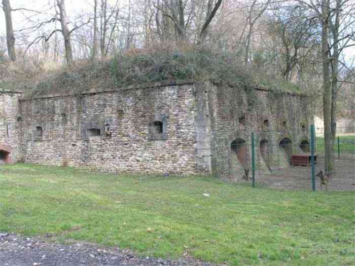 Fortress Paris, north of the city, 1874-1878. 202 m/alt. Large cavalier fort for 1175 men and 74 guns including 2 under Mougin Mle 1876 turret, it has the shape of a pentagon whose salients I and V form practically right angles with the gorge, the head front being broken in chevron. For the defense of its ditches, it relied on two simple caponiers with three guns per direction of fire (Salients II and IV) and two double ones (gorge and salient III). The gorge ditch is twenty meters wide! The scarp is semi-detached and the counterscarp aligns the arches of the vaults in relief. The counterscarp entrance has a small curtain wall. Once through this entrance, one emerges opposite a second curtain wall framing two bays and the scarp entrance porch. This curtain wall is defended by two coffers on each side and, before reaching it, one must pass in front of the embrasures of the double caponier. The escarpment entrance still has its rolling bridge with lateral retraction. Once through the entrance porch, one finds oneself in a superb tunnel with a basket-handle vault opening out in front of the seven bays on two floors of the officers' barracks. To its left are three indirect fire casemates, while two others occupy its right. Behind it, the troop barracks has lost much of its splendor; of its eleven bays, only the six on the left remain, the right part, with the bread ovens, having completely collapsed. The remaining bays are unfortunately used for fire drills and the facades are blackened. Behind the barracks, an envelope gallery serves all the artillery traverses of the cavalier as well as, near each of its ends, two powder magazines totaling a maximum storage capacity of 187,786 kg. A lightning rod still covers the one on the left. All the artillery traverses, whether of the cavalier or the lower battery, are of the 1879 model. We will note, however, the exceptional presence of a triple-axle carriage sliding on metal beams surmounting the shaft of the traverse capping the first bay of the barracks. This vestige, perhaps unique, unfortunately suffered from fires started from below while it deserves special attention. Some of the cavalier traverses, including this one, communicate with the envelope gallery via a large shaft for supplying ammunition and even cannons; as for the traverses of the lower battery, all have two levels. Following the capital, between the cavalier and the lower battery, at the level of the latter, we find two other indirect fire casemates, which are installed directly behind the enormous masonry mass of the Mougin turret. The latter, received on 20/12/1884, although devoid of its guns and having retained only stubs of carriages, still has a proud appearance. It is worth noting the presence of its boiler in a room to the right of its building. The double head caponier is impressive by its dimensions, as well as those of its ditches in front of the embrasures. Like many other forts in the place, a 1911 project, which was not followed up, granted it a 75 mm turret, two others for machine guns, a concrete shelter for part of the garrison and counterscarp chests. This fort fired a few shells in September 1914 on advanced elements of German cavalry. The concrete observation towers atop the cavalier date from this period, or probably shortly after. It was supported to the east by the Blémur battery. Between the two wars, it housed an anti-aircraft battery. Today (March 2007), the fort is owned by the French National Forestry Office (ONF), which seems to have little regard for the damage suffered by these venerable buildings, whether by bad weather or firefighter drills.