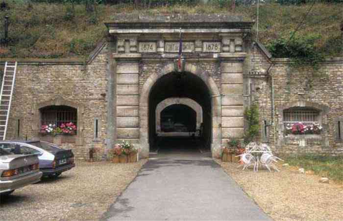 Place de Paris, nord de la ville, 1874-1878. 202 m/alt. Grand fort à cavalier pour 1175 hommes et 74 pièces dont 2 sous tourelle Mougin Mle 1876, il affecte la forme d’un pentagone dont les saillants I et V forment pratiquement des angles droits avec la gorge, le front de tête étant brisé en chevron. Pour la défense de ses fossés, il comptait sur deux caponnières simples à trois pièces par direction de tir (Saillants II et IV) et deux doubles (gorge et saillant III). Le fossé de gorge a une largeur de vingt mètres ! L’escarpe est demi-détachée et la contrescarpe aligne les arceaux de voûtes en décharge. L’entrée de contrescarpe possède une petite courtine. Cette entrée franchie, on débouche face à une seconde courtine encadrant deux travées et le porche d’entrée d’escarpe. Cette courtine est défendue par deux coffres de chaque côté et, avant de l’atteindre, il faut passer au devant des embrasures de la caponnière double de gorge. L’entrée d’escarpe possède encore son pont roulant à effacement latéral. Le porche d’entrée franchi, on se retrouve dans un superbe tunnel voûté en anse de panier débouchant au devant des sept travées sur deux étages du casernement des officiers. À sa gauche se trouvent trois casemates à tir indirect, tandis que deux autres occupent sa droit. Derrière lui, le casernement de la troupe a bien perdu de sa superbe ; de ses onze travées, seules demeurent les six de la partie gauche, la partie droite, avec les fours à pains, étant totalement effondrée. Les travées subsistantes servent malheureusement à des exercices d’incendie et les façades sont noircies. En arrière du casernement, une galerie enveloppe dessert, toutes les traverses du cavalier d’artillerie ainsi que, proche de chacune de ses extrémités, deux magasins à poudre totalisant une capacité de stockage maximale de 187.786 kg. Un paratonnerre coiffe encore celui de gauche. Toutes les traverses d’artillerie, quelles soient du cavalier ou de la batterie basse, sont du modèle 1879. Nous noterons toutefois l’exceptionnelle présence d’un chariot à triple essieu coulissant sur des poutrelles métalliques surmontant le puits de la traverse coiffant la première travée du casernement. Ce vestige, peut-être unique, a malheureusement souffert des incendies allumés par-dessous alors qu’il mériterait une attention toute particulière. Certaines traverses du cavalier, dont celle-là, communiquent avec la galerie enveloppe via un large puits d’amenée des munitions et même de canons ; quant aux traverses de la batterie basse, toutes possèdent deux niveaux. En suivant la capitale, entre cavalier et batterie basse, au niveau de cette dernière, on trouve encore deux autres casemates à tir indirect, lesquelles sont installées directement derrière l’énorme massif maçonné de la tourelle Mougin. Cette dernière, réceptionnée le 20/12/1884, bien que dépourvue de ses canons et n’ayant conservé que des moignons d’affûts, a encore fière allure. Il convient de relever la présence de sa chaudière dans un local à la droite de son bâtiment. La caponnière double de tête est impressionnante par ses dimensions, ainsi que celles de ses fossés au-devant des embrasures. À l’instar de nombreux autres forts de la place, un projet de 1911, resté sans suite, lui octroyait une tourelle de 75 mm, deux autres de mitrailleuses, un abri bétonné pour une partie de la garnison et des coffres de contrescarpe. Ce fort a tiré quelques obus en septembre 1914 sur des éléments avancés de cavalerie allemande. De cette époque ou probablement peu après, datent les observatoires bétonnés coiffant le cavalier. Il était assisté à l'est par la batterie de Blémur. Dans l’Entre-deux-guerres, il accueillera une batterie de défense antiaérienne. Aujourd’hui (03/2007), le fort est propriété de l’O.N.F. qui ne semble guère se soucier des dégradations qu’encourent ces vénérables bâtiments, que ce soit par les intempéries ou par les exercices des pompiers.