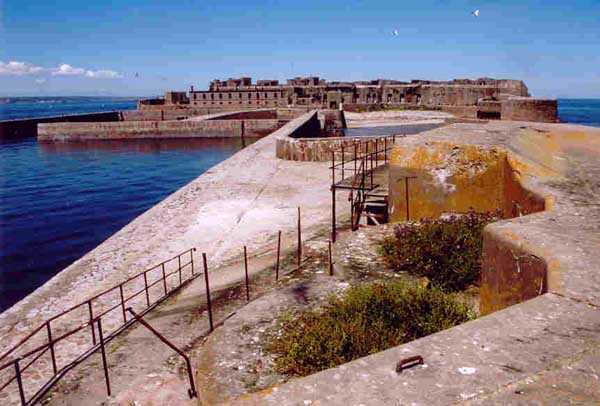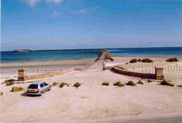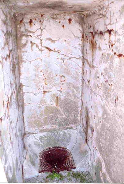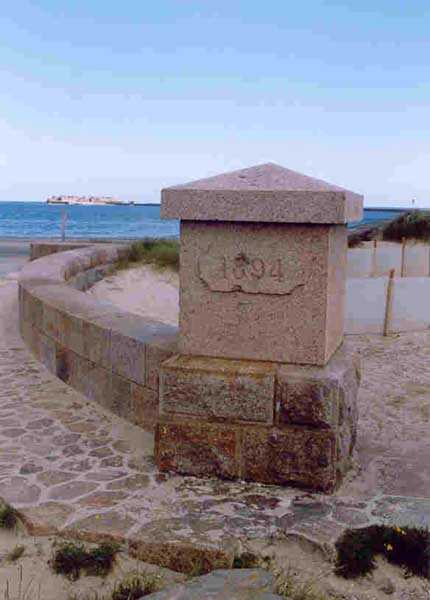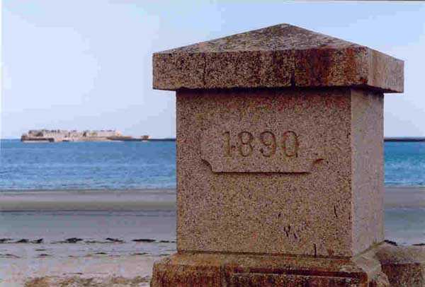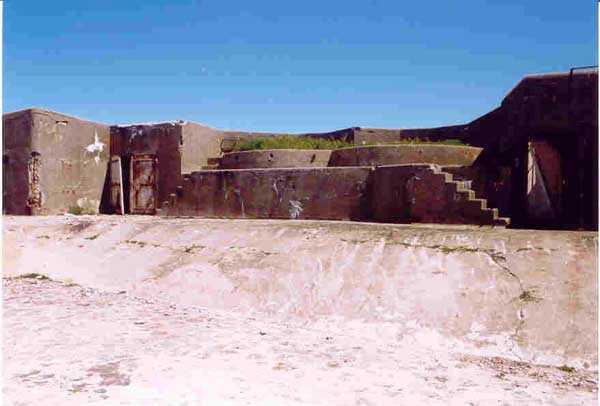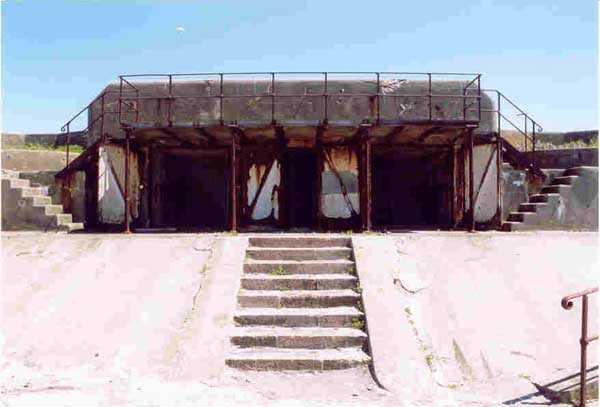Fortress of Cherbourg. This concrete battery for 4 x 100 mm rapid-fire is located 180 m from the entrance to the Pelée Island Fort and about sixty meters from the southern pier of the island's small port. The eastern dike, also known as the "Collignon dike", was built from 1890 to 1894 over a length of 1897 m and a width of 8 m. The battery was probably not built until after 1900. It has a head front 40 m long, a shelter at each end, including the left one with a toilet, and a double central shelter. The gun emplacements were grouped two by two, on either side of this central shelter, on platforms for central pivot mounts. Good general condition (06/2005). Like Pelee Island, this battery cannot be visited without permission from the Navy.