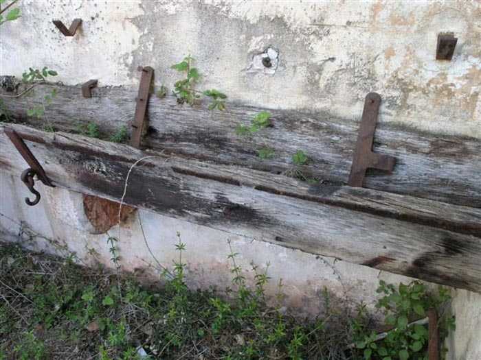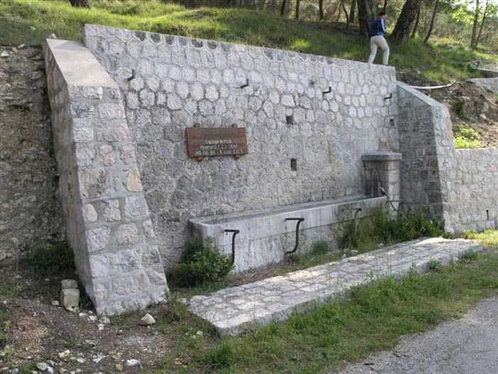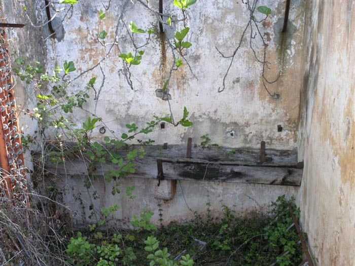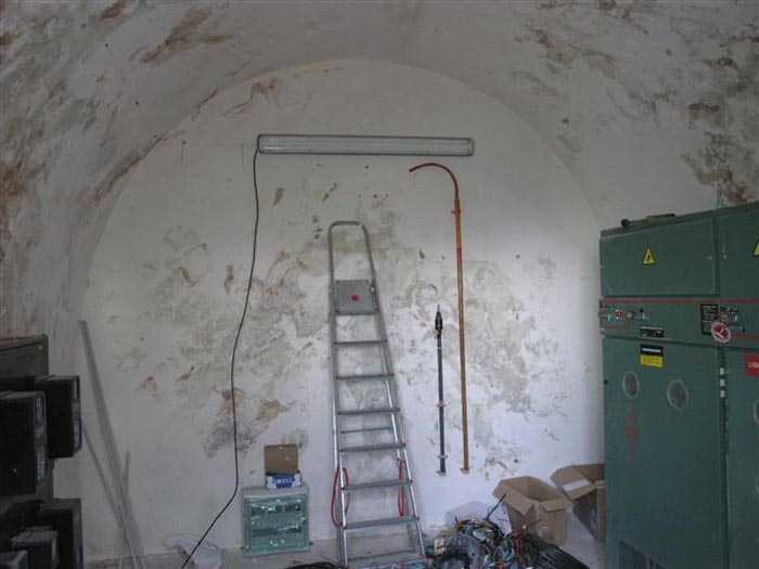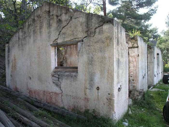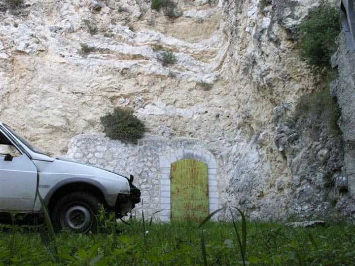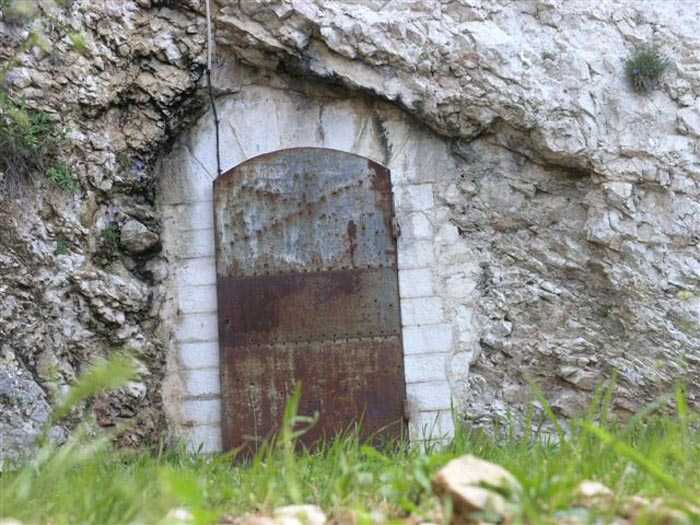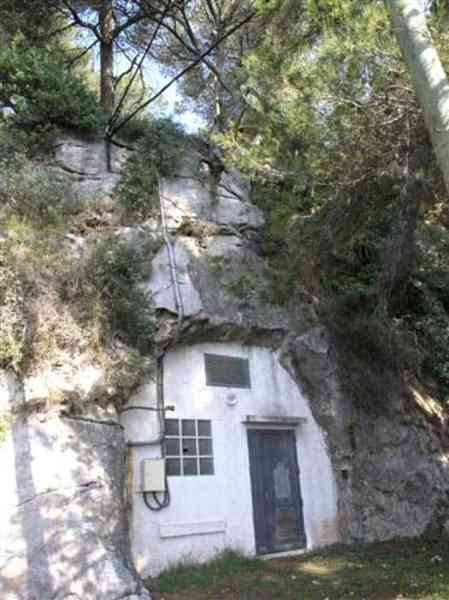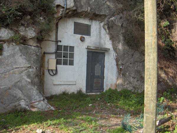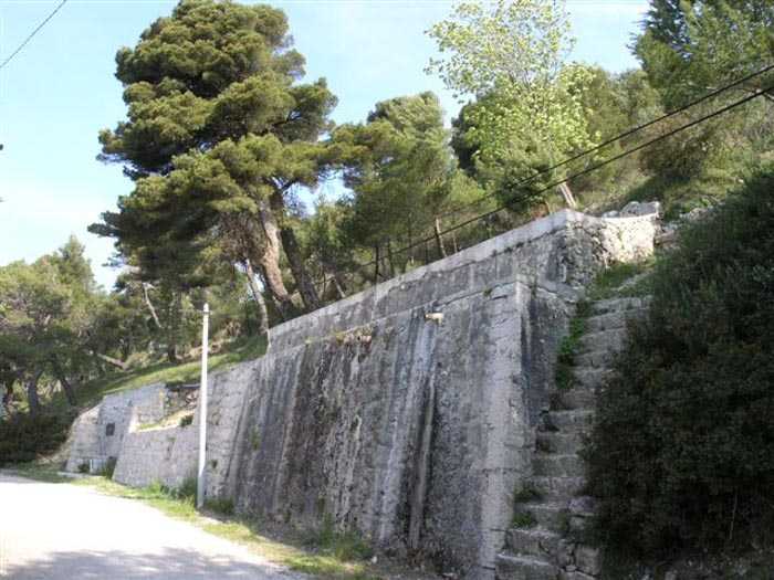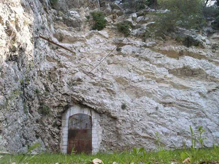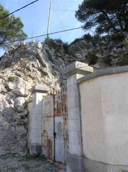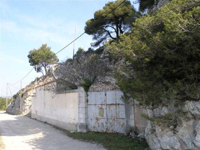 Fortress of Nice, east-north-east of the town, ± 1890. Located in the curve of the penultimate bend of the access road to the fort of Drête, this rock magazine could not, for lack of key, be opened to us. The two entrance portals of the enclosure, with careful pilasters, are quite close and only separated by the traditional projectile shed. The courtyard, quite reduced by the returns of the rock on the sides, comprises two parallel entrances devoid of chronogram. On the basis of a plan, the interior can be described as follows: the left entrance ends with a door giving, on the right, into a loading/deposit workshop for loaded projectiles which extends by a gallery regaining the extremity of the gallery of the right entrance. In the axis of the latter, a powder magazine preceded by an airlock seems to have dimensions not exceeding 6 x 5 m. In April 2008, a car wreck was lying in the courtyard and we know nothing about the state of the magazine interior. At the roadside, a few dozen metres upstream, is the guardhouse of this magazine, guardhouse whose unique room, now sheltering an electrical transformer, has also been excavated in the rock. Further upstream still, a building of manifestly military workmanship, dilapidated, still possesses a horse manger, manger in wood. Further upstream still, a captured source is adjoining a reservoir and a watering trough. The water reservoir No. 4 (see Nice) is located as for itself further back still, at the pass of Eze.