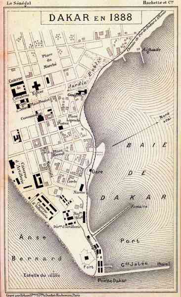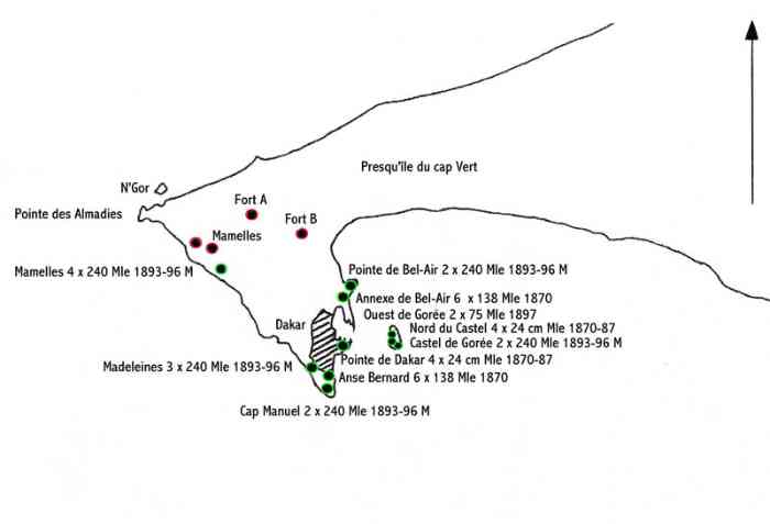 Die Befestigung von Dakar-Gorée. Gorée ist eine kleine niedrige Insel, 900 mal 400 Meter groß, nord-südlich ausgerichtet, 2500 Meter östlich von Dakar gelegen. Im Süden wird sie von einem basaltischen Plateau, 34 Meter hoch, von Klippen umgeben und heute Castel genannt, überragt. Entdeckt vom Portugiesen Dinis Dias im Jahr 1444, wird die Insel 1627 von den Holländern besetzt. Diese errichten zwei Forts, Saint-François im unteren Teil und Saint-Michel auf dem Plateau. Die Insel wird am 1. November 1677 von Vizeadmiral Jean d'Estrées im Namen des Königs von Frankreich erobert. Frankreich wird Gorée bis zur Unabhängigkeit Senegals 1960 besitzen. Nur die Engländer werden diese Präsenz fünfmal für insgesamt 28 Jahre anfechten. Zahlreiche Befestigungen werden in diesen fast drei Jahrhunderten gebaut und abgerissen. Es ist nichts von den Bauten vor 1840 erhalten, außer der Batterie de la Place (d'armes), oder Batterie Royale, oder Grande Batterie. Ihre Aufgabe war es, die östlich gelegene Bucht zu sperren, die einzige, die eine Landung erlaubte. Nicht weniger als vier Batterien wurden im Laufe der Jahrhunderte an dieser Stelle errichtet, was jüngste Ausgrabungen bestätigt haben. Die Batterie de la Place wird 1874 der Gemeinde Gorée übergeben. Sie präsentiert sich heute als eine mit Bänken bestückte Esplanade, verziert mit uninteressanten alten Kanonen. 1837 beginnt, um das völlig veraltete Fort Saint-Michel zu ersetzen, der Bau des fünfeckigen Forts auf dem, was man fortan das Castel nennt. Ein Bau ohne Strenge, ohne festgelegten Plan und anscheinend ohne ministerielle Genehmigung. 1846 fertiggestellt, wird seine Konzeption heftig kritisiert, insbesondere vom Prinzen von Joinville. Man wirft ihm seine hohen, von See aus gut sichtbaren Mauern vor. Es wäre besser gewesen, die vulkanische Beschaffenheit des Geländes zu nutzen, um dort Batteriestellungen und Magazine anzulegen. Zudem mangelt es an modernen Kanonen und Personal, um das Werk zu bewaffnen. Die modernen Kanonen der Marine zu dieser Zeit sind: