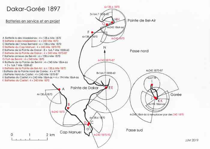 Opevnění Dakar-Gorée. Gorée je malý nízký ostrov o rozměrech 900 na 400 metrů, orientovaný severojižně, nacházející se 2500 metrů východně od Dakaru. Na jihu je ovládán čedičovou plošinou o výšce 34 metrů, obklopenou útesy a dnes nazývanou Castel. Objeven Portugalcem Dinisem Diasem v roce 1444, ostrov je obsazen Holanďany v roce 1627. Ti staví dvě pevnosti, Saint-François v nižší části a Saint-Michel na plošině. Ostrov je dobyt 1. listopadu 1677 viceadmirálem Jeanem d'Estrées jménem francouzského krále. Francie bude Gorée vlastnit až do nezávislosti Senegalu v roce 1960. Pouze Angličané budou tuto přítomnost pětkrát zpochybňovat, celkem po dobu 28 let. Během těchto téměř tří století bude postaveno a zbouráno četné opevnění. Z realizací před rokem 1840 nezbylo nic, kromě baterie Place (d'armes), neboli baterie Royale, nebo Grande batterie. Jejím úkolem bylo uzavřít zátoku ležící na východě, jedinou umožňující vylodění. Na tomto místě byly v průběhu staletí postaveny nejméně 4 baterie, což potvrdily nedávné vykopávky. Baterie Place bude v roce 1874 předána obci Gorée. Dnes se prezentuje jako esplanáda vybavená lavičkami a ozdobená starými nezajímavými děly. V roce 1837 začíná stavba pětiúhelníkové pevnosti, která má nahradit zcela zastaralou pevnost Saint-Michel, na místě nyní zvaném Castel. Stavba bez důslednosti, bez pevného plánu a zřejmě bez ministerského schválení. Dokončena v roce 1846, její koncepce je ostře kritizována, zejména princem z Joinville. Vytýkají se jí její vysoké zdi dobře viditelné od moře. Bylo by bývalo lepší využít vulkanické povahy terénu k vyhloubení bateriových stanovišť a skladišť. Navíc chybí moderní děla a personál k vyzbrojení díla. Moderní děla námořnictva v té době jsou: