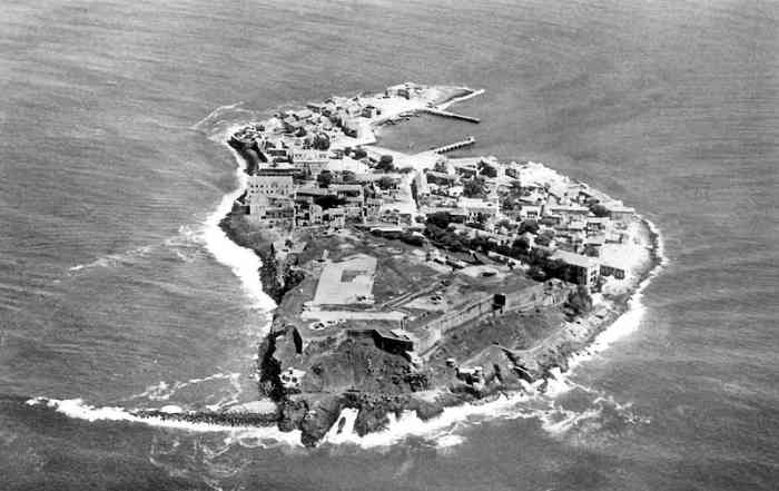 The fortification of Dakar-Gorée. Gorée is a small low island, 900 metres by 400, oriented north-south, located 2500 metres east of Dakar. It is dominated to the south by a basaltic plateau, 34 metres high, surrounded by cliffs and nowadays called the Castel. Discovered by the Portuguese Dinis Dias in 1444, the island is occupied by the Dutch in 1627. They build two forts, Saint-François on the lower part and Saint-Michel on the plateau. The island is conquered on 1 November 1677 by Vice-Admiral Jean d'Estrées, in the name of the King of France. France will possess Gorée until the independence of Senegal in 1960. Only the English, on 5 occasions, will contest this presence, for a total of 28 years. Numerous fortifications will be built and dismantled during these almost three centuries. Nothing remains of the constructions prior to 1840, except the Place (d'armes) battery, or Royale battery, or Grande batterie. Its mission was to deny the cove located to the east, the only one allowing a landing. No fewer than 4 batteries were built at this location over the centuries, as recent excavations have confirmed. The Place battery will be handed over to the commune of Gorée in 1874. Nowadays, it presents itself in the form of an esplanade, furnished with benches, and decorated with old uninteresting cannons. In 1837, to replace the completely obsolete Fort Saint-Michel, construction begins on the pentagonal fort, on what is henceforth called the Castel. A construction without rigour, without fixed plan and, apparently without ministerial approval. Completed in 1846, its design is sharply criticised, in particular by the Prince de Joinville. It is criticised for its high walls very visible from the sea. It would have been preferable to take advantage of the volcanic nature of the terrain to dig battery emplacements and magazines there. Moreover, there is a lack of modern guns and personnel to arm the work. The modern guns of the Navy at that time are:
