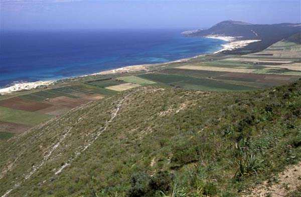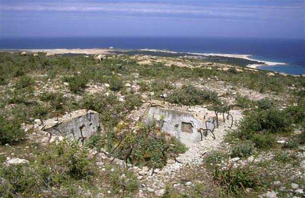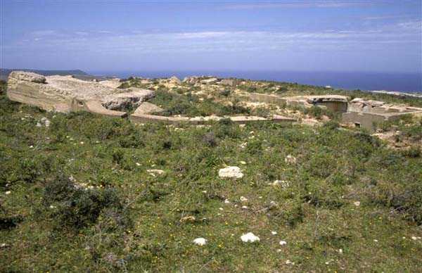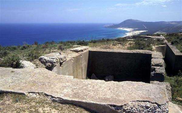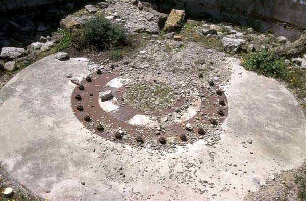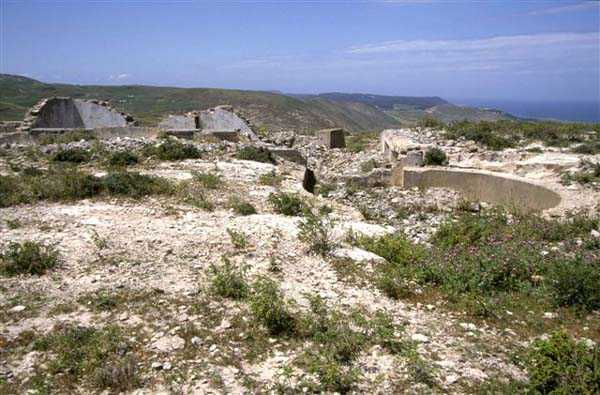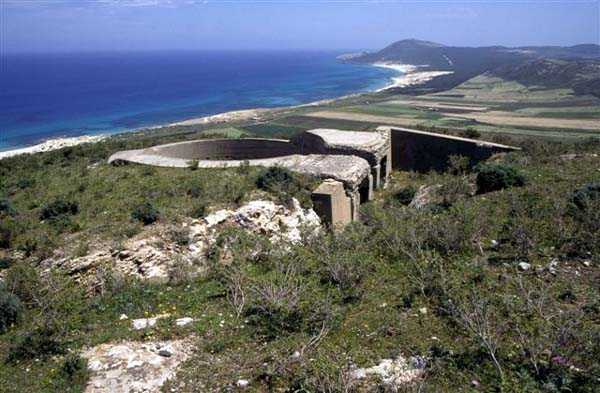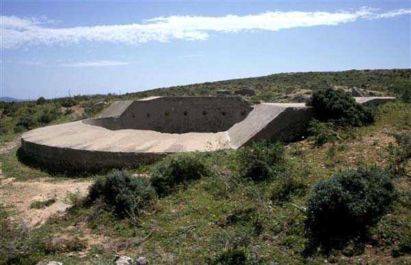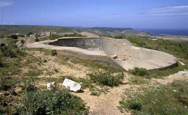 Bizerte. The Djebel Soumeur battery is the third work armed with 164 guns, built on the sea front of Bizerte. It is a fixed secondary artillery battery, built on a new site, at 180 meters altitude, 1,000 meters from the shore and 9 kilometers west of Cape Bizerte. Its preliminary design was established on March 21, 1927, and its execution ordered on June 24, 1927. The contract was won by Mr. Louis Grasset, a contractor in Tunis. The battery is armed with 4 guns 164 Mle 1893-96 M, of the same model as those arming the Cape Bizerte battery. They are installed on carriage C Mle 23, which is a cast steel material with an enclosing support, specially designed to equip coast batteries armed with 164 Mle 1893-96 and 96-96 M guns in cradle, originating from cruisers of the Desaix type. To allow return to battery at high angles, an additional recuperator was placed above the cradle. With this carriage, placed on platform BA Mle 25 bis, the range at an angle of 42° is 17,800 meters with the AP shell and 20,100 meters with the HE shell. The field of fire is 360° and the minimum aiming angle is -6°. The rate of fire is 3 rounds per minute. This type of equipment is found in metropolitan France, with barrels Mle 93-96, for example at the Croix des Signaux battery. The pieces are placed in circular pits, with a diameter of 7.60 meters, and the battery's field of fire extends from Cape Zébib in the east to Ras el Koran in the west. The missions are direct line-of-sight fire over this entire zone, as well as denial of access to the beach of Oued Damous, thereby taking over the mission of the 95s of Djebel Nador in 1914. To enable this, the parapet wall of the pits features a significant setback, allowing firing below -6°. The battery front extends over 250 meters. The projectiles and their charges are stored in an underground magazine, featuring three well exits, and 2 hoists discharging onto a network of 60 cm gauge track supplying the pits' niches. The FCB is located 100 meters behind piece 2. It is protected by 200 mm of armor and equipped with a coordinate converter C Mle 1926 and a depression rangefinder H Mle 34. The battery has an illuminating section, armed with 2 guns 75 Mle 1897 on appropriate carriage Mle 1916 for firing illuminating shells, located behind the FCB, near an anti-aircraft searchlight. After the installation of a 150 cm searchlight GP at the foot of the position, the 75s are moved and installed in 2 pits, placed on a knoll in front of the battery, to provide direct fire on the beach. The quarters, for the 120 crewmen, include the battery keeper's lodging, a battery post and 8 corrugated iron shelters. The battery was captured intact by Axis forces in November 1942. Upon their departure, the occupiers destroyed the equipment. They applied themselves particularly on this site, blowing up the FCB, whose roof was ejected, and the magnificent underground magazine, the finest on the sea front, of which only a huge crater remains, serving as a watering hole for local livestock. The land is freely accessible, and one discovers an extraordinary view of the beach of Oued Damous and Djebel Nador. JJM 14/10/07