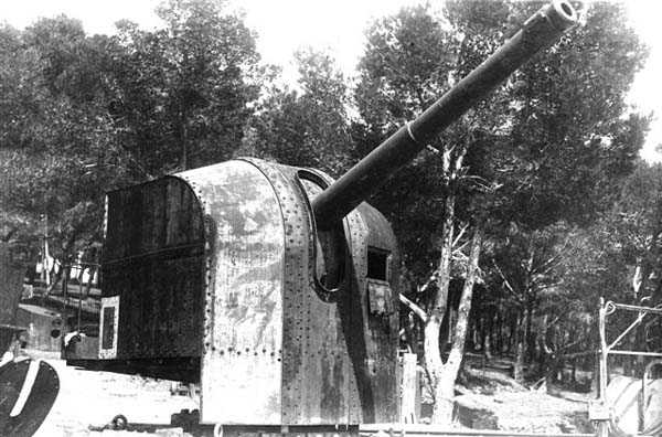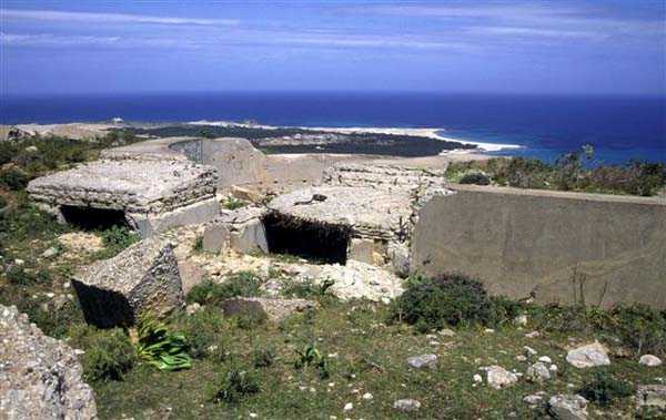 Bizerte. La batterie du Djebel Soumeur est le troisième ouvrage armé de canons de 164, réalisé sur le front de mer de Bizerte. Il s’agit d’une batterie d’artillerie secondaire fixe, construite sur un emplacement nouveau, à 180 mètres d’altitude, à 1 000 mètres du rivage et à 9 kilomètres à l’ouest du cap Bizerte. Son avant-projet est établi le 21 mars 1927, et son exécution prescrite le 24 juin 1927. Le marché est remporté par monsieur Louis Grasset, entrepreneur à Tunis. La batterie est armée de 4 canons de 164 Mle 1893-96 M, du même modèle que ceux armant la batterie du Cap Bizerte. Ils sont installés sur affût C Mle 23, qui est un matériel en acier moulé, à support enveloppant, étudié spécialement pour équiper les batteries de côte armées de canons de 164 Mle 1893-96 et 96-96 M à berceau, provenant des croiseurs du type Desaix. Pour permettre la rentrée en batterie aux grands angles, un récupérateur supplémentaire a été placé au dessus de berceau. Avec cet affût, placé sur plateforme BA Mle 25 bis, la portée, à l’angle de 42° est de 17 800 mètres avec l’obus RC et de 20 100 mètres avec l’obus FAD. Le champ de tir est de 360° et l’angle de pointage minimum de -6°. La cadence de tir est de 3 coups à la minute. On trouve ce type de matériel en métropole, avec des tubes Mle 93-96, par exemple à la batterie de la Croix des Signaux. Les pièces sont placées dans des cuves circulaires, d’un diamètre de 7,60 mètres, et le champ de tir de la batterie d’étend du cap Zébib à l’est, au ras el Koran à l’ouest. Les missions sont le tir à vue directe sur toute cette zone, ainsi que l’interdiction de la plage de l’oued Damous, reprenant en cela la mission des 95 du djebel Nador en 1914. Pour permettre de remplir celle-ci, le mur de genouillère des cuves présente un décrochement important, permettant le tir sous -6°. Le front de la batterie s’étend sur 250 mètres. Les projectiles et leurs charges sont stockés dans un magasin souterrain, comportant trois issues en puits, et 2 monte-charges débitant sur un circuit de voie de 40 alimentant les niches des cuves. Le PDT se trouve à 100 mètres, en arrière de la pièce 2. Il est protégé par un blindage de 200 mm et est équipé d’un conjugateur C Mle 1926 et d’un télémètre à dépression H Mle 34. La batterie dispose d’une section éclairante, armée de 2 canons de 75 Mle 1897 sur affût Mle 1916 approprié pour le tir des obus éclairants, situés en arrière du PDT, à proximité d’un projecteur de DCA. Après l’installation d’un projecteur de 150 GP, au pied de la position, les 75 sont déplacés et installés dans 2 cuves, placés sur une croupe, en avant de la batterie, pour faire du tir direct sur la plage. Le casernement, pour les 120 hommes d’équipage, comporte le logement du gardien de batterie, un poste de batterie et 8 abris en tôle métro. La batterie est capturée intacte par les forces de l’Axe, en novembre 1942. A leur départ les occupants détruisent le matériel. Ils s’appliquent particulièrement sur ce site, faisant sauter le PDT, dont le toit est éjecté, et le magnifique magasin souterrain, le plus beau du front de mer, dont il ne reste qu’un immense cratère, servant d’abreuvoir au bétail local. Le terrain est libre d’accès, et l’on y découvre une vue extraordinaire sur la plage de l’oued Damous et le djebel Nador. JJM 14/10/07