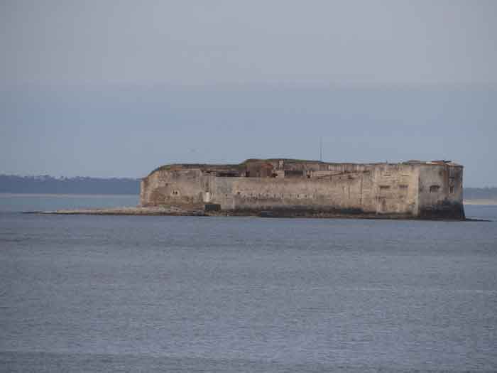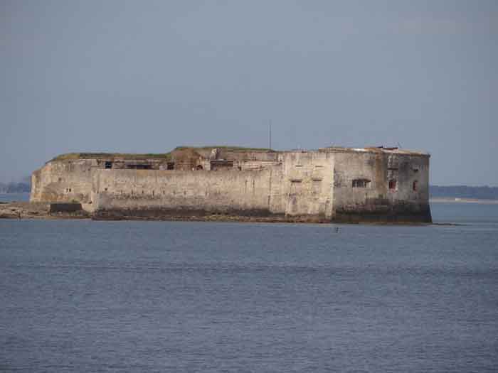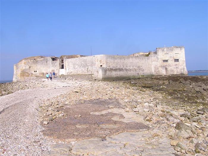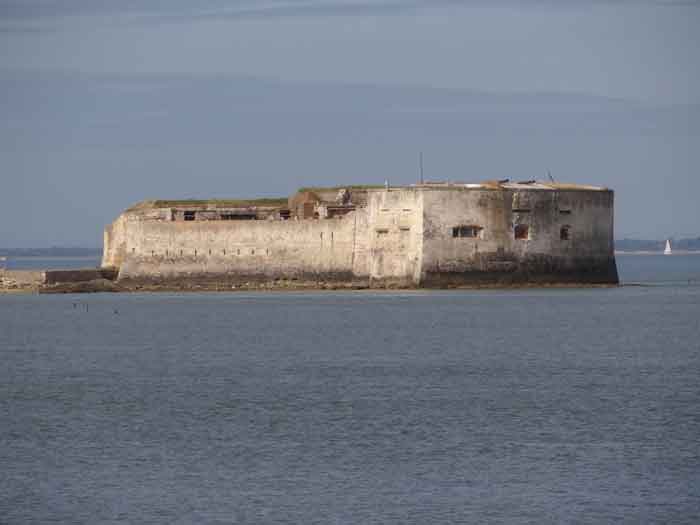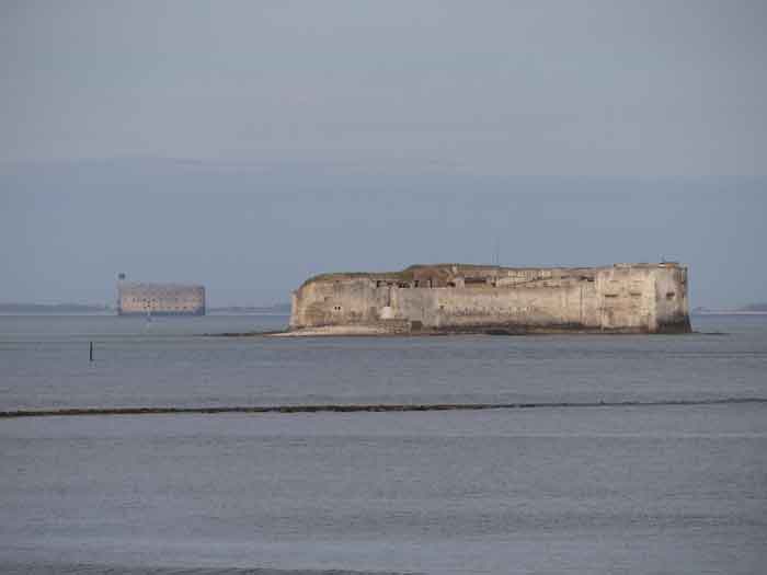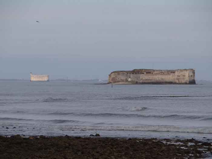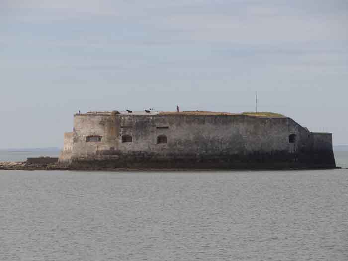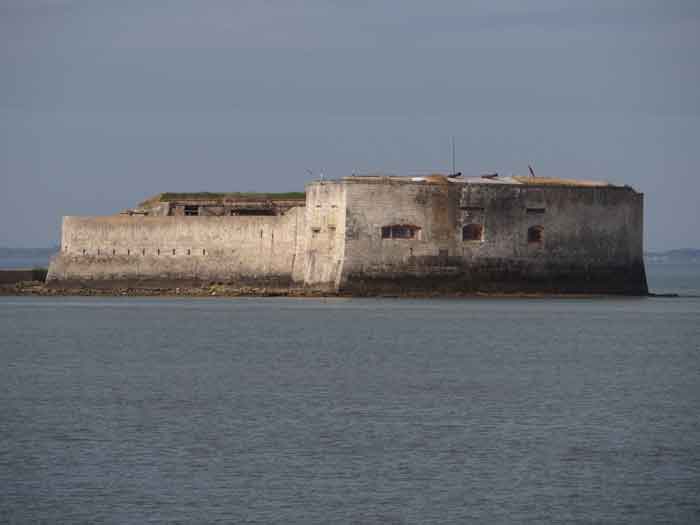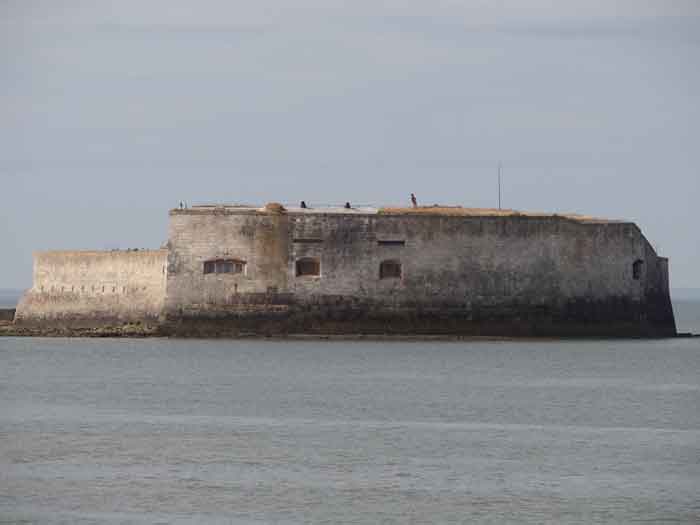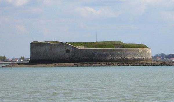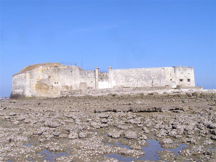 Place de Rochefort. Construit de 1809 à 1812 sur un îlot rocheux à l'embouchure de la Charente, il est joignable pédestrement à marée basse depuis la pointe de l'Aiguille. Il affecte la forme d'un demi-cercle avec une gorge rectiligne du centre de laquelle ressort une avancée triangulaire dans le flanc gauche de laquelle s'ouvre l'entrée. L'entrée franchie, on accède à une petite cour face aux quatre travées d'un bâtiment composé de chambrées et de magasins. Ces travées sont de longueurs inégales et, derrière les deux de droite est installé, perpendiculairement, le magasin à poudre. Ce dernier, à la voûte en plein cintre, comprend un seul créneau à lampe. Par la gauche de ces casemates, une galerie chicanée conduit à un parapet de tir épousant le tiers de l'escarpe frontale. À la droite de ces travées, quatre autres sur deux niveaux épousent la fin de la courbe du parapet. Le fort ayant servi de cible en 1863 et 1864 pour les tests de la nouvelle artillerie rayée, il sera réorganisé vers 1889. Au-dessus des quatre premières travées, seront disposées deux pièces de 27 c sur affûts P.A. qui croiseront leurs feux avec ceux de la batterie de Coudepont sur l'Île d'Aix. À droite de ces canons, deux autres de 19 c seront installés pour protéger la rade de la même île. En 1905, plates-formes et magasins seront bétonnés et deux batteries de petit calibre prendront place à l'arrière des locaux nord. Le premier magasin à poudre, élevé à la droite de l'entrée, a été conservé, mais le casernement initial a été rasé lors de la refonte de 1889. En 1888, l'État-major général le mentionnait comme "fort d'Énée". Propriété privée ; parfois ouverte au public.