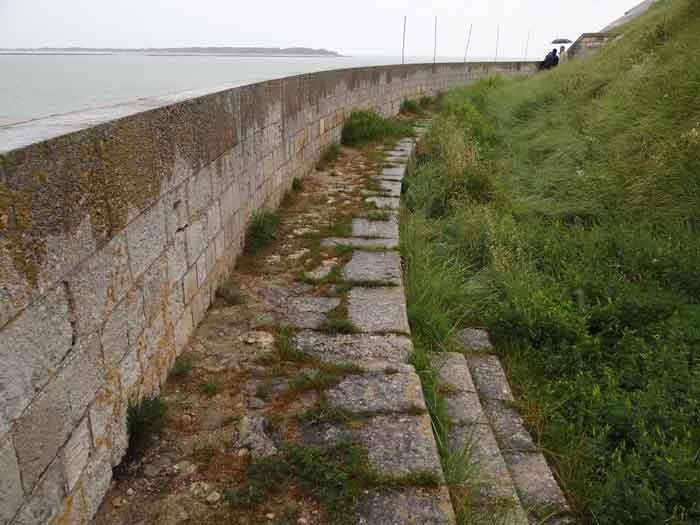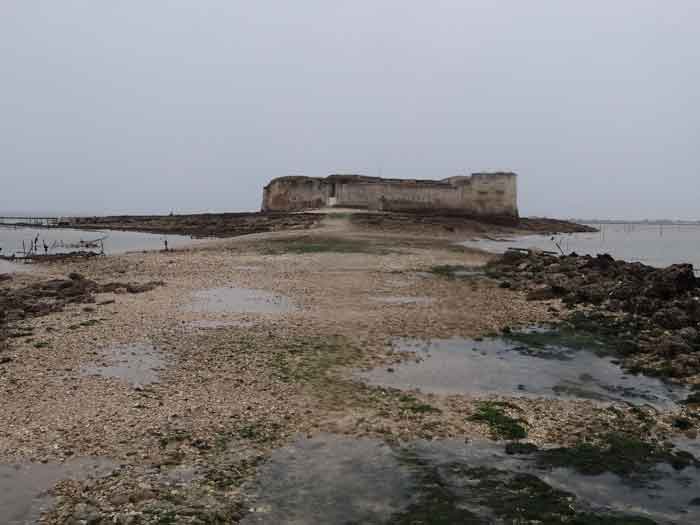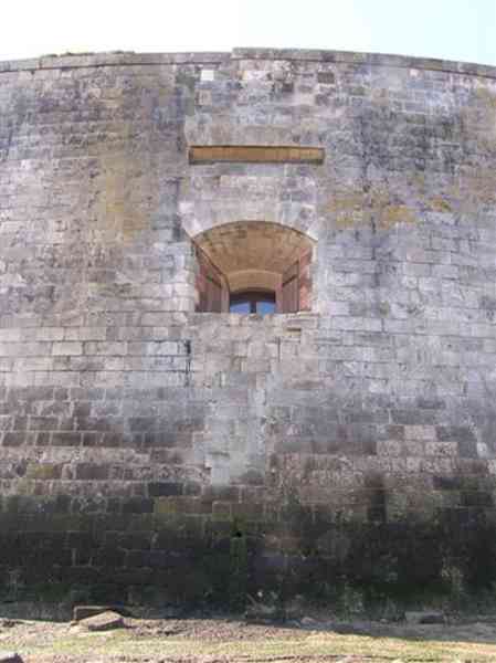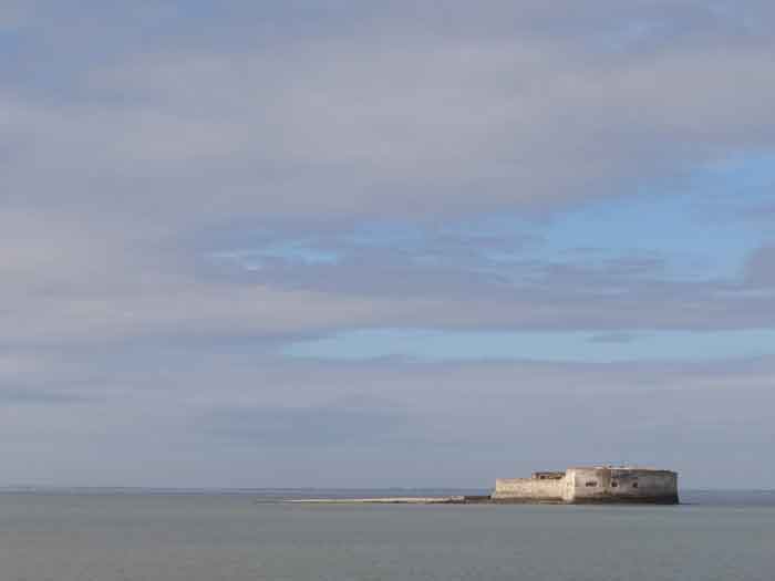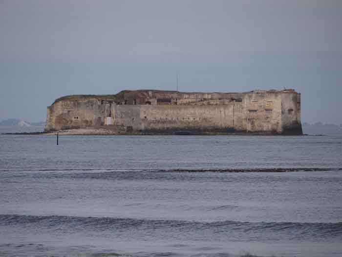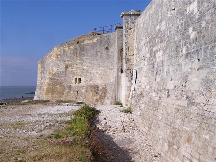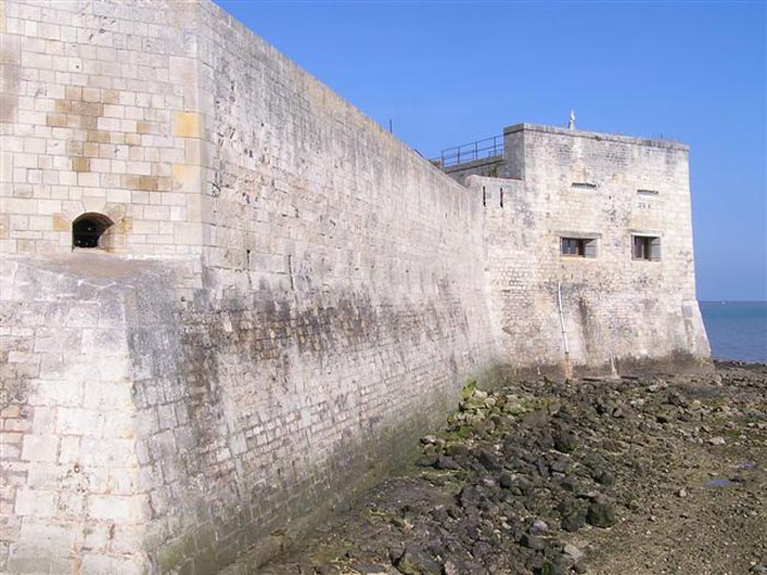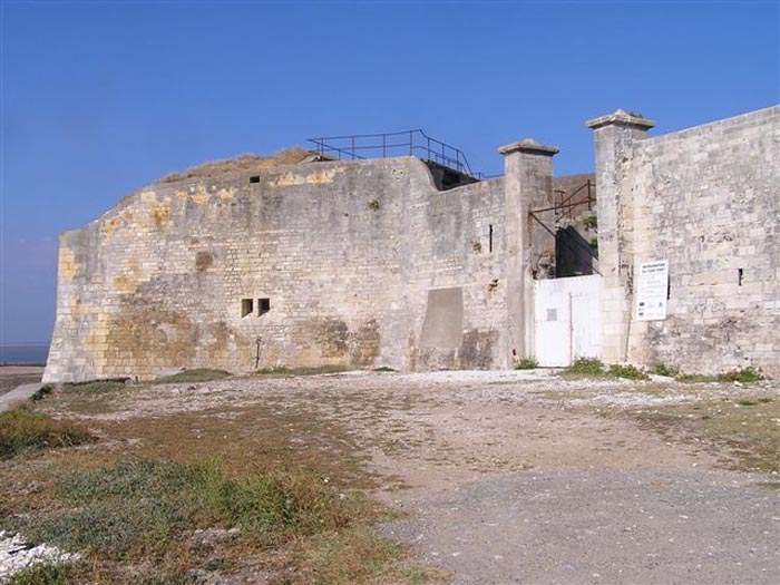 Festung von Rochefort. Erbaut von 1809 bis 1812 auf einem Felseneiland an der Mündung der Charente, ist es zu Fuß bei Ebbe von der Spitze der Aiguille aus erreichbar. Es weist die Form eines Halbkreises mit einer geradlinigen Kehle auf, aus deren Mitte sich ein dreieckiger Vorsprung erhebt, in dessen linker Flanke sich der Eingang öffnet. Nach dem Passieren des Eingangs gelangt man zu einem kleinen Hof, der vier Jochen eines Gebäudes gegenüberliegt, das aus Schlafsälen und Magazinen besteht. Diese Joche sind ungleich lang und hinter den beiden rechten ist, senkrecht dazu, das Pulvermagazin installiert. Letzteres, mit einem Tonnengewölbe, umfasst eine einzige Lampenscharte. Links von diesen Kasematten führt ein gekrümmter Gang zu einer Schießbrust, die ein Drittel der Frontalerde einnimmt. Rechts von diesen Jochen folgen vier weitere auf zwei Ebenen dem Ende der Brustwehrkurve. Da das Fort 1863 und 1864 als Ziel für Tests der neuen gezogenen Artillerie diente, wird es um 1889 reorganisiert. Über den ersten vier Jochen werden zwei Geschütze 27 c auf P.A.-Lafetten angeordnet, die ihr Feuer mit dem der Batterie von Coudepont auf der Insel Aix kreuzen. Rechts von diesen Kanonen werden zwei weitere 19-c-Geschütze installiert, um die Reede derselben Insel zu schützen. 1905 werden Plattformen und Magazine betoniert und zwei Batterien kleinen Kalibers werden hinter den nördlichen Räumen platziert. Das erste Pulvermagazin, errichtet rechts vom Eingang, wurde erhalten, aber die ursprüngliche Unterkunft wurde während des Umbaus von 1889 abgerissen. 1888 wurde es vom Generalstab als "Fort d'Énée" erwähnt. Privatbesitz; manchmal für die Öffentlichkeit zugänglich.