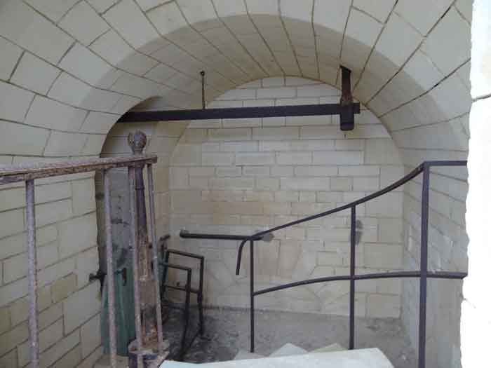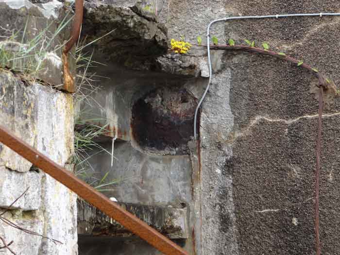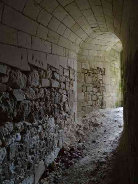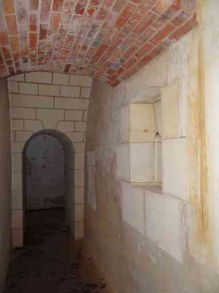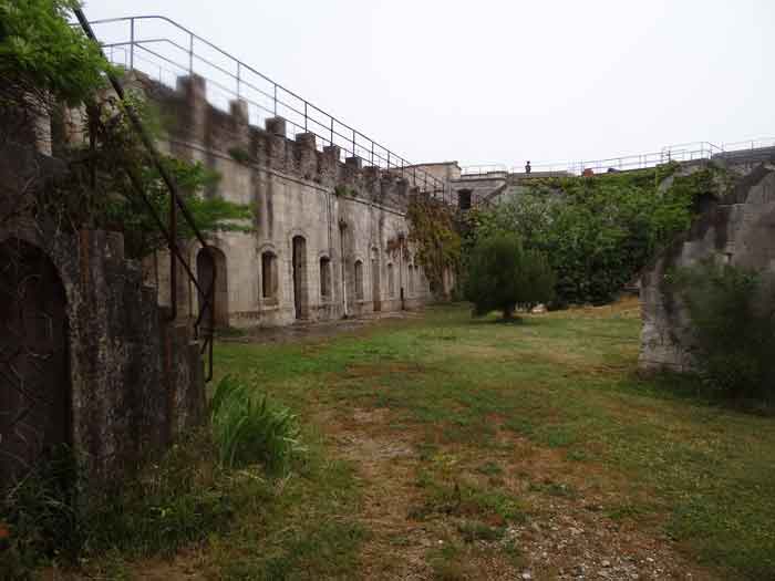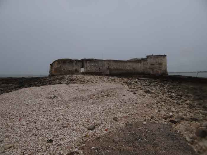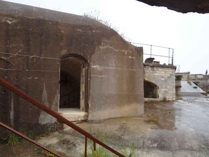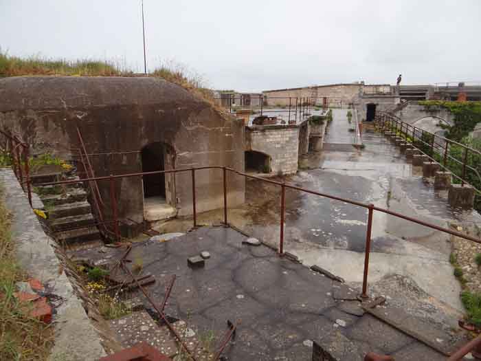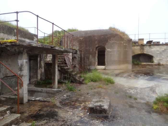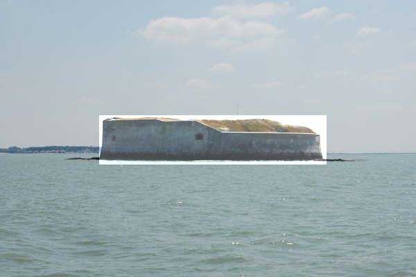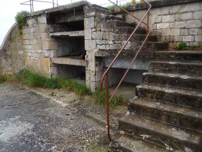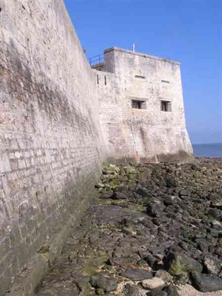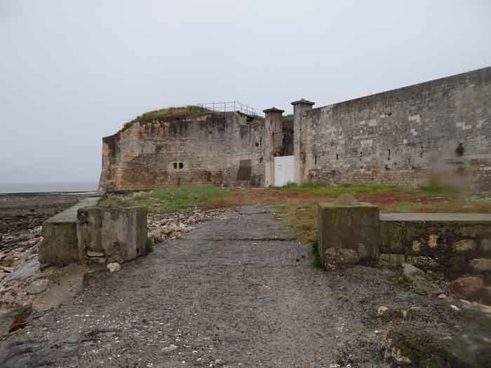 Fortress of Rochefort. Built from 1809 to 1812 on a rocky islet at the mouth of the Charente, it is reachable on foot at low tide from the tip of the Aiguille. It takes the form of a semi-circle with a straight gorge from the center of which projects a triangular advance in whose left flank the entrance opens. Once the entrance is passed, one accesses a small courtyard facing the four bays of a building composed of quarters and magazines. These bays are of unequal length and, behind the two on the right, the powder magazine is installed, perpendicularly. The latter, with a barrel vault, comprises a single lamp embrasure. To the left of these casemates, a zigzagging gallery leads to a firing parapet following one third of the frontal scarp. To the right of these bays, four others on two levels follow the end of the parapet's curve. The fort having served as a target in 1863 and 1864 for tests of the new rifled artillery, it will be reorganized around 1889. Above the first four bays, two 27 c pieces on P.A. mounts will be arranged to cross their fire with that of the Coudepont battery on Aix Island. To the right of these guns, two others of 19 c will be installed to protect the roadstead of the same island. In 1905, platforms and magazines will be concreted and two small caliber batteries will take place behind the northern rooms. The first powder magazine, built to the right of the entrance, has been preserved, but the initial barracks were razed during the 1889 overhaul. In 1888, the General Staff mentioned it as "Fort d'Énée". Private property; sometimes open to the public.